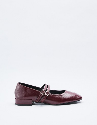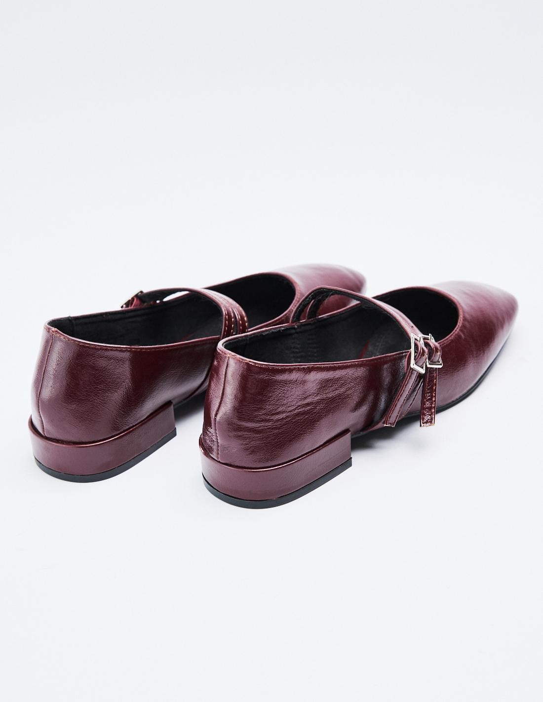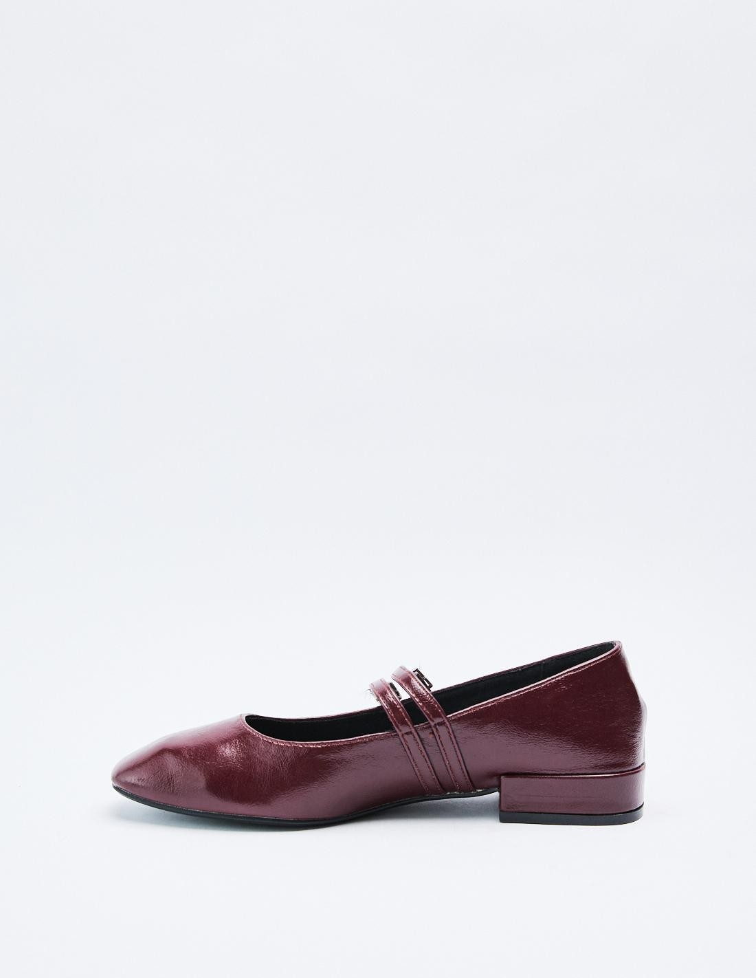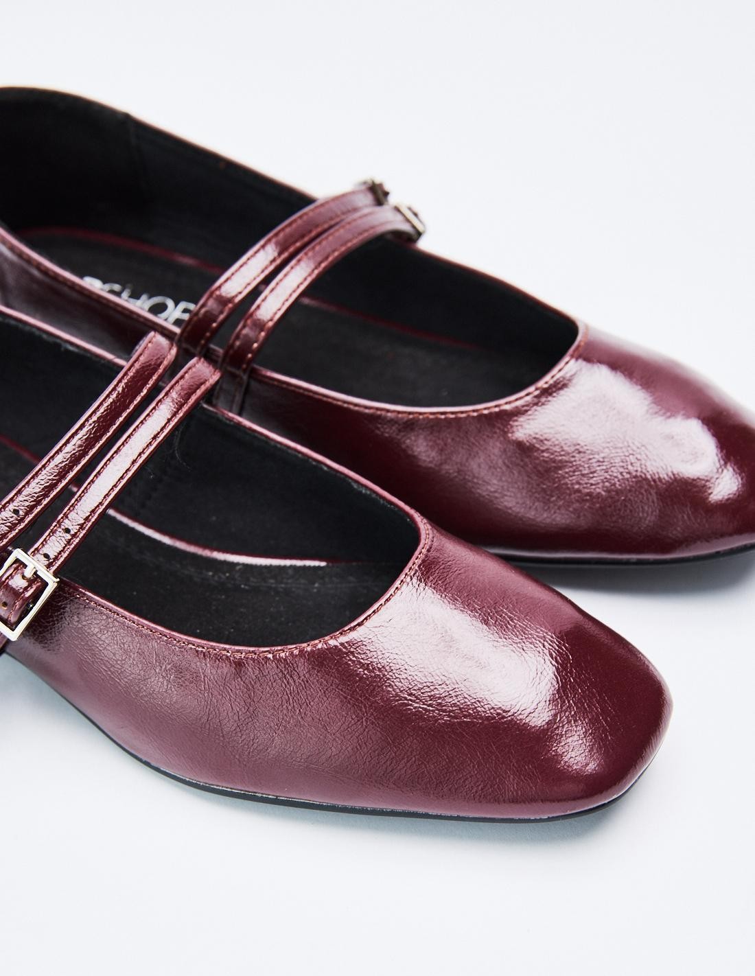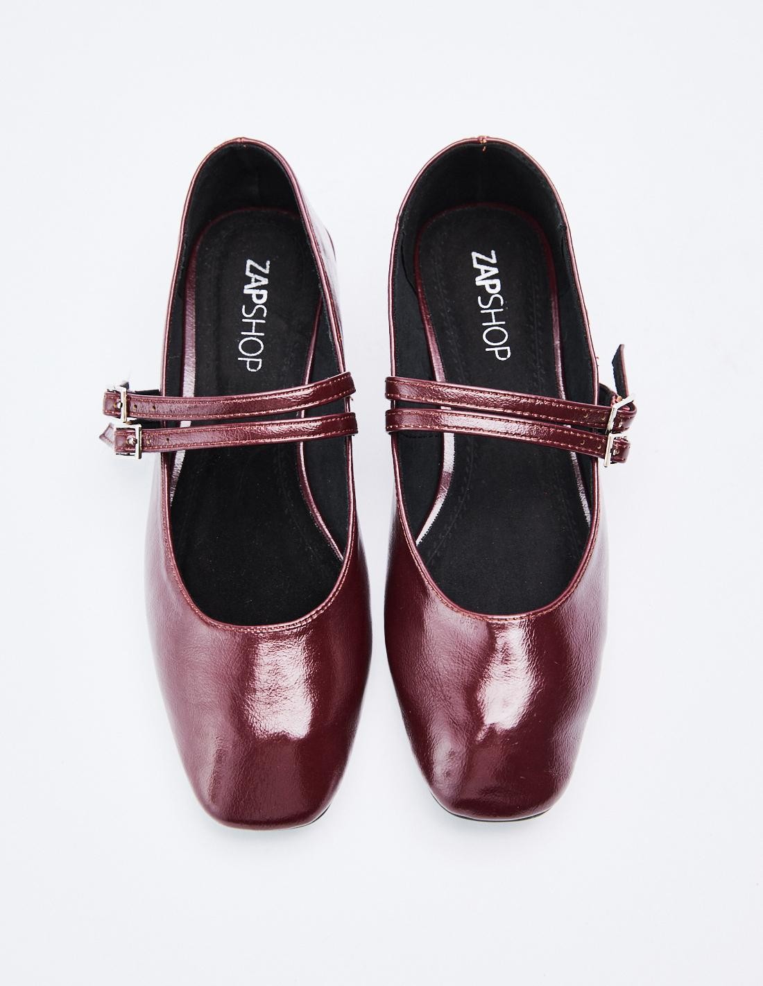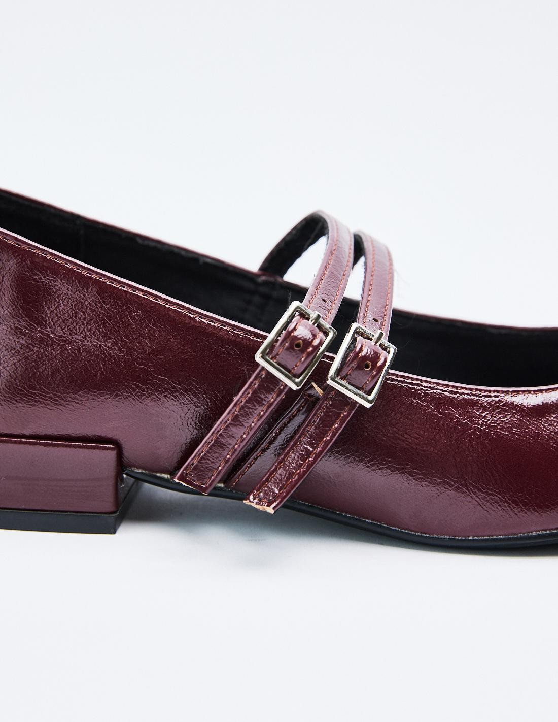 Zapato tipo bailarina efecto charol . Detalle de tiras finas con hebilla ajustable en el empeine.