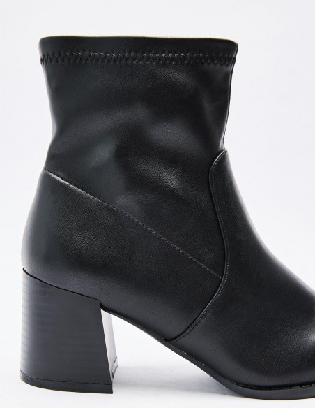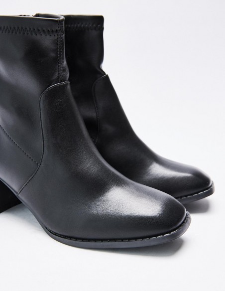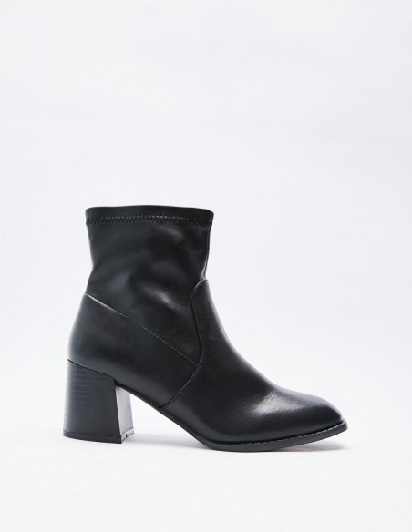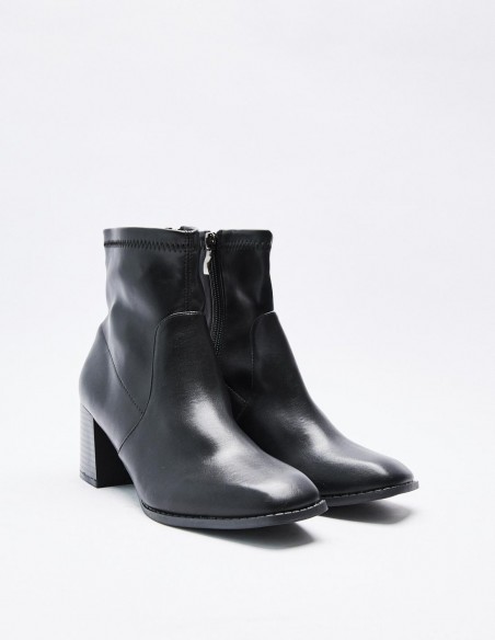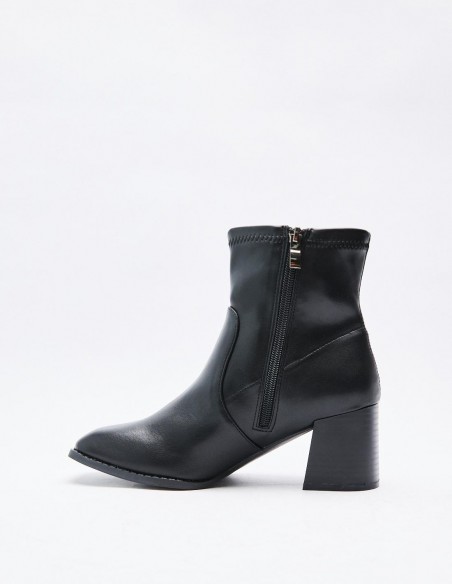 Zapato tipo botín con tacón. Detalle de pespunte en el corte. Cierre mediante cremallera lateral. Tacón alto en bloque. Acabado en punta. Altura de la suela: 6,5 cm