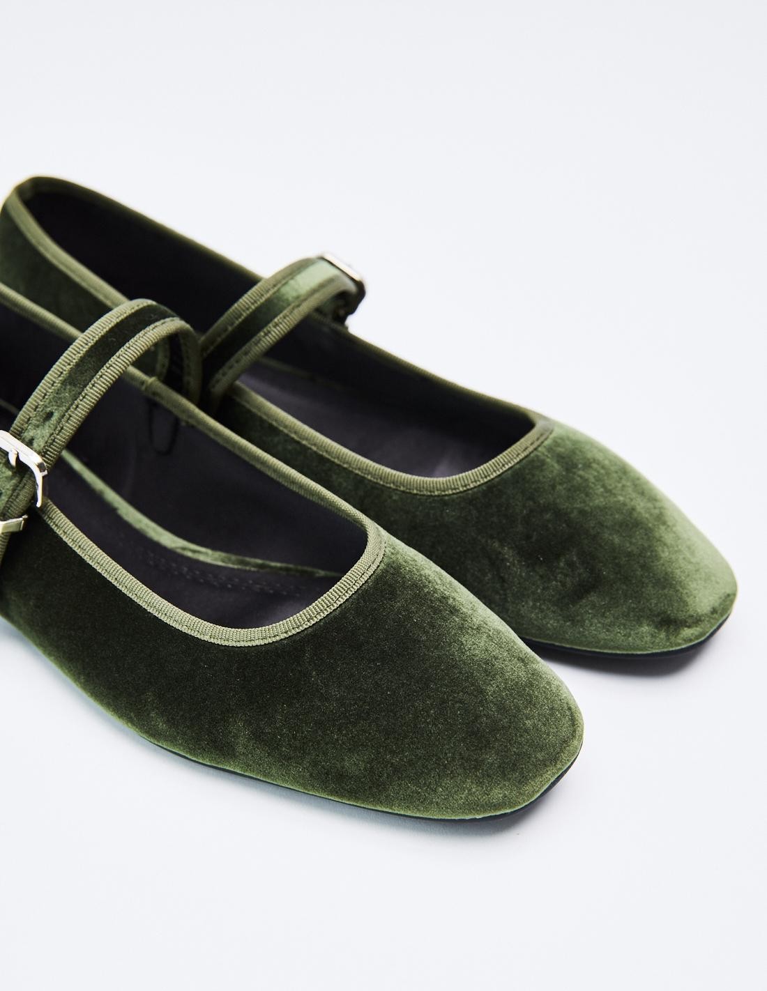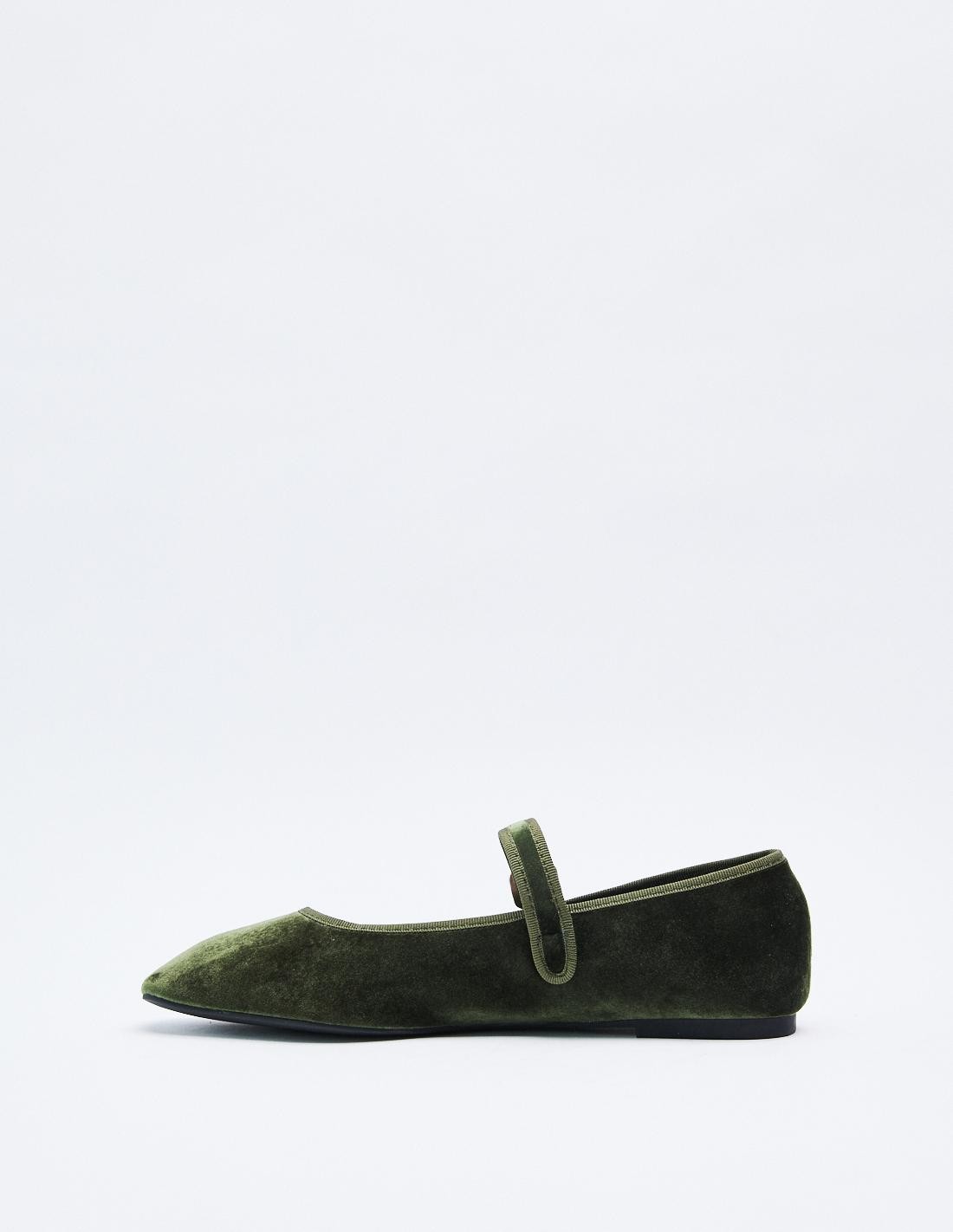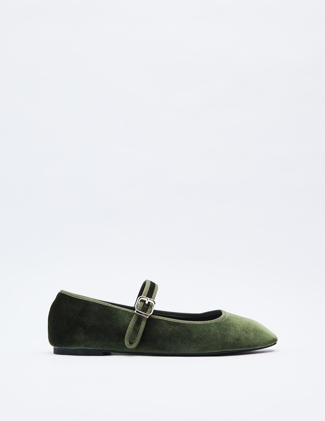 Zapato tipo bailarina en efecto terciopelo. Tira con hebilla en la parte delantera. Acabado en punta. Altura de la suela: 0,5 cm