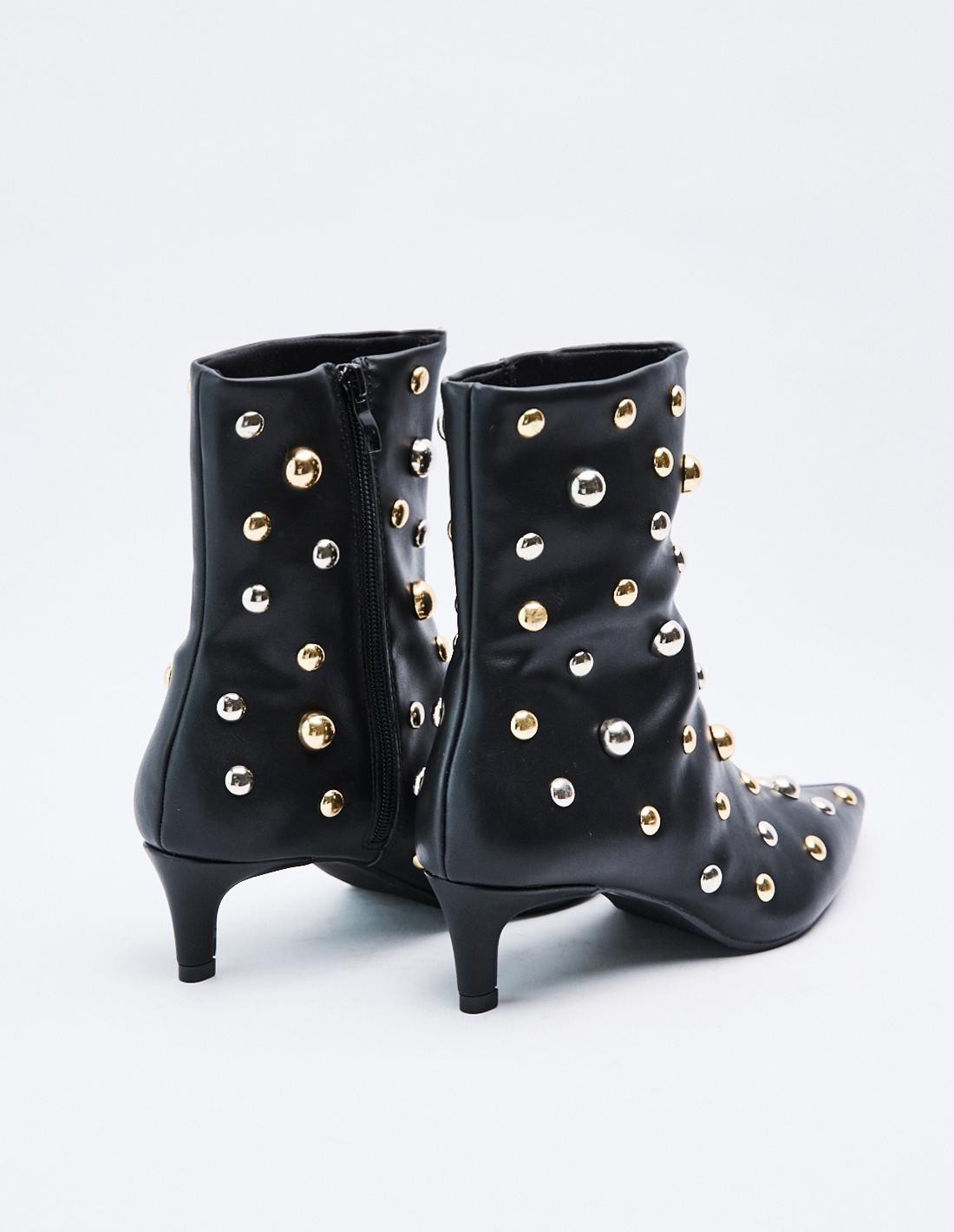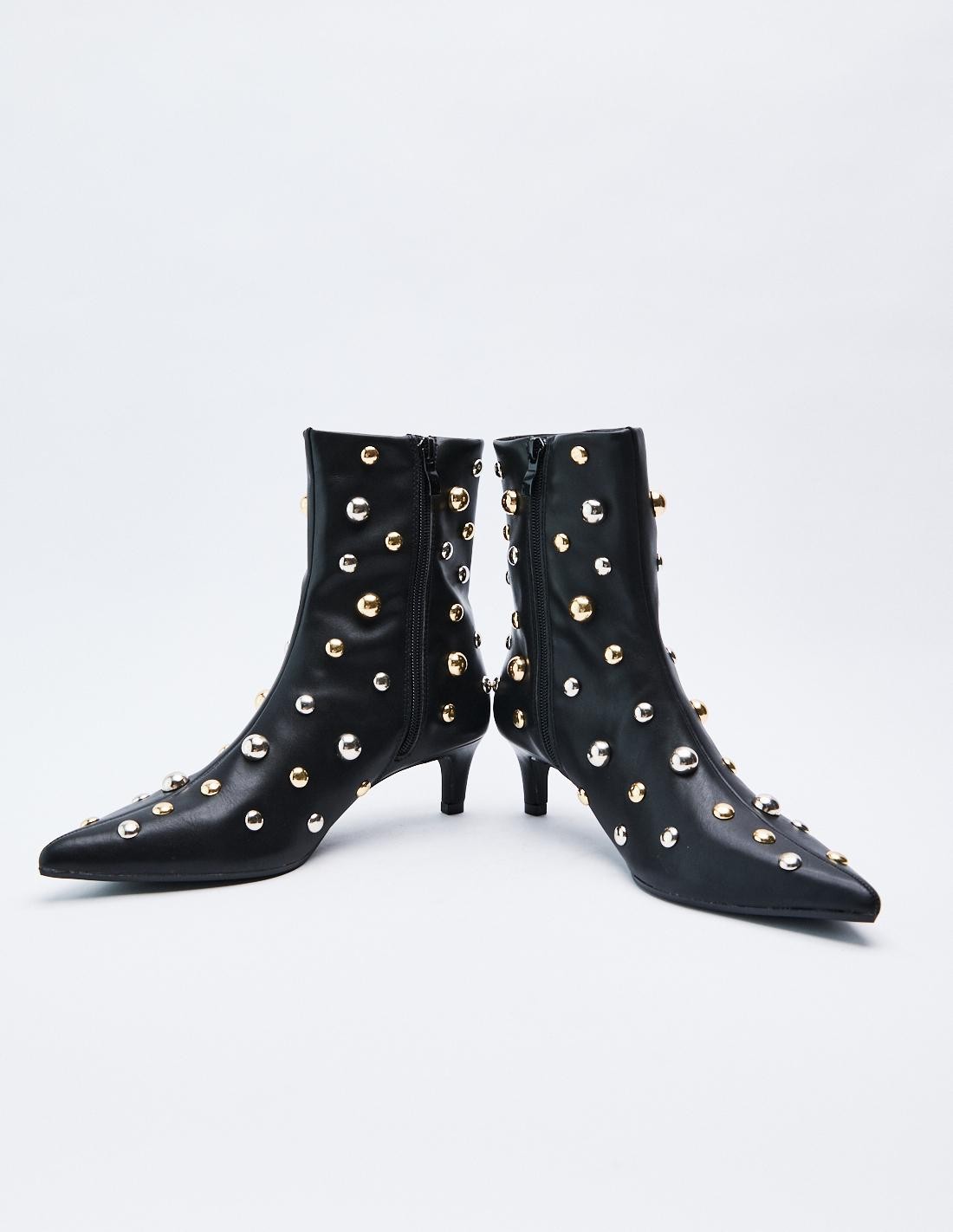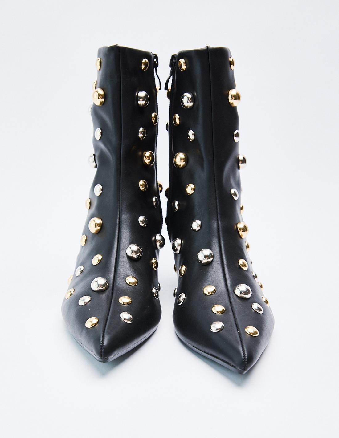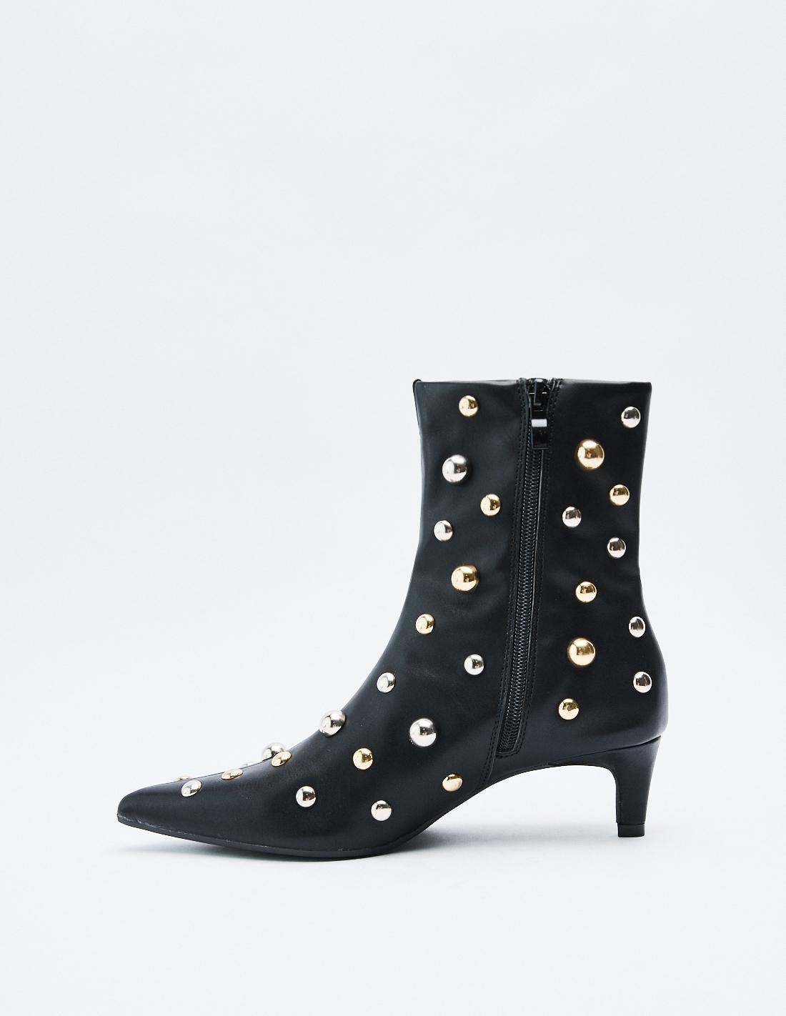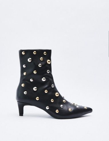 Zapato plano tipo botín en efecto piel en combinacion de materiales . Detalle de borlas metalicas en todo el zapato. Altura de la suela: 5 cm.