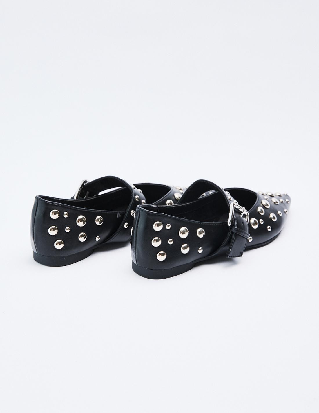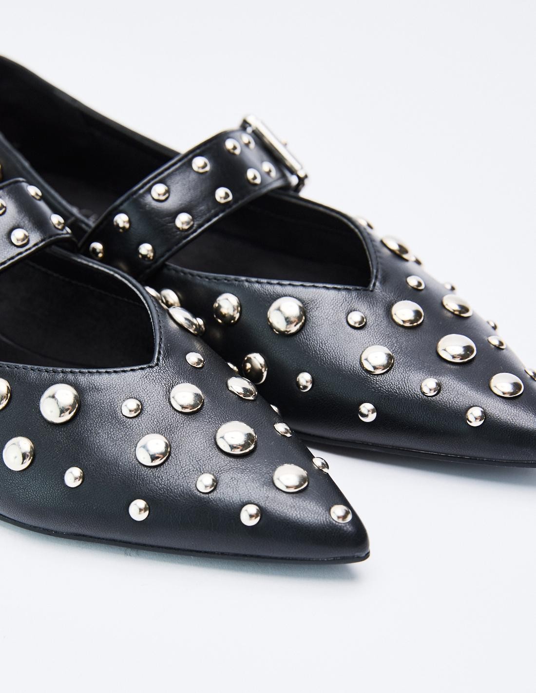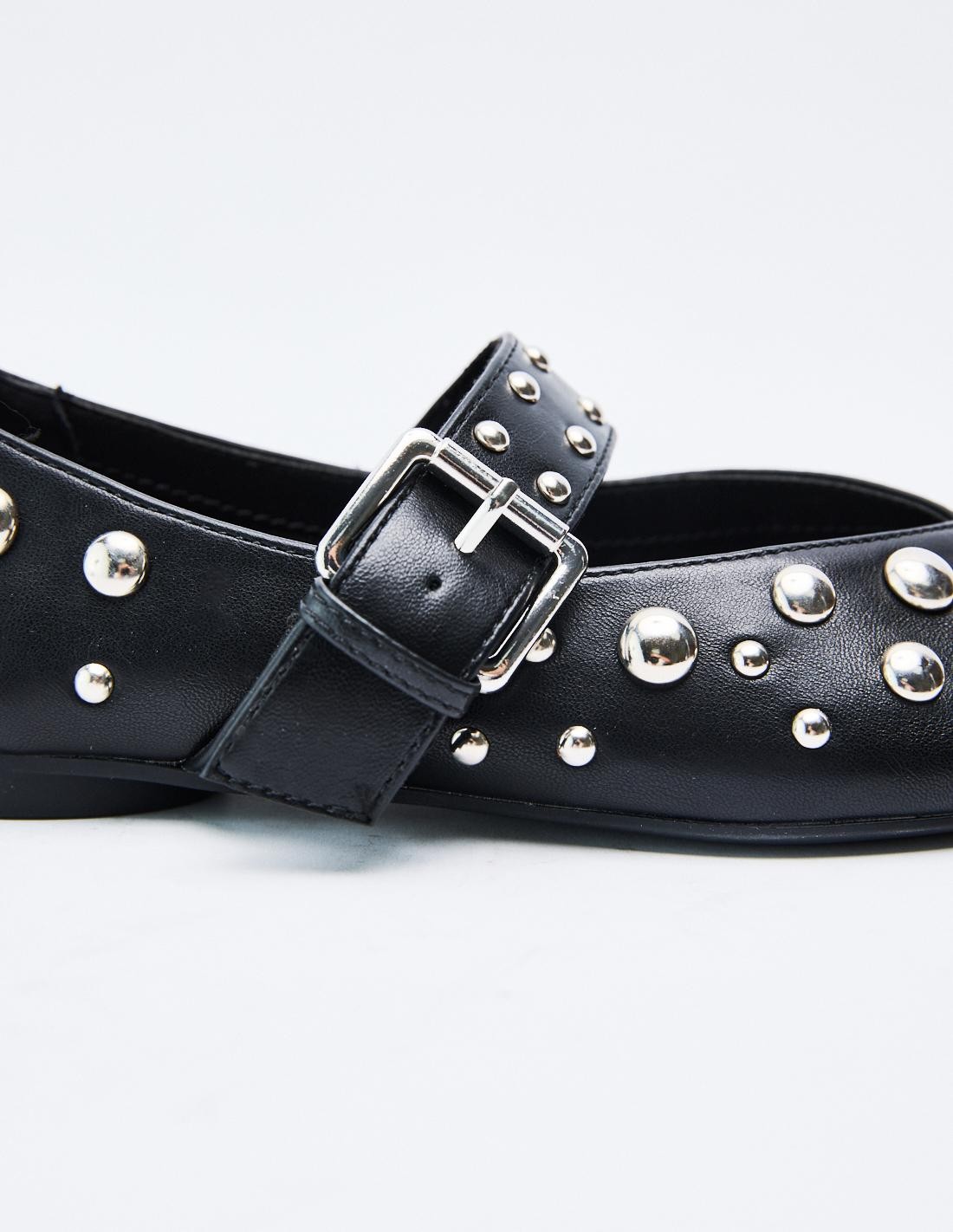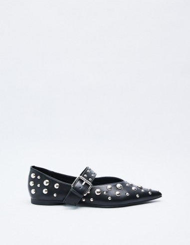 Zapato plano tipo bailarina en combinacion de materiales . Detalle de tira ancha con hebilla ajustable en la parte delantera. Altura de la suela: 1 cm.