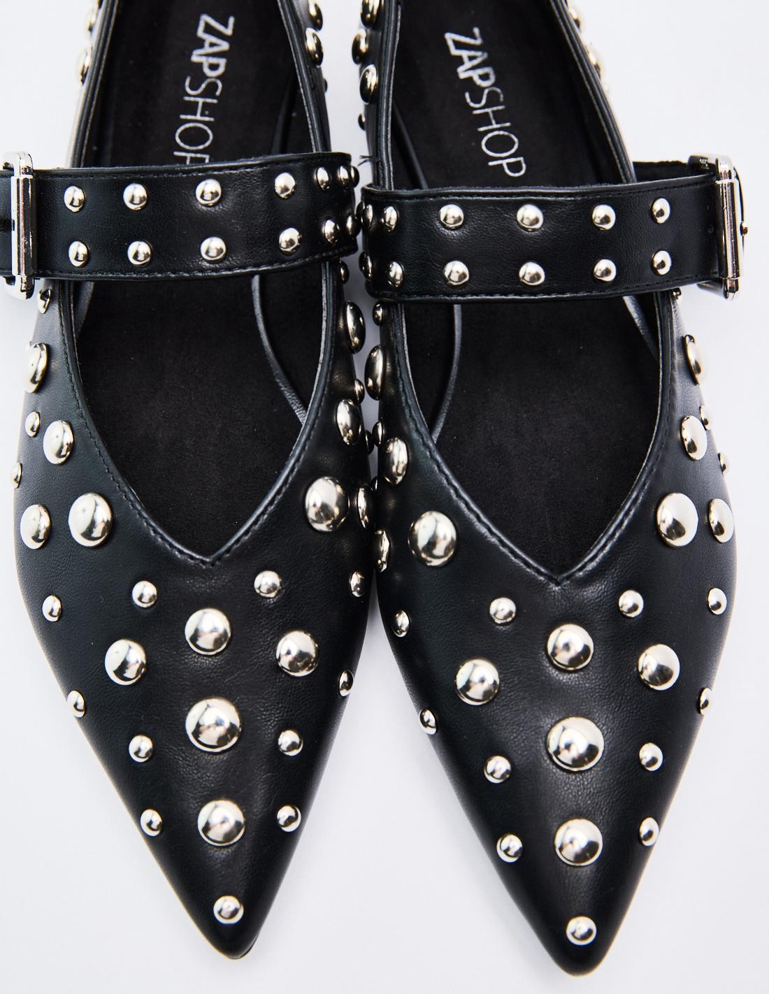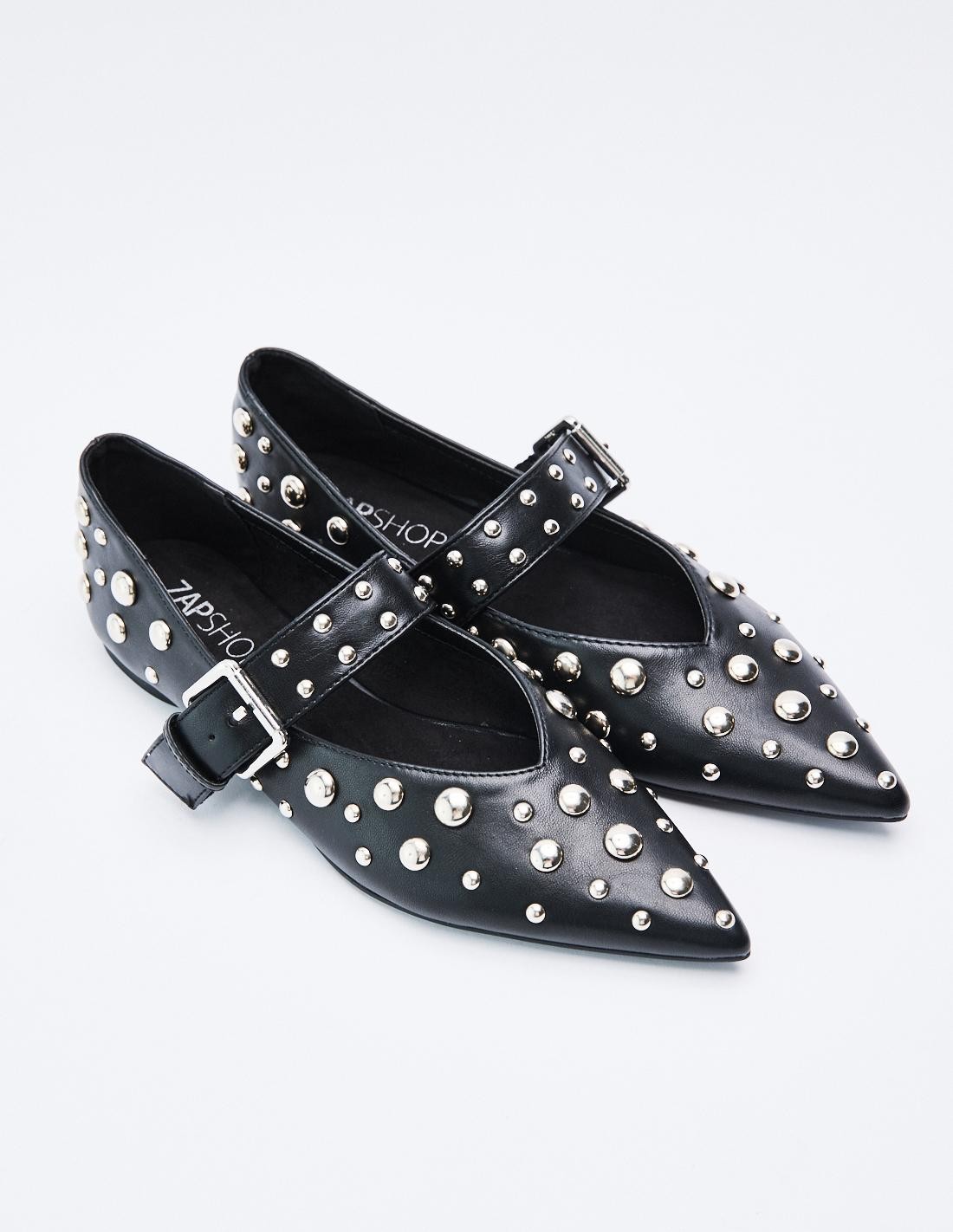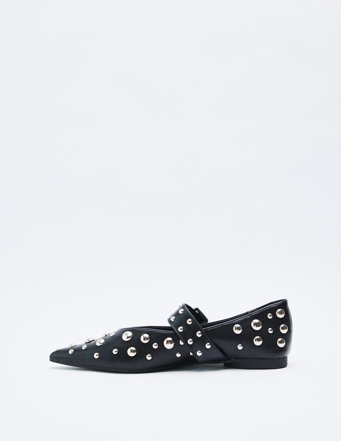 Zapato plano tipo bailarina en combinacion de materiales . Detalle de tira ancha con hebilla ajustable en la parte delantera. Altura de la suela: 1 cm.