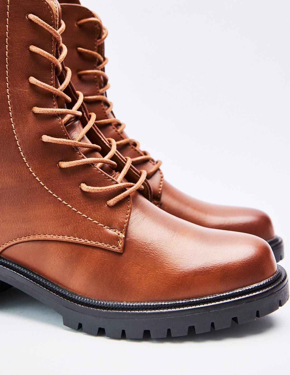 Zapato tipo botín en efecto piel. Suela plana.Tirador trasero. Cierre mediante cordones y cremallera lateral. Acabado en punta redonda.