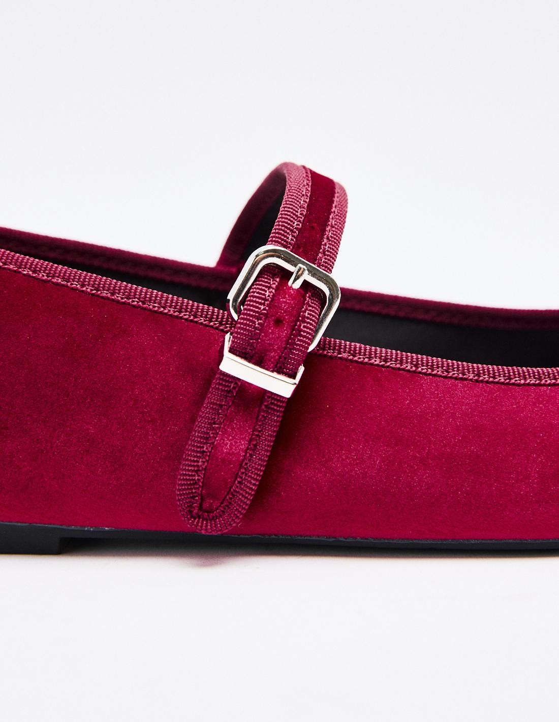 Zapato tipo bailarina en efecto terciopelo. Tira con hebilla en la parte delantera. Acabado en punta. Altura de la suela: 0,5 cm