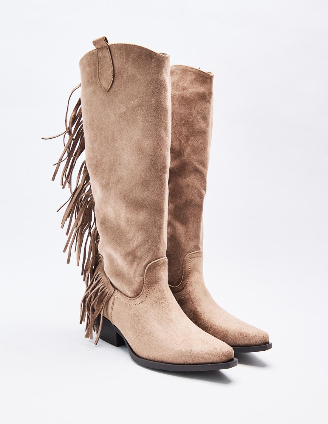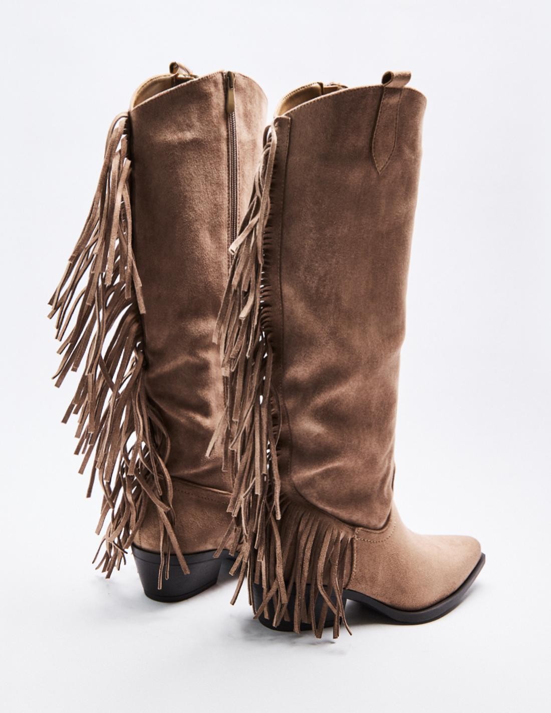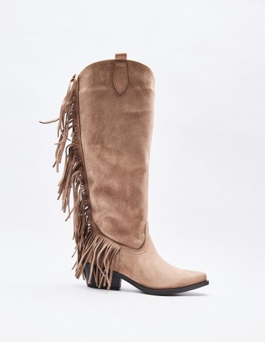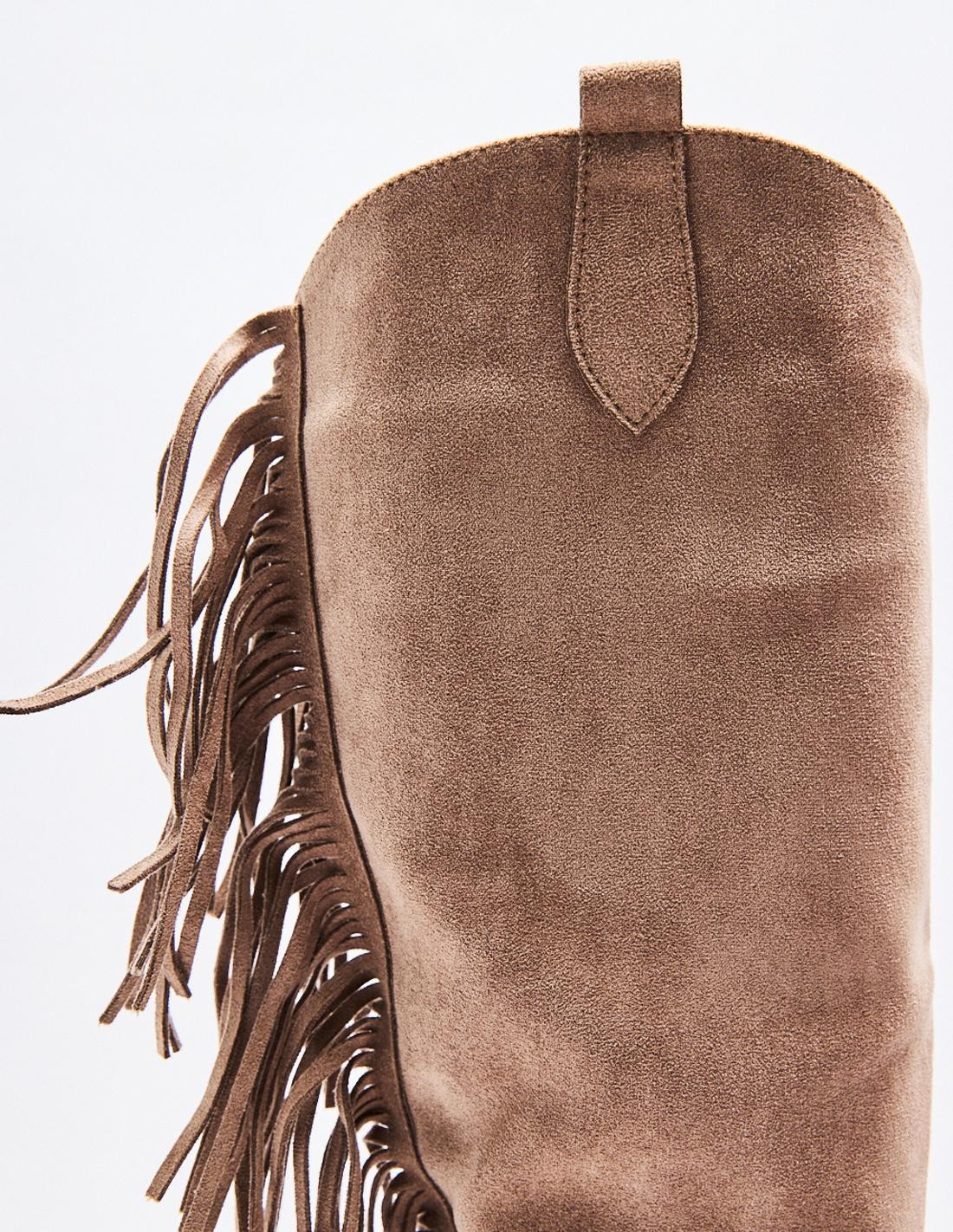 Zapato tipo bota tacón de efecto serraje con detalles de flecos . Tacón ancho. Tiradores laterales. Acabado en punta. Cierre mediante cremallera en los laterals. Altura tacón: 5 cm