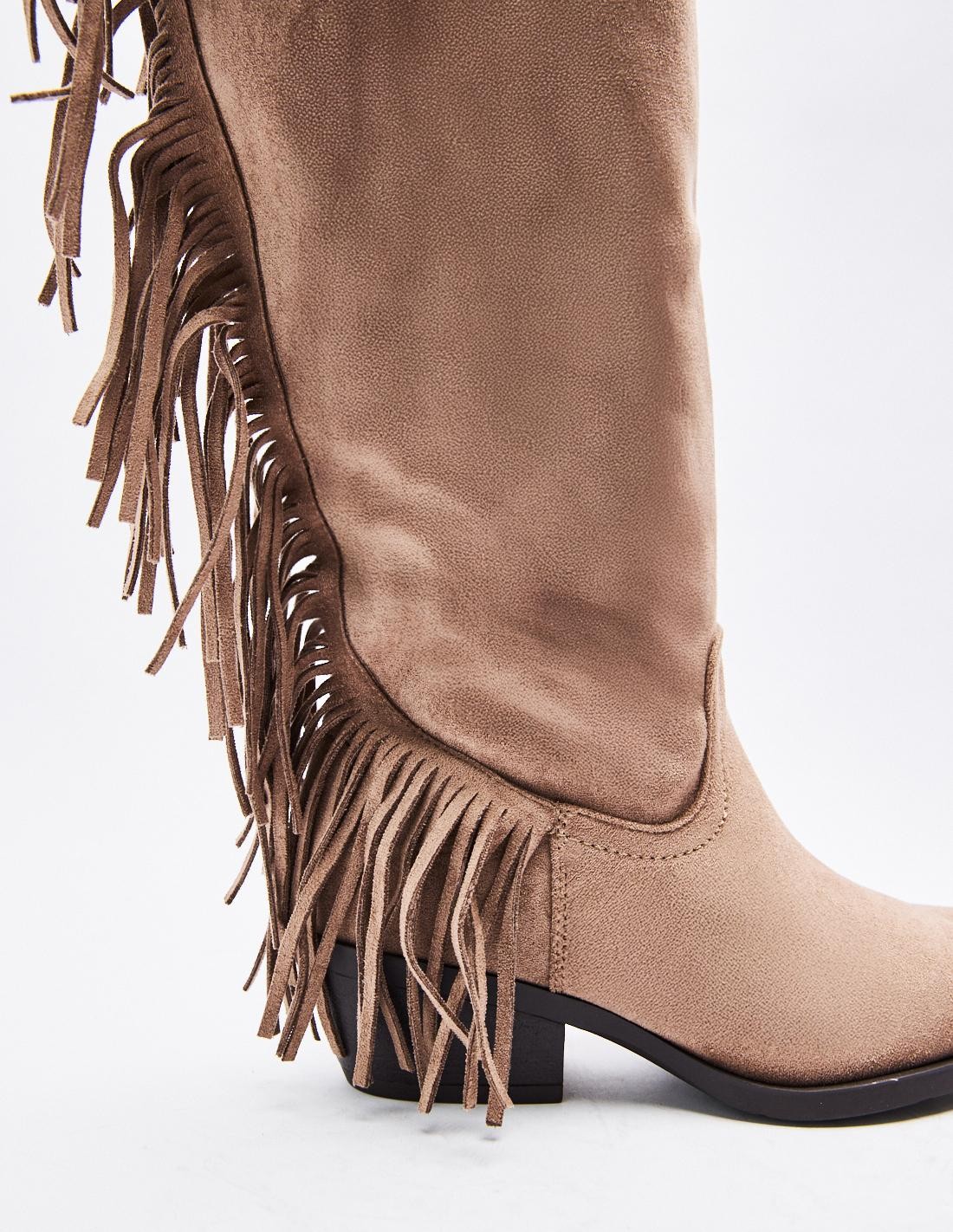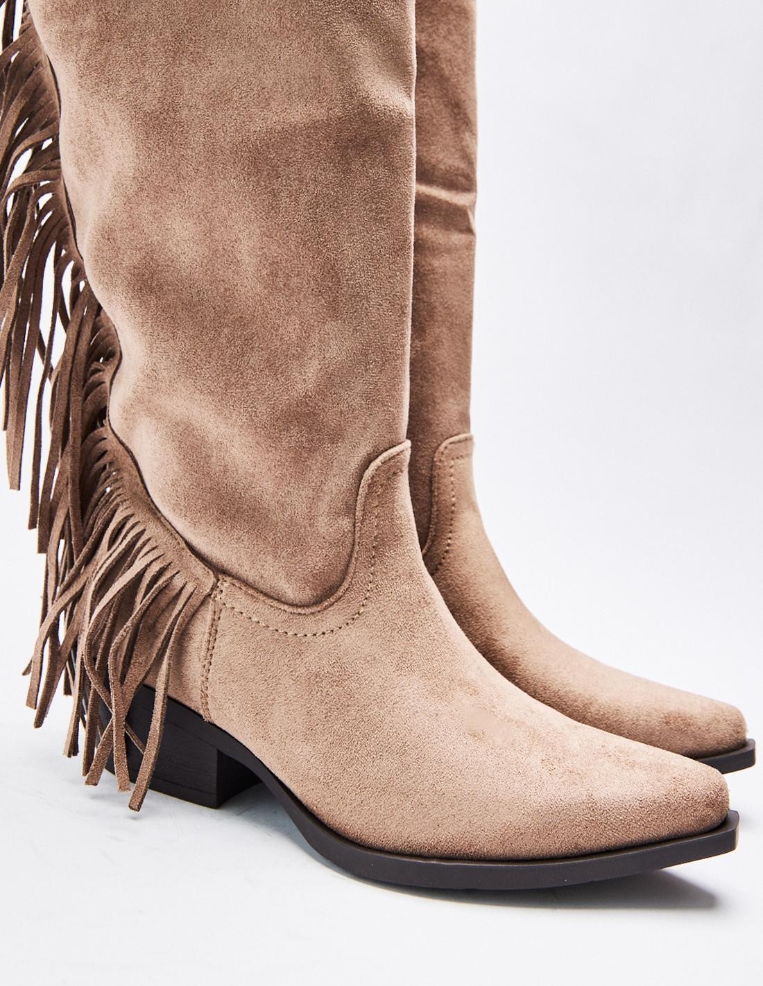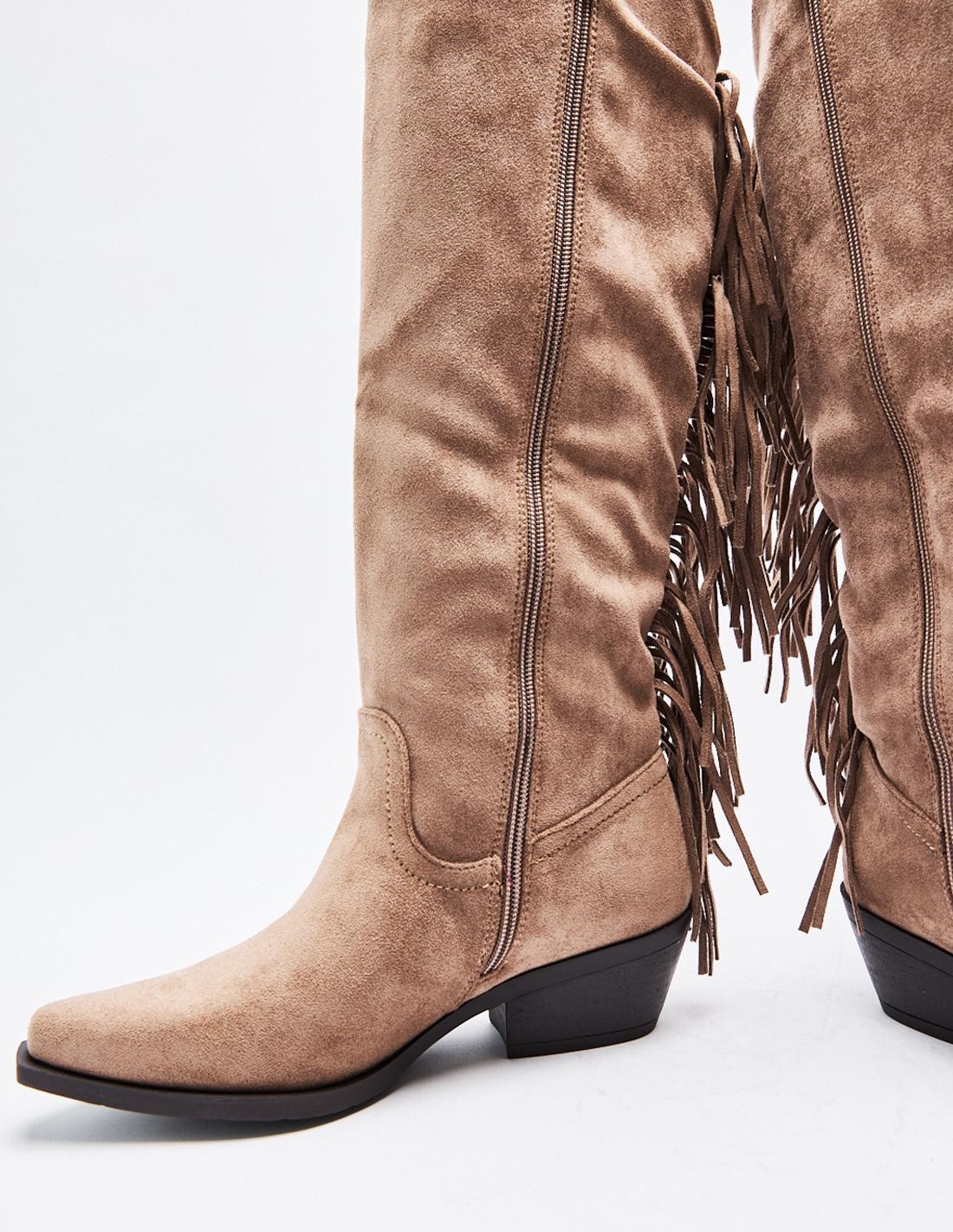 Zapato tipo bota tacón de efecto serraje con detalles de flecos . Tacón ancho. Tiradores laterales. Acabado en punta. Cierre mediante cremallera en los laterals. Altura tacón: 5 cm