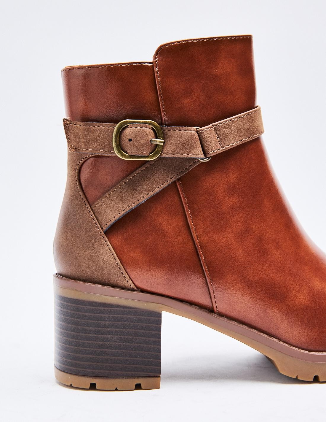 Zapato tipo botín con tacón alto en bloque. Detalle de tira con hebilla. Detalle de pespunte en el cuerpo. Acabado en punta. Cierre mediante cremallera en los laterales.