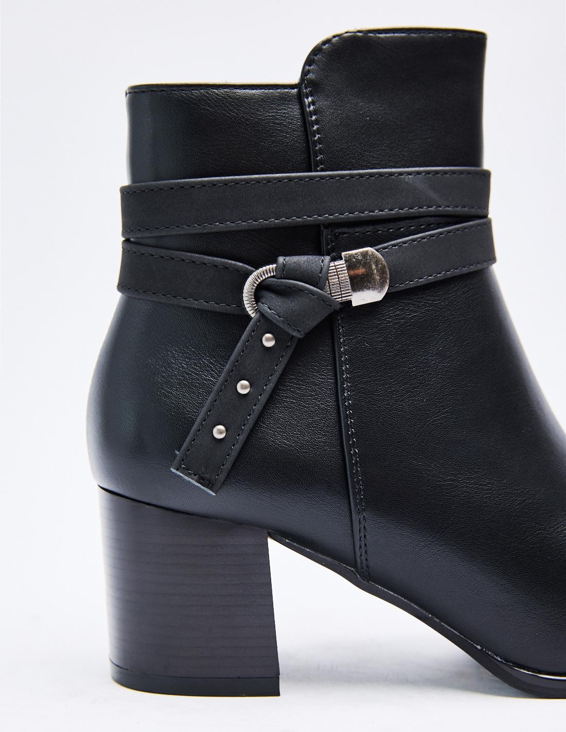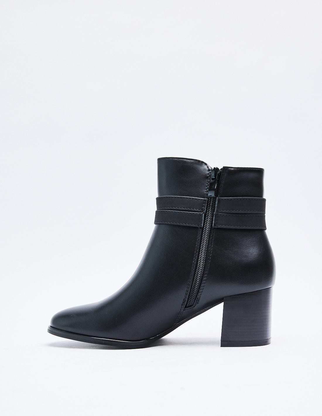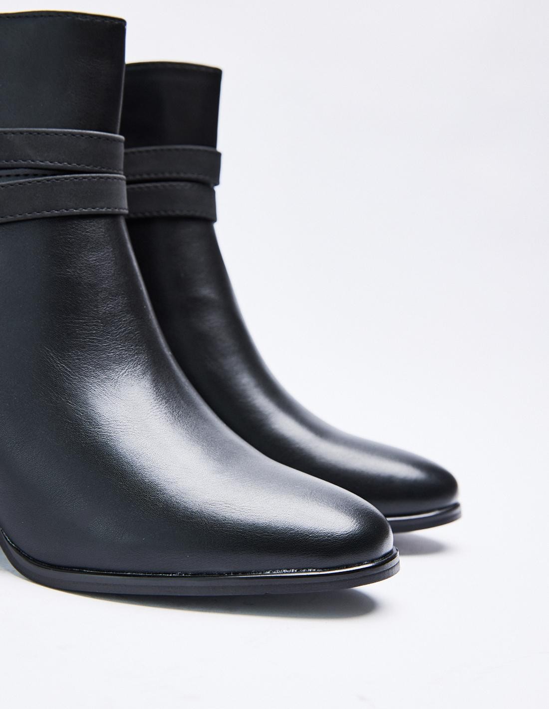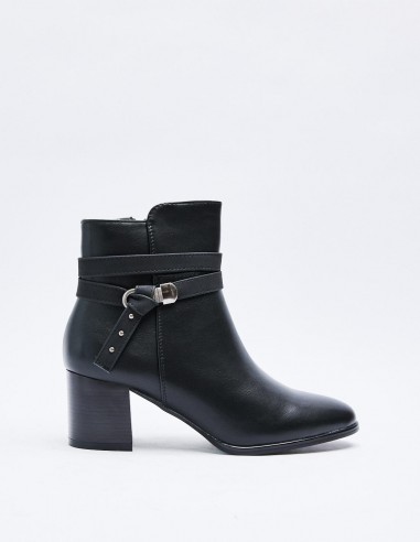 Zapato tipo botín con tacón alto en bloque. Detalle de tira con hebilla. Detalle de pespunte en el cuerpo. Acabado en punta. Cierre mediante cremallera en los laterales. Altura del tacón: 6 cm