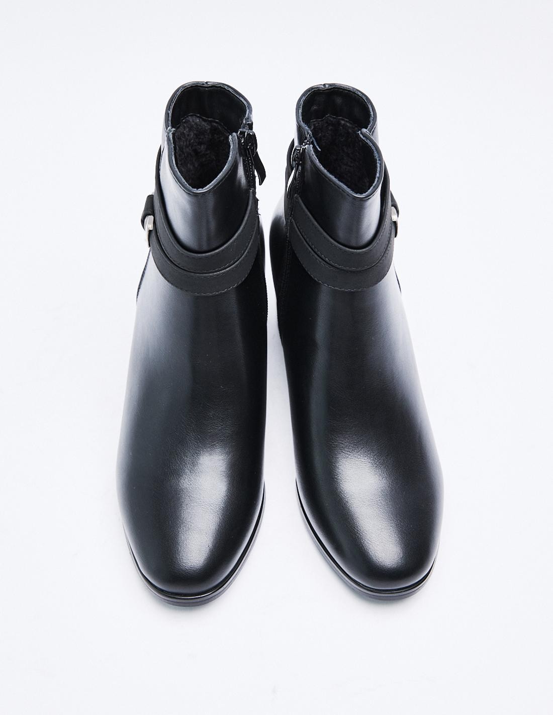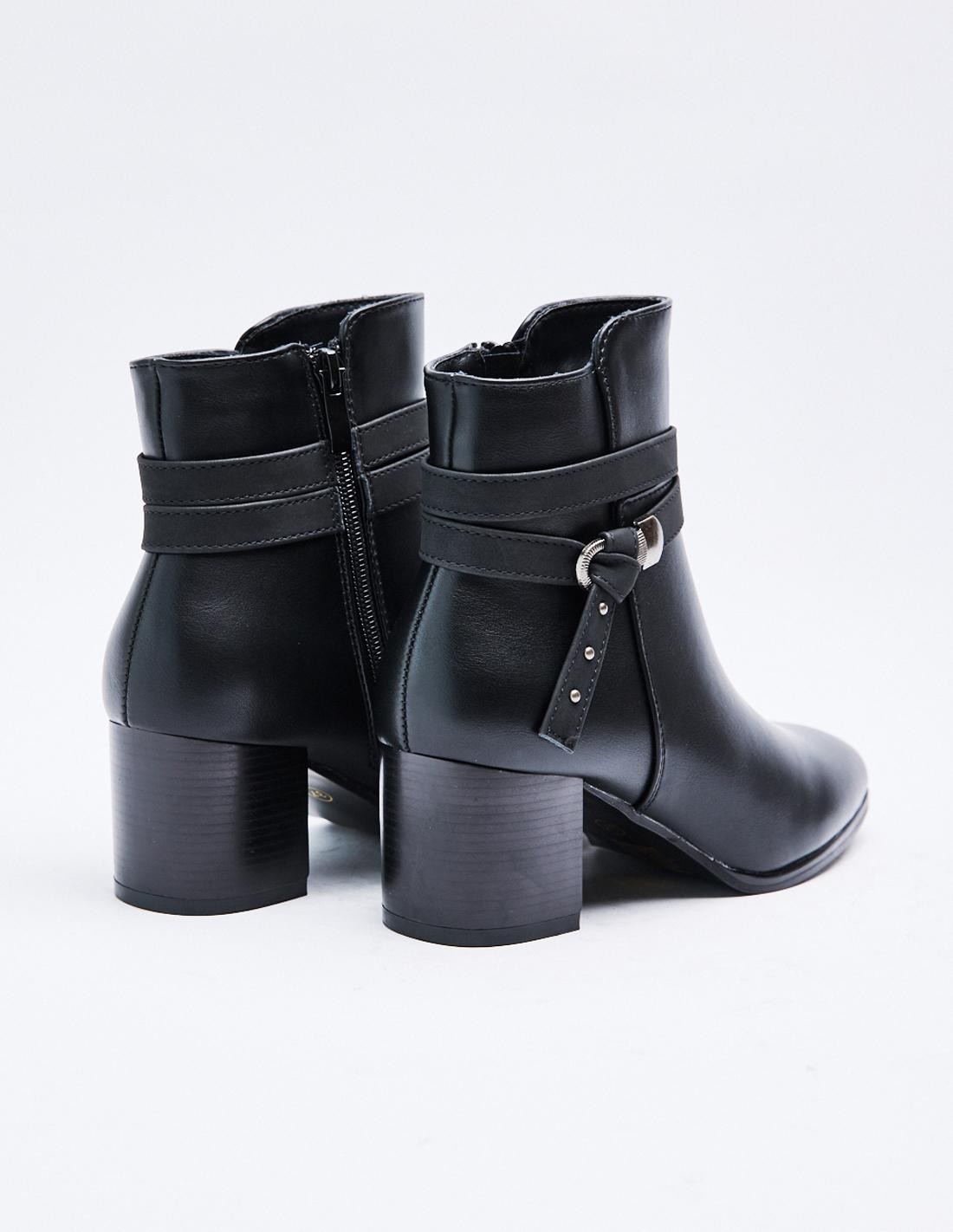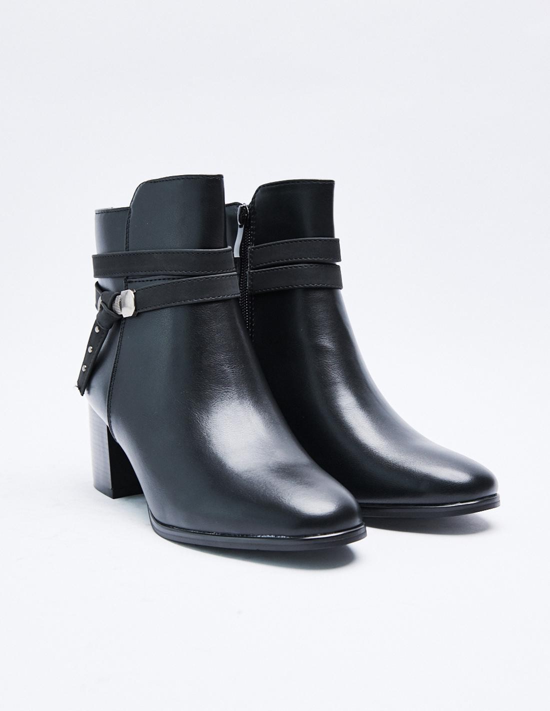 Zapato tipo botín con tacón alto en bloque. Detalle de tira con hebilla. Detalle de pespunte en el cuerpo. Acabado en punta. Cierre mediante cremallera en los laterales. Altura del tacón: 6 cm