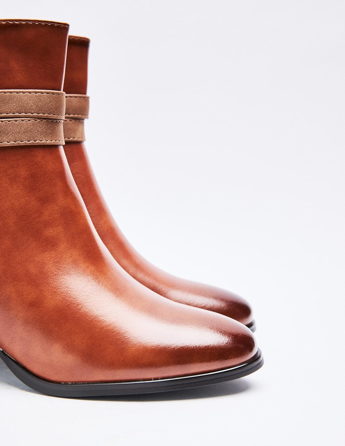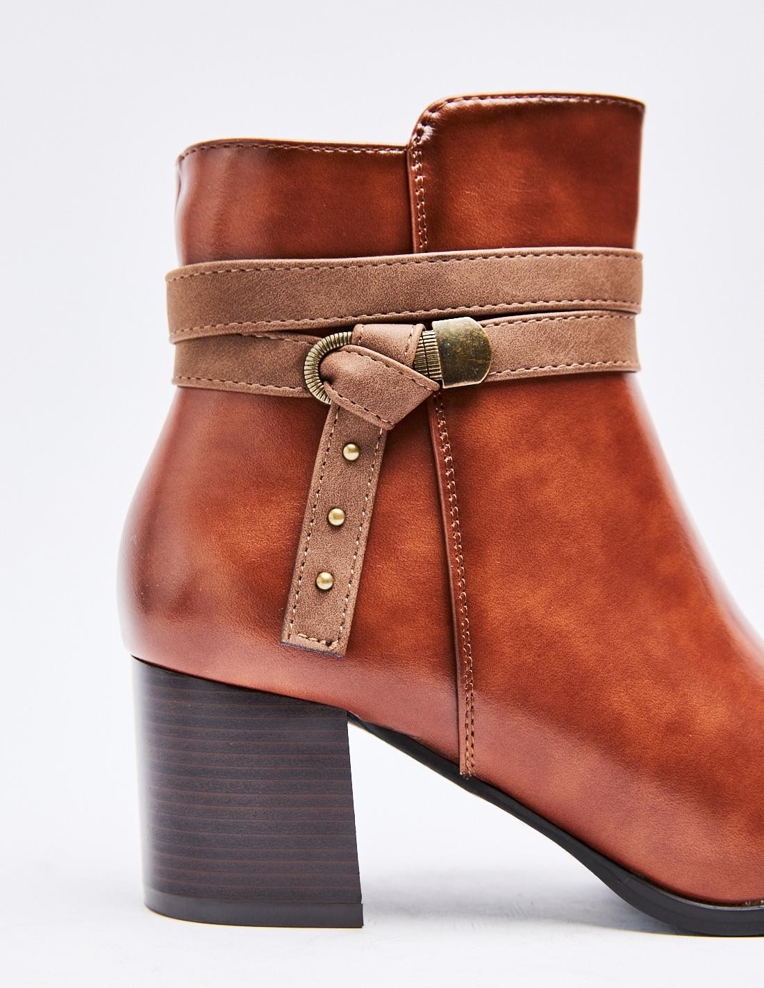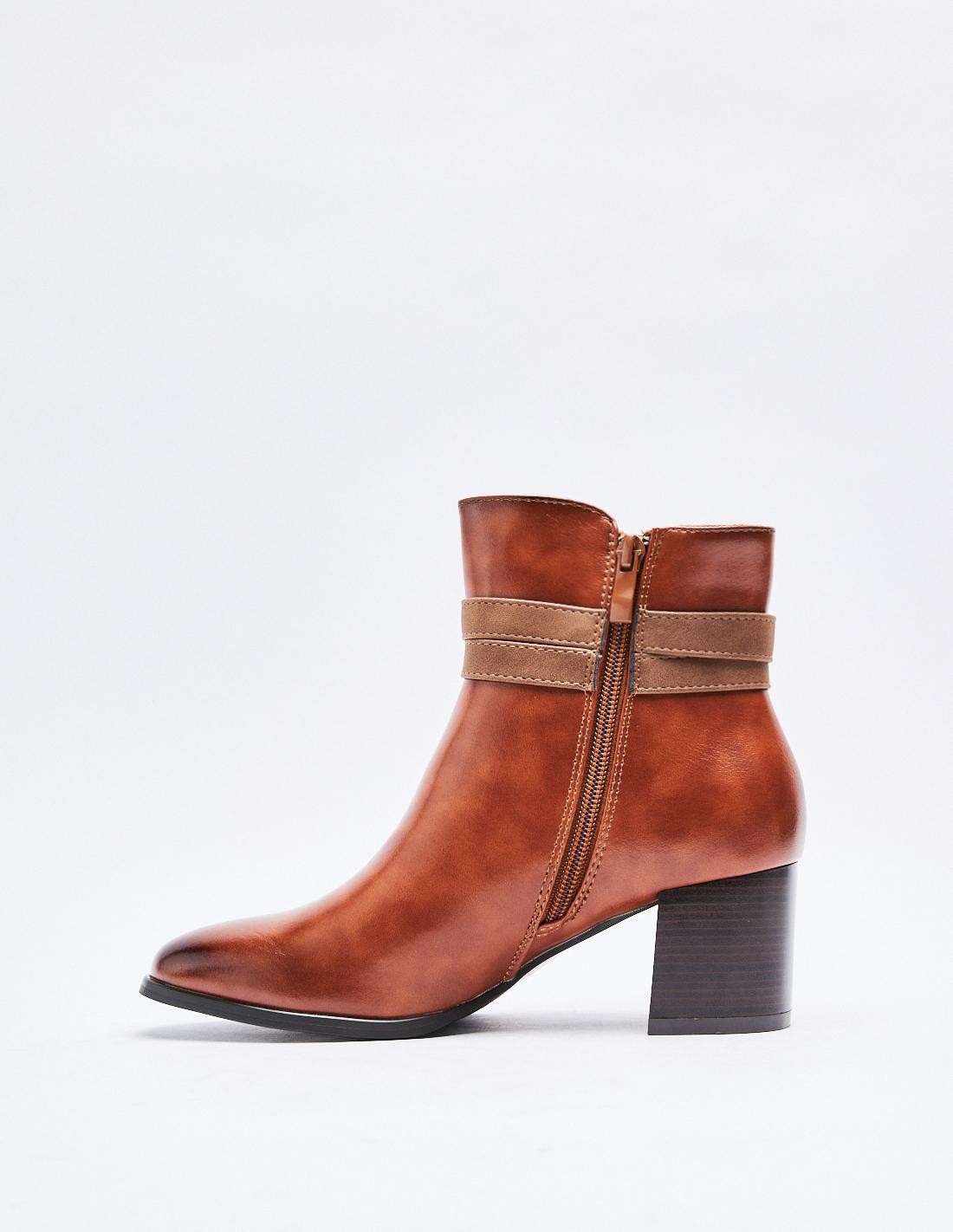 Zapato tipo botín con tacón alto en bloque. Detalle de tira con hebilla. Detalle de pespunte en el cuerpo. Acabado en punta. Cierre mediante cremallera en los laterales. Altura del tacón: 6 cm