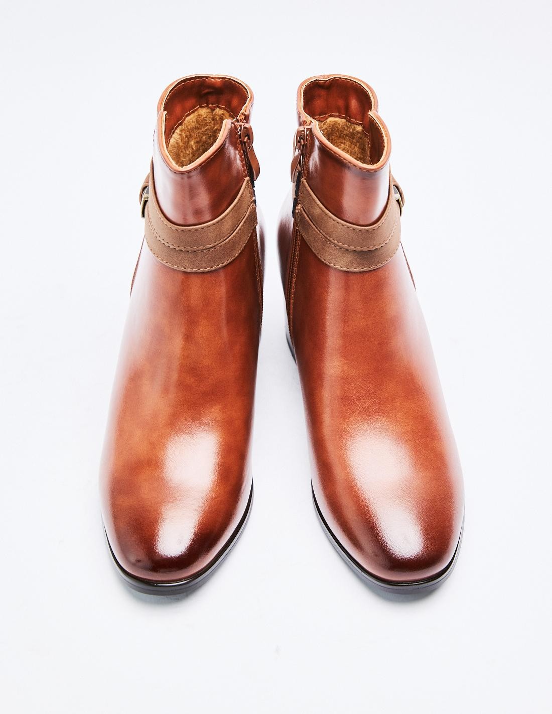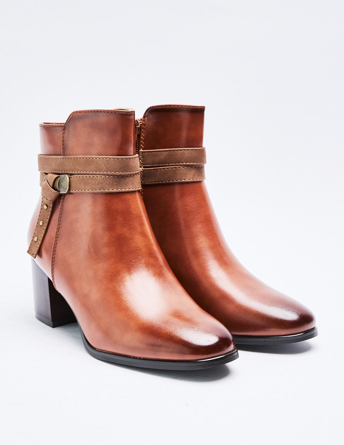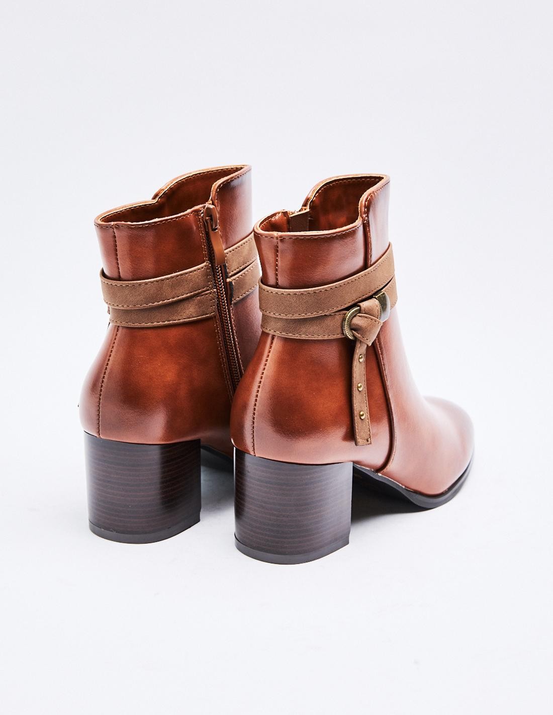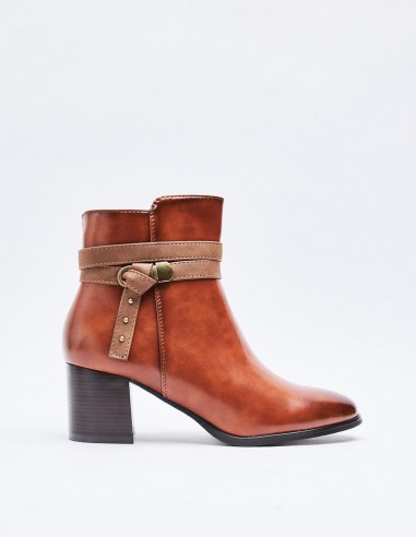 Zapato tipo botín con tacón alto en bloque. Detalle de tira con hebilla. Detalle de pespunte en el cuerpo. Acabado en punta. Cierre mediante cremallera en los laterales. Altura del tacón: 6 cm