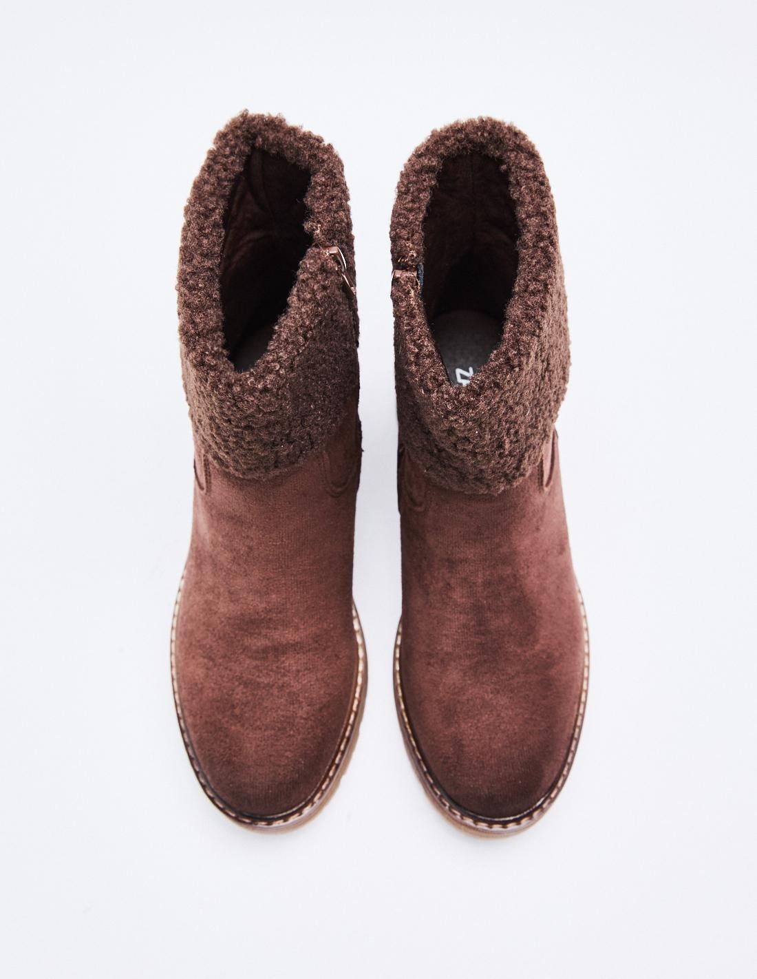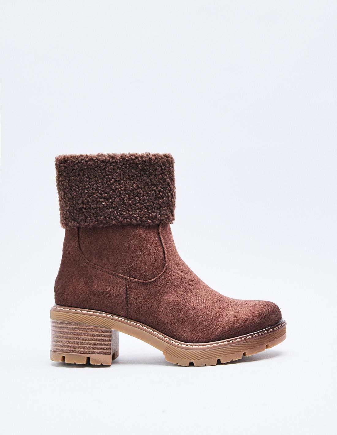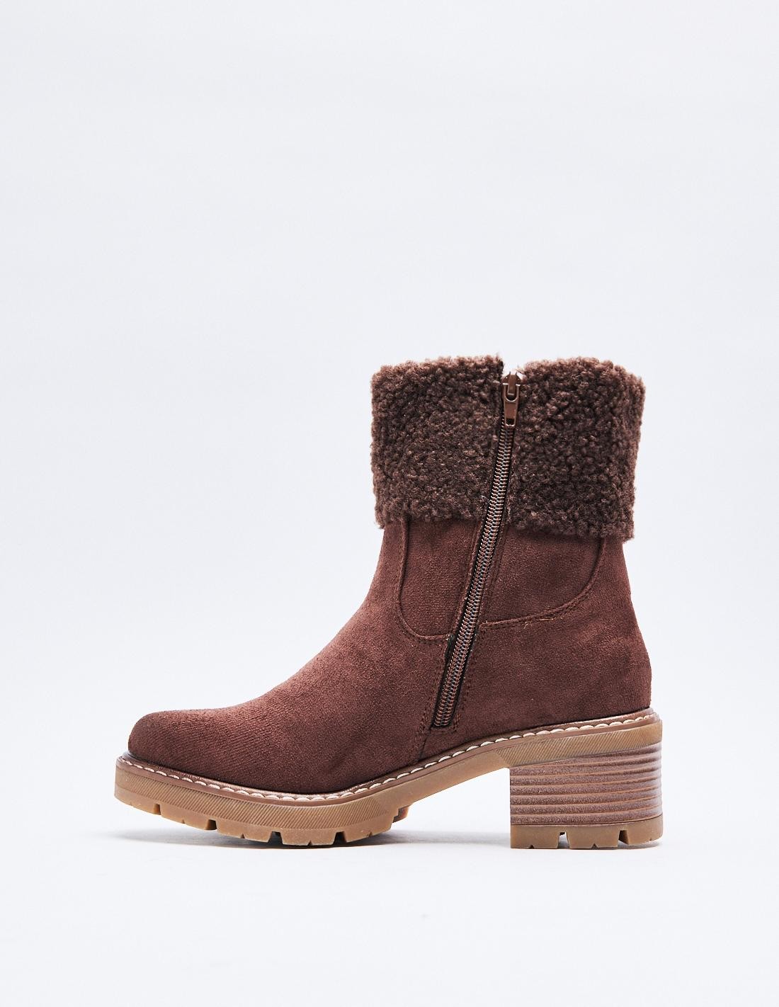 Zapato tipo botín en combinacion de materiales .Detalles de efecto borrego calce fácil mediante pull on. Acabado en punta redonda.Cierre mediante cremallera en los laterales.
