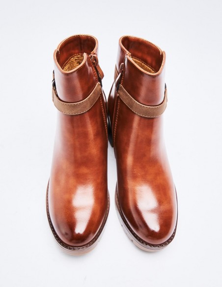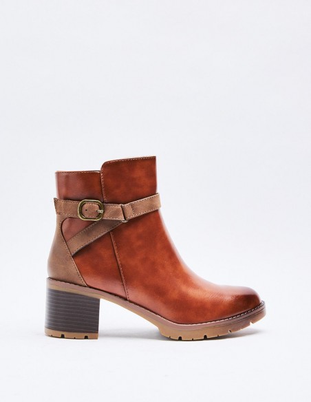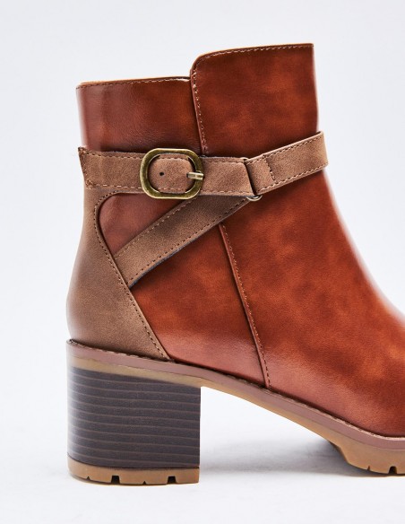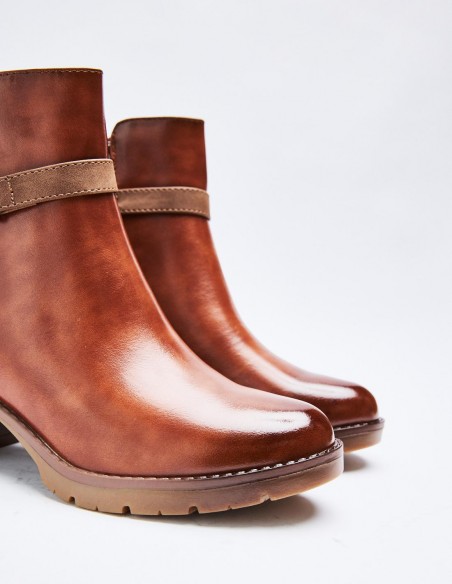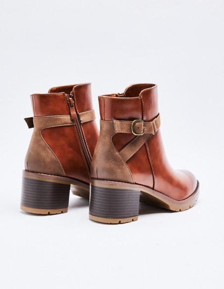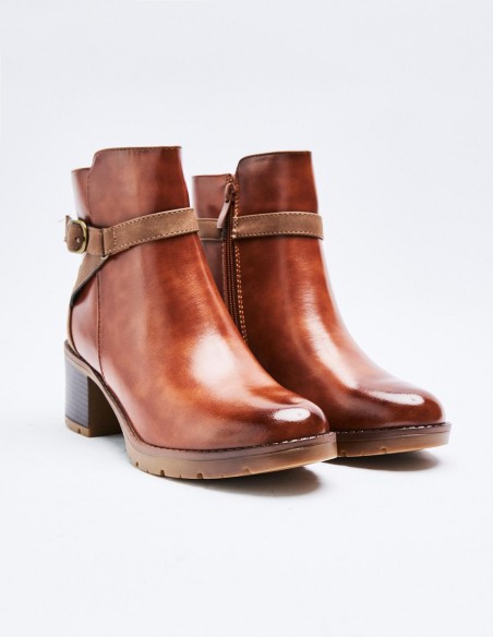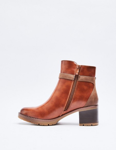 Zapato tipo botín con tacón alto en bloque. Detalle de tira con hebilla. Detalle de pespunte en el cuerpo. Acabado en punta. Cierre mediante cremallera en los laterales. Altura del tacón: 6 cm