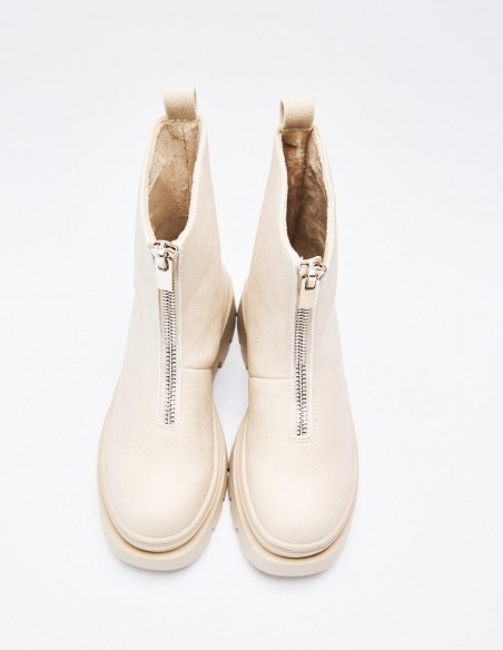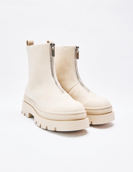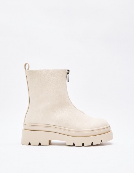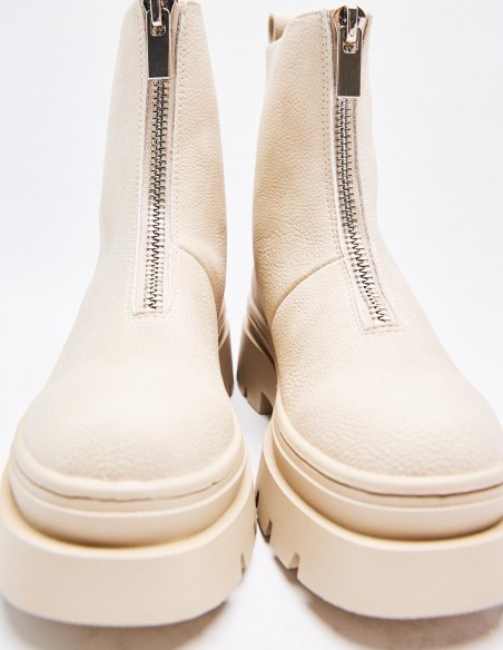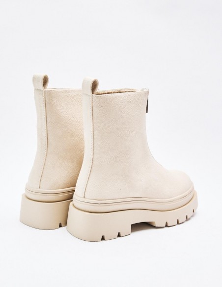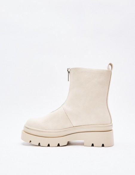 Zapato tipo botín en efecto piel. Detalle de pespunte en el cuerpo. Cierre mediante cremallera. Acabado en punta redonda. Suela tipo track dentada. Altura de la suela: 3 cm