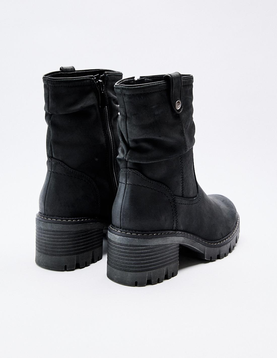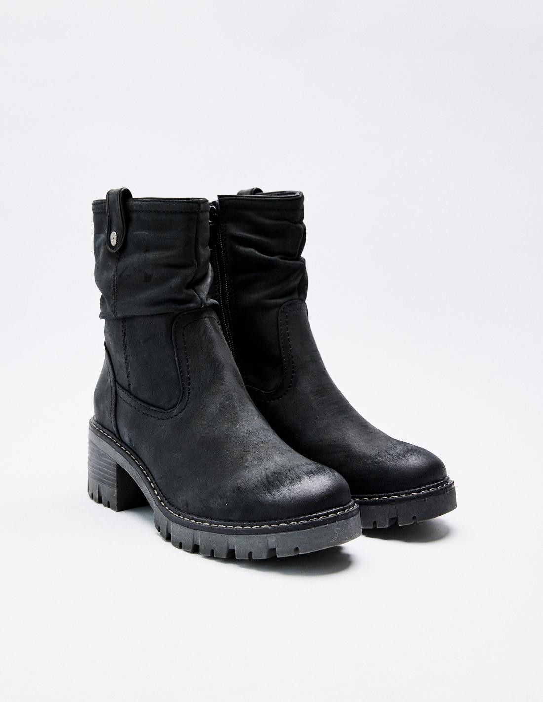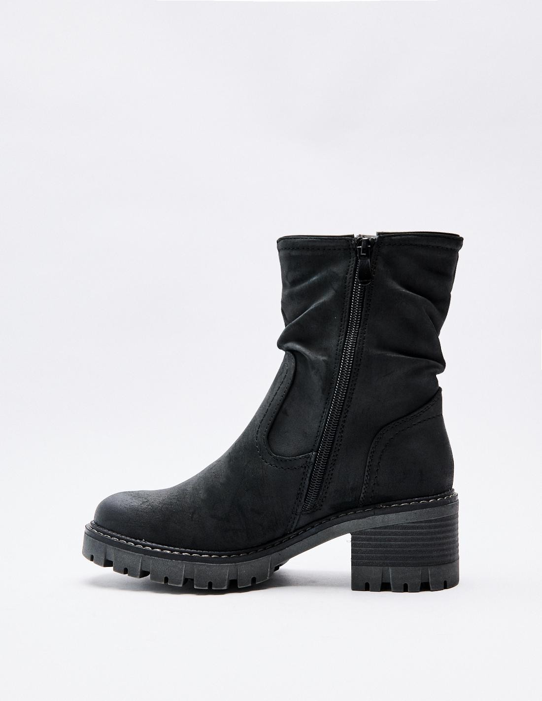 Zapato tipo botín en efecto piel mate . Suela track de tacón .Tirador trasero. Cierre cremallera lateral. Acabado en punta redonda. Altura de la suela: 5 cm.