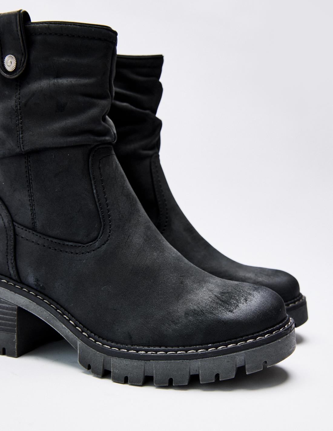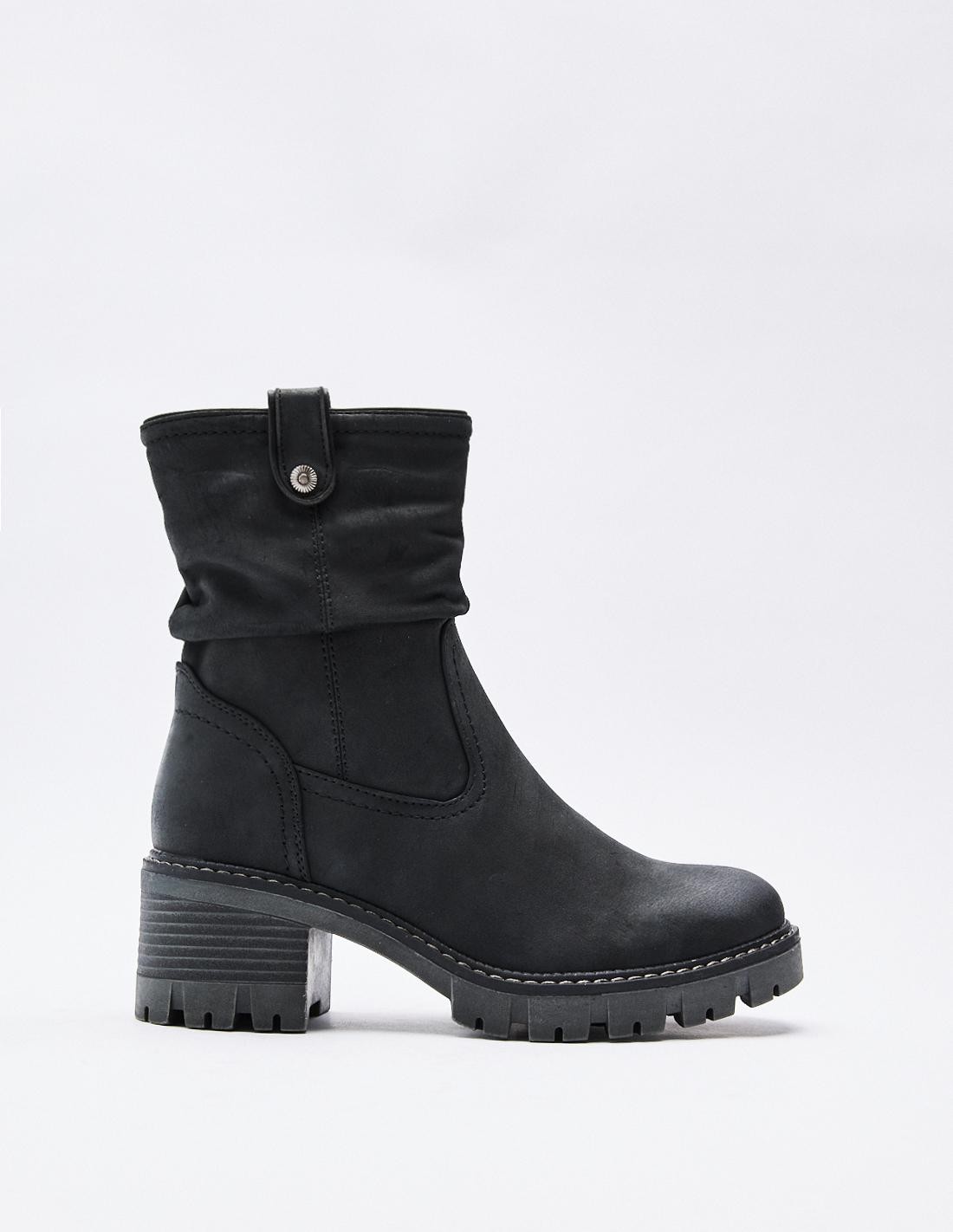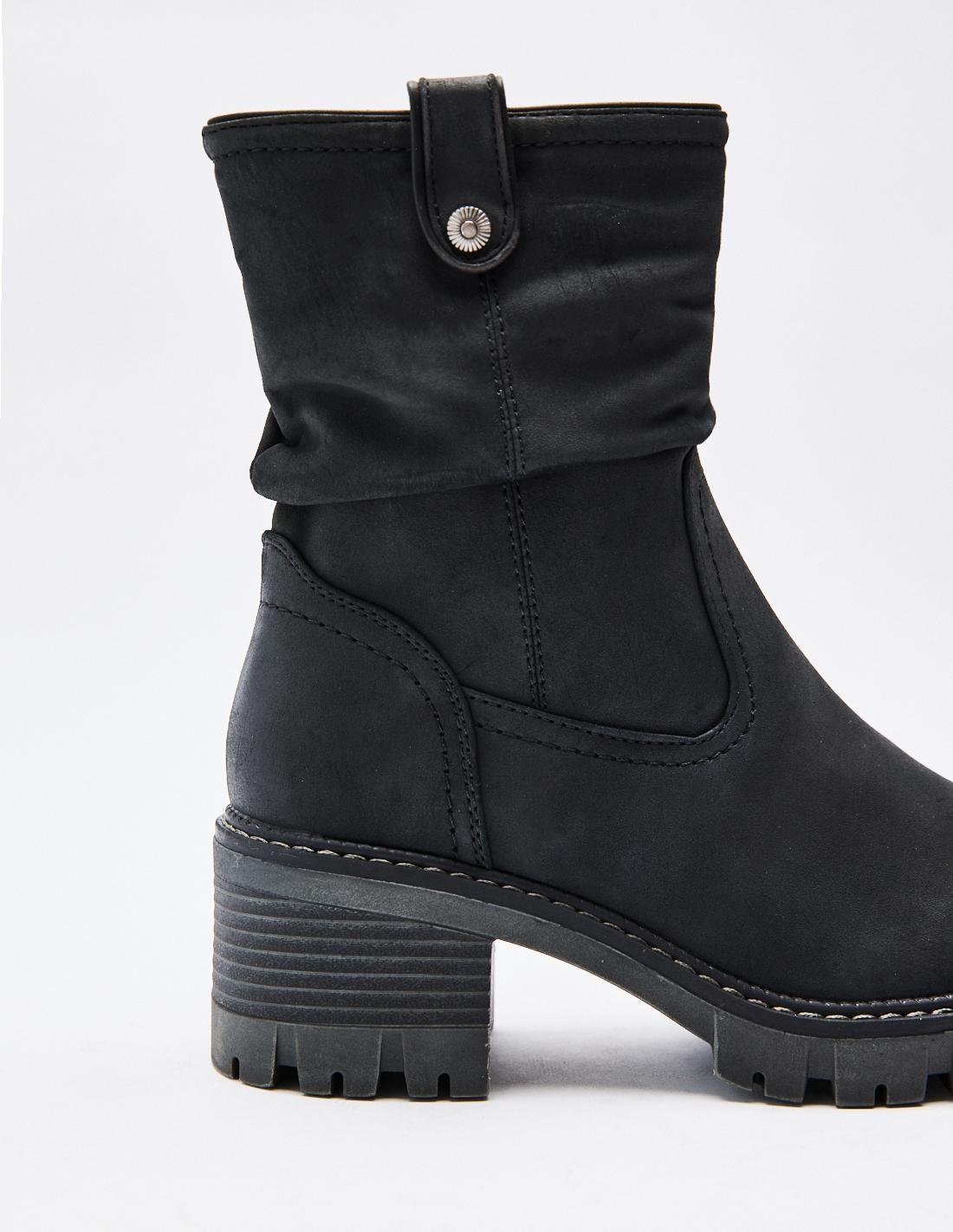 Zapato tipo botín en efecto piel mate . Suela track de tacón .Tirador trasero. Cierre cremallera lateral. Acabado en punta redonda. Altura de la suela: 5 cm.