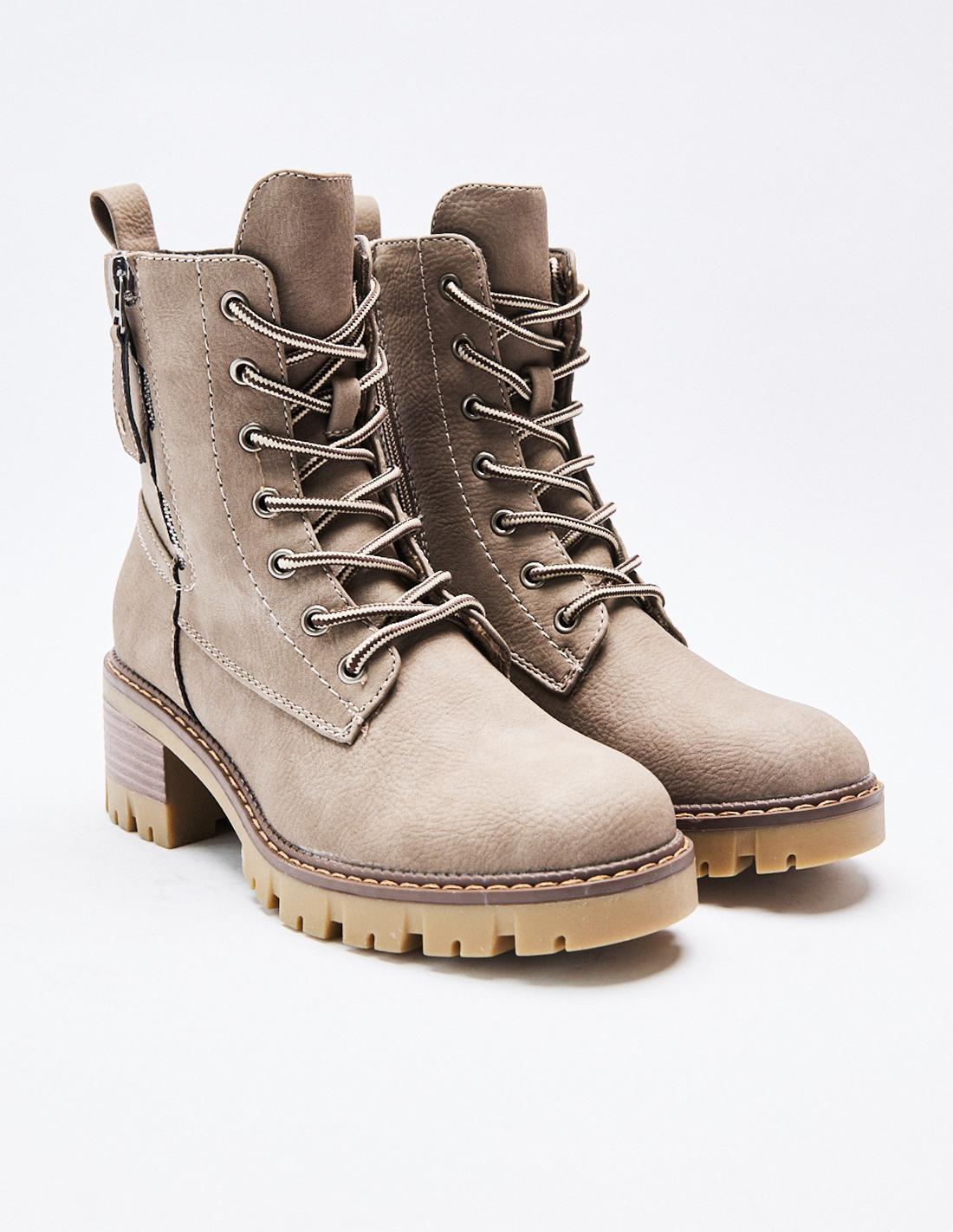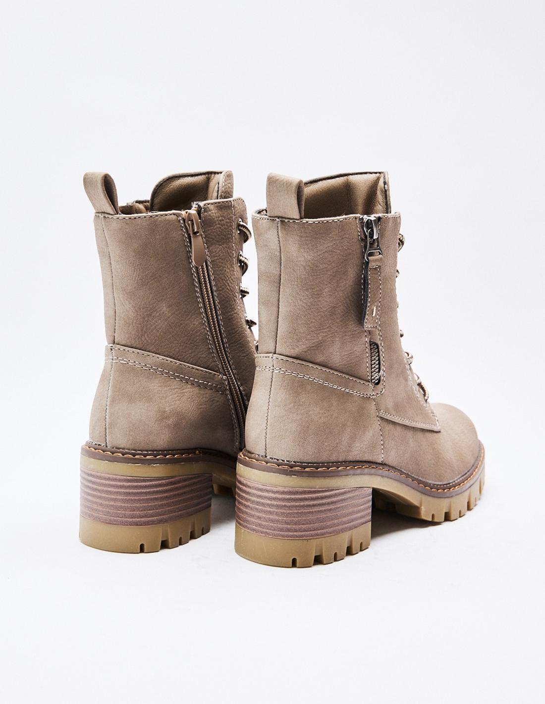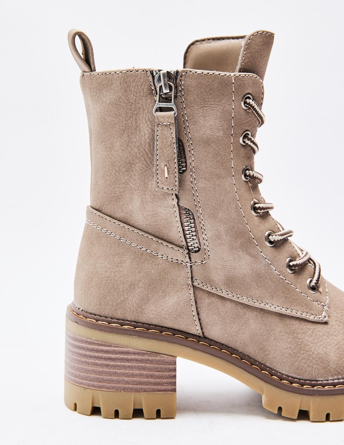 Zapato tipo botín en efecto piel mate . Suel track de tacón .Tirador trasero. Cierre mediante cordones y cremallera lateral. Acabado en punta redonda. Altura de la suela: 5 cm.