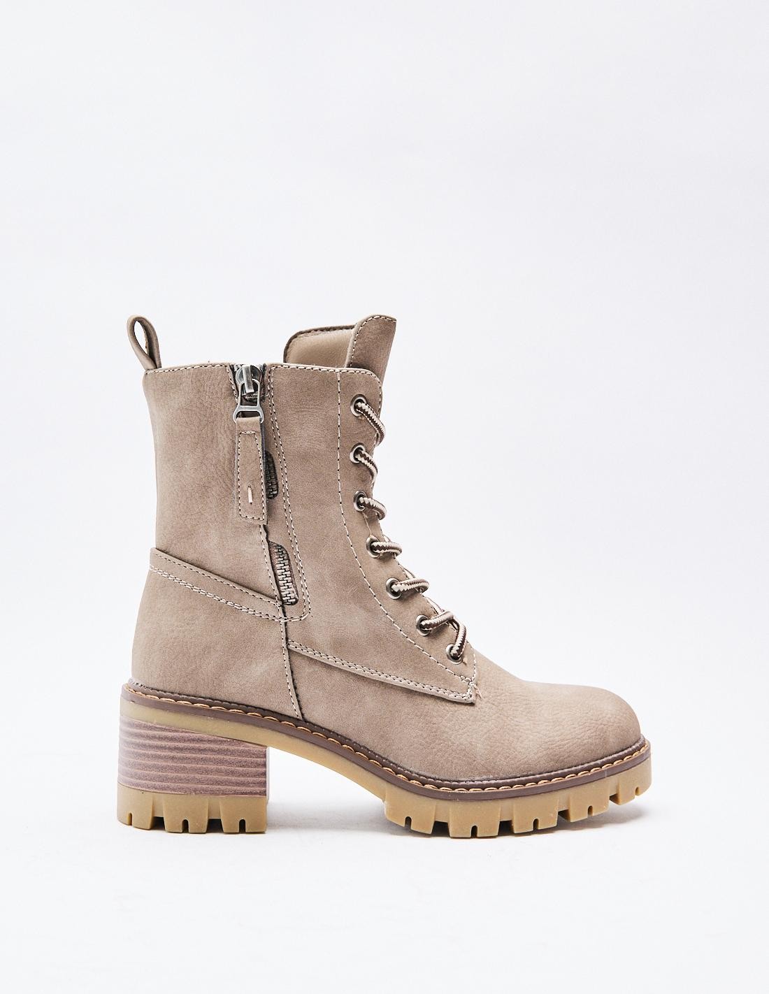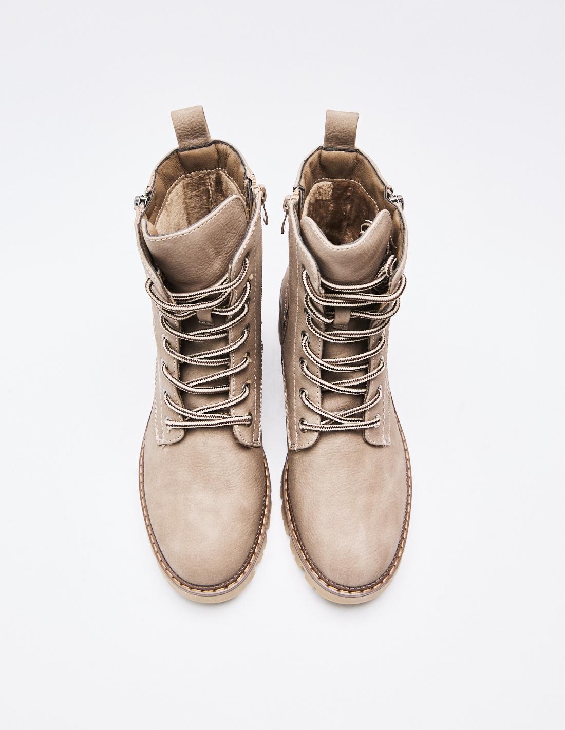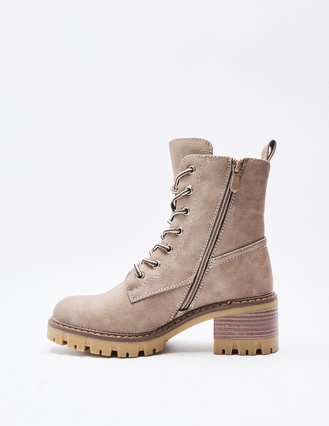 Zapato tipo botín en efecto piel mate . Suel track de tacón .Tirador trasero. Cierre mediante cordones y cremallera lateral. Acabado en punta redonda. Altura de la suela: 5 cm.