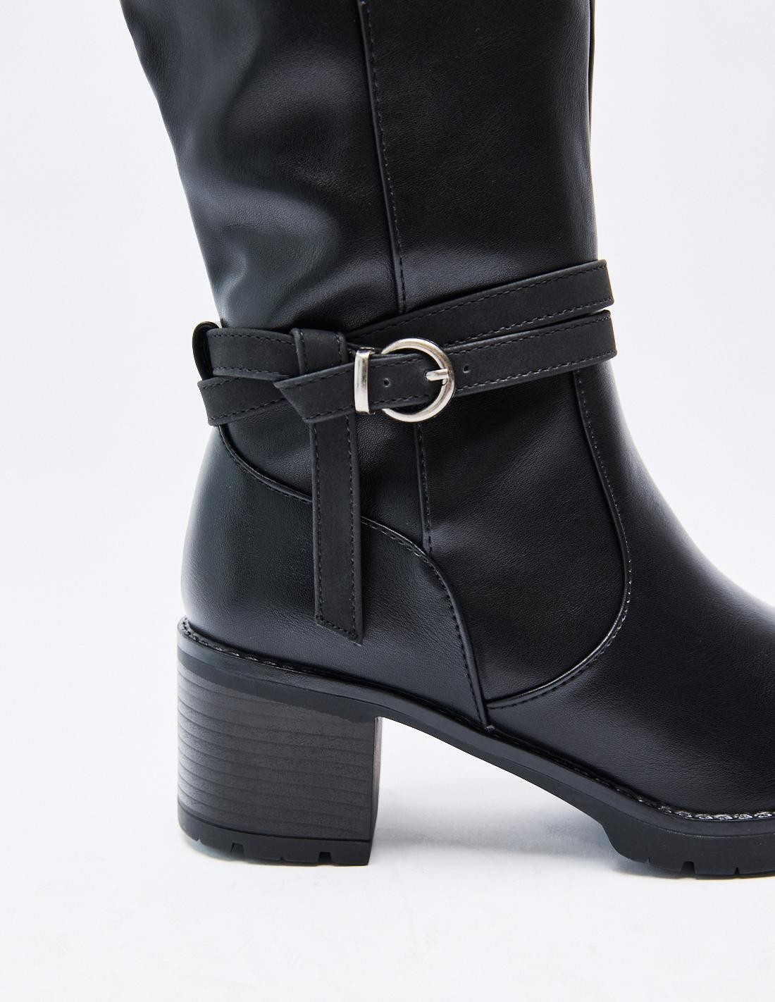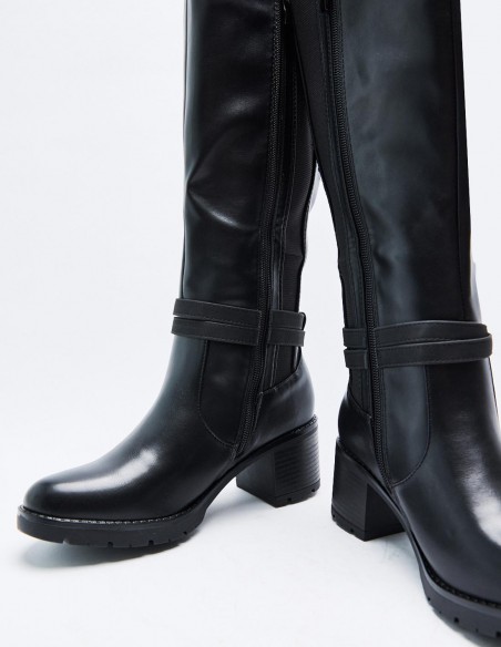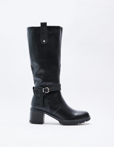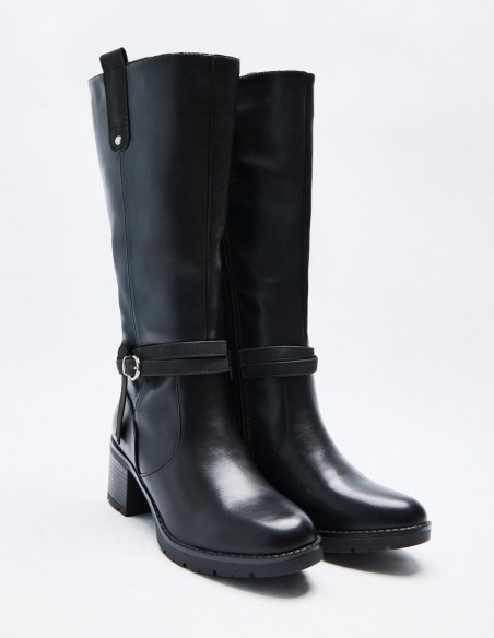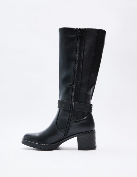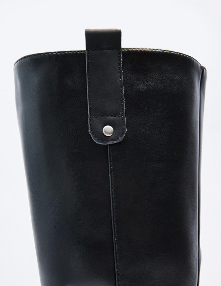 Zapato tipo bota estilo hípica. Detalle de cinta. Tirador trasero. Caña alta. Calce mediante pull on. Tacón bajo ancho. Acabado en punta redonda. Cierre mediante cremalleras en los laterales. Altura del tacón: 5 cm