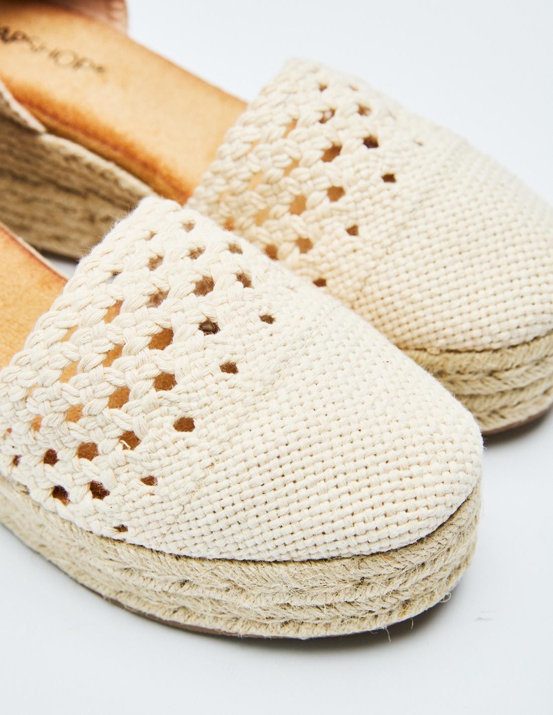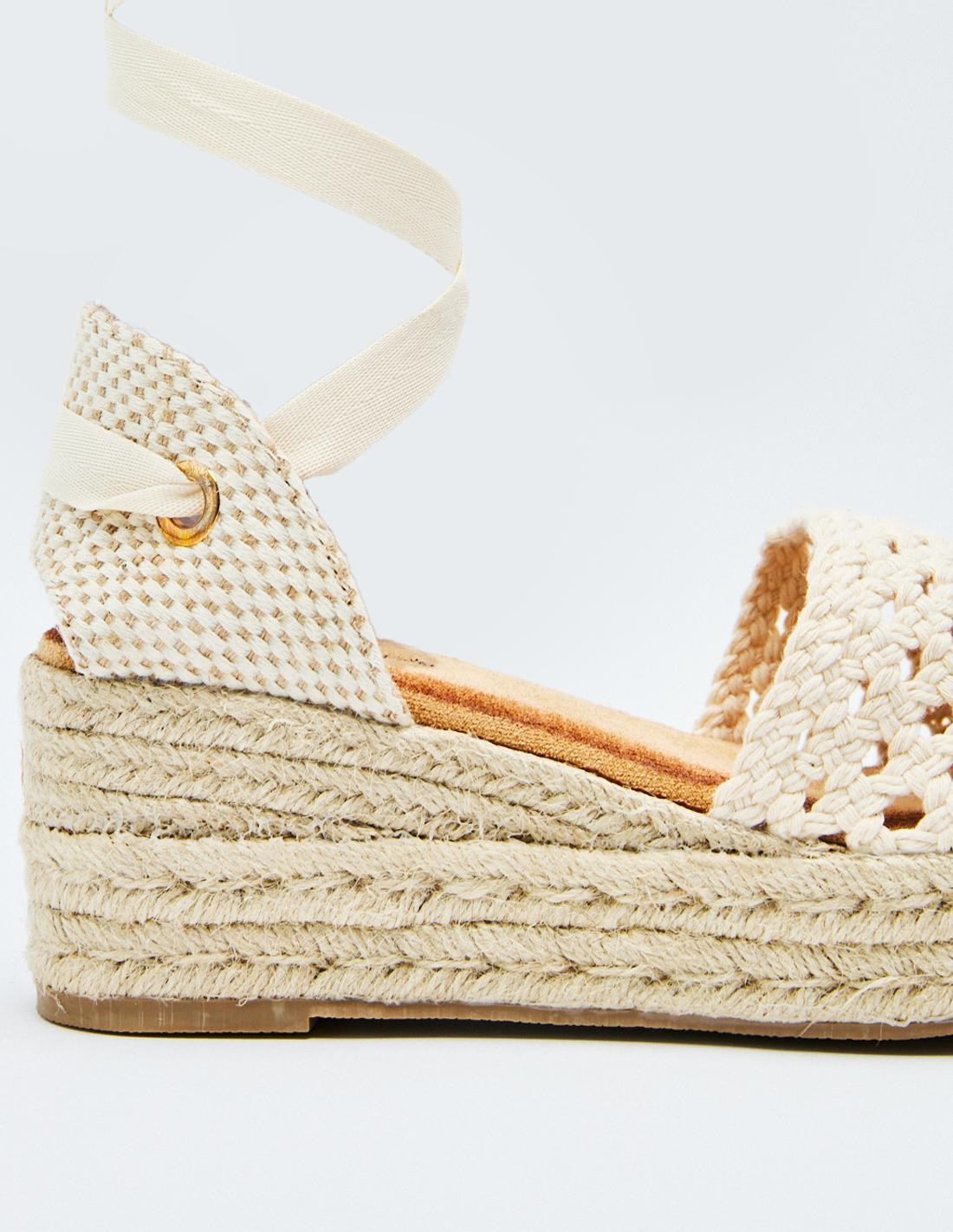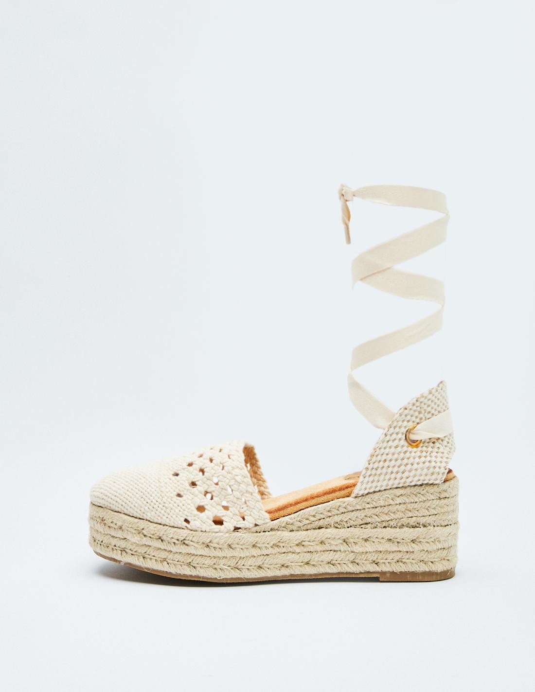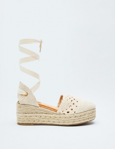 Zapato tipo alpargata con tacón de plataforma . Combinación de materiales en el corte. Tiras para atar en el tobillo. Altura del tacón: 6.9 cm.