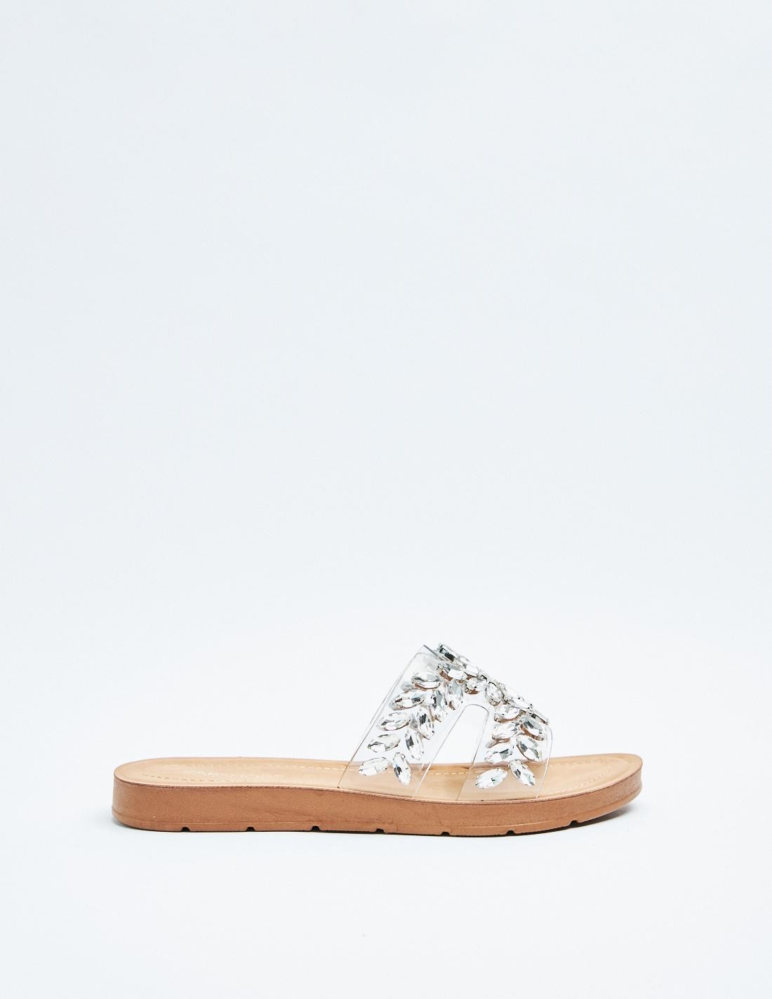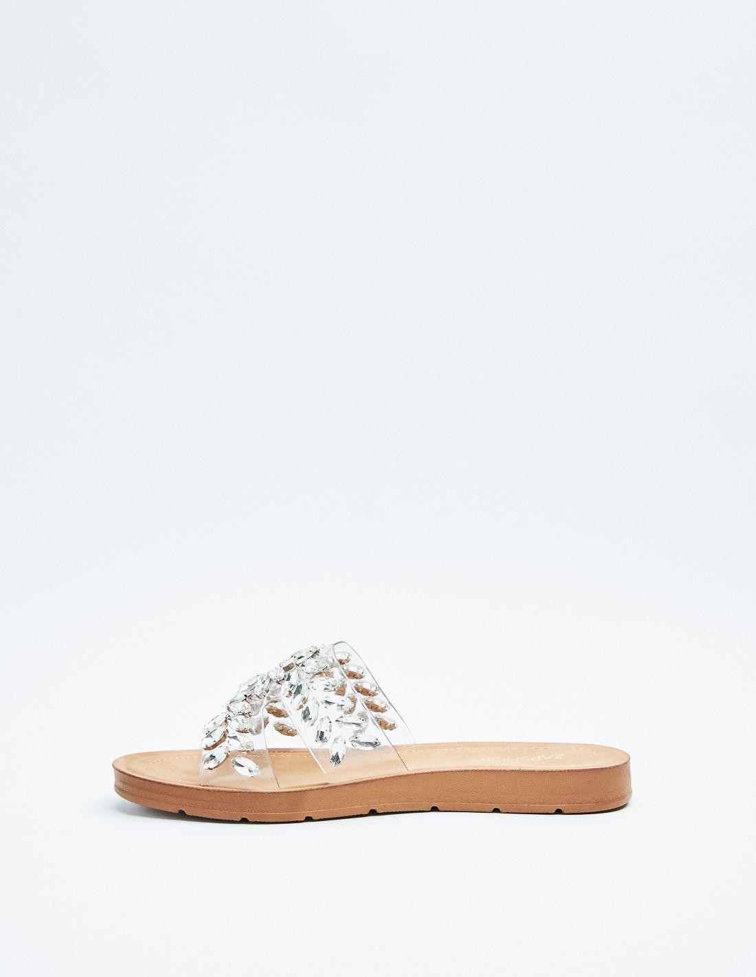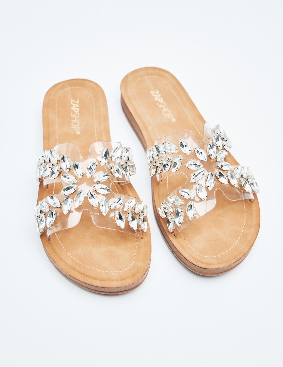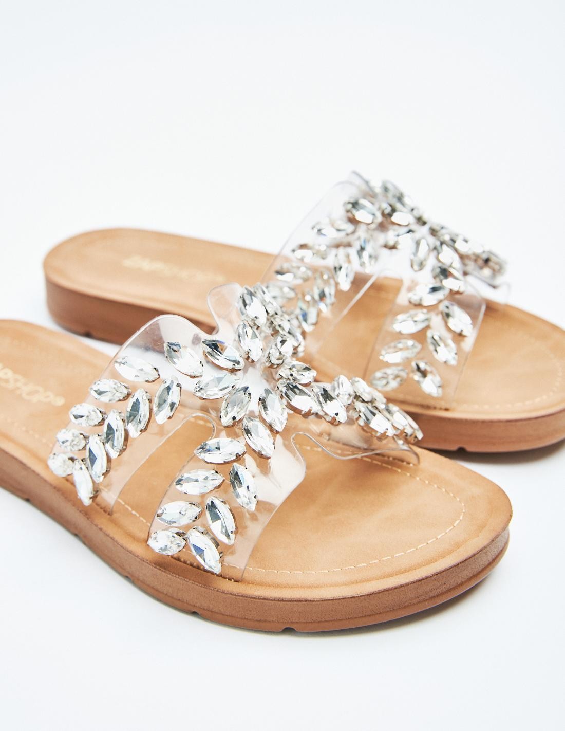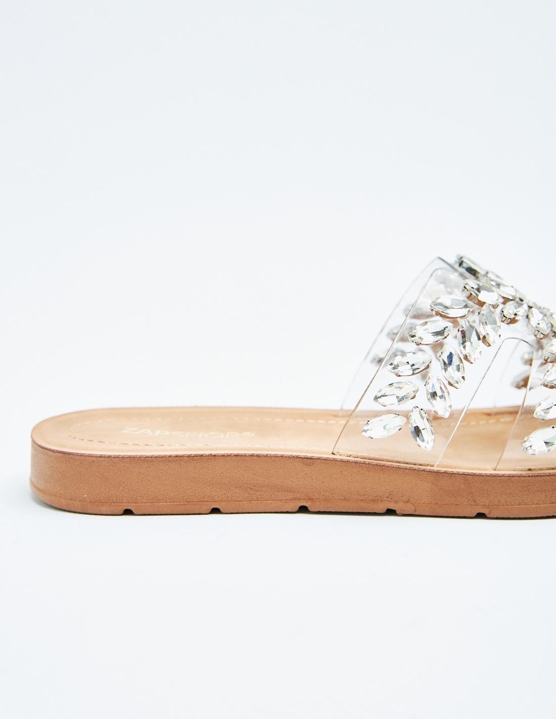 Sandalia plana con tira gruesa con piedras brillantes . Suela plana dentada.
