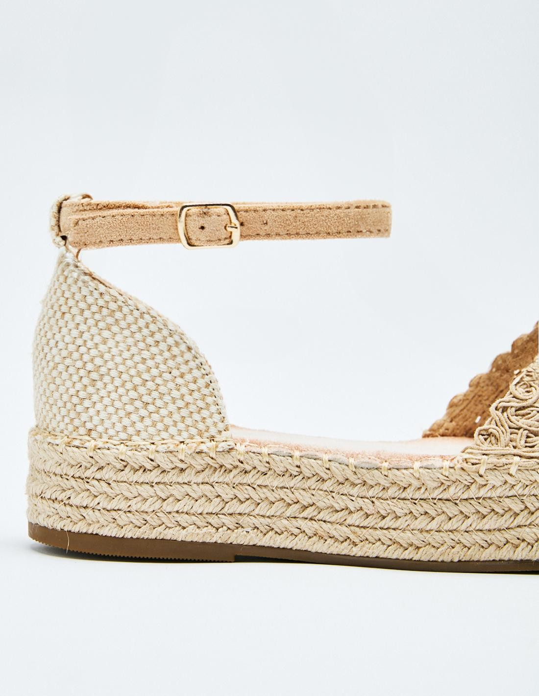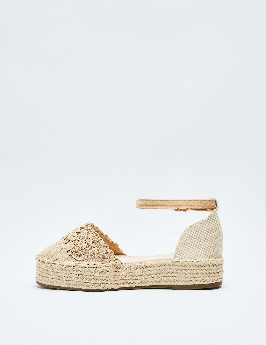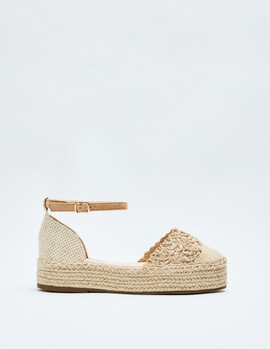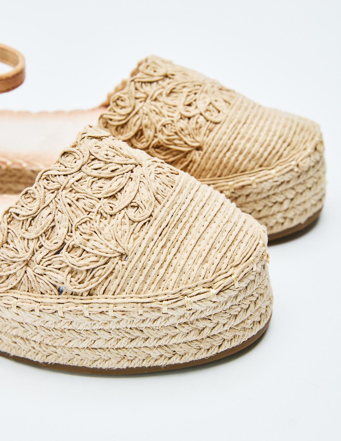 Zapato destalonado tipo alpargata en efecto serraje . Tacón alto en forma de plataforma. Cierre mediante pulsera con hebilla en el tobillo. Suela de goma con yute .