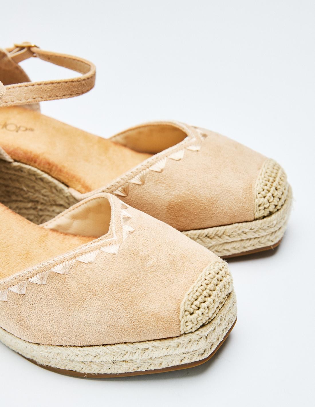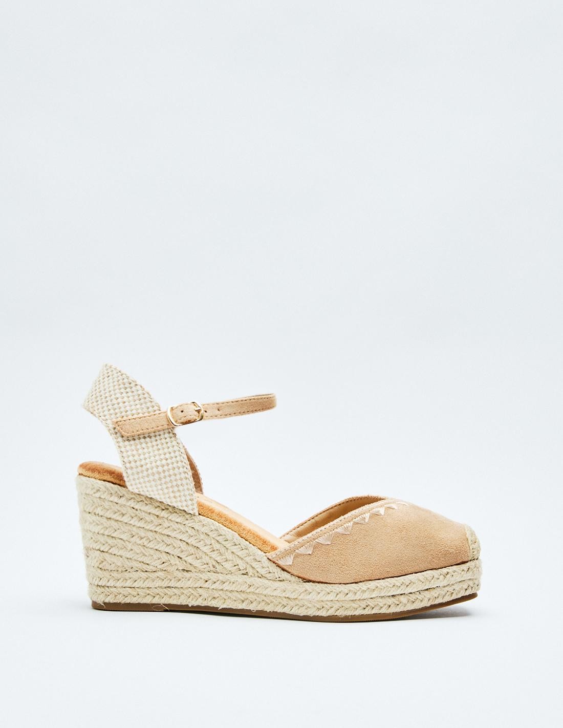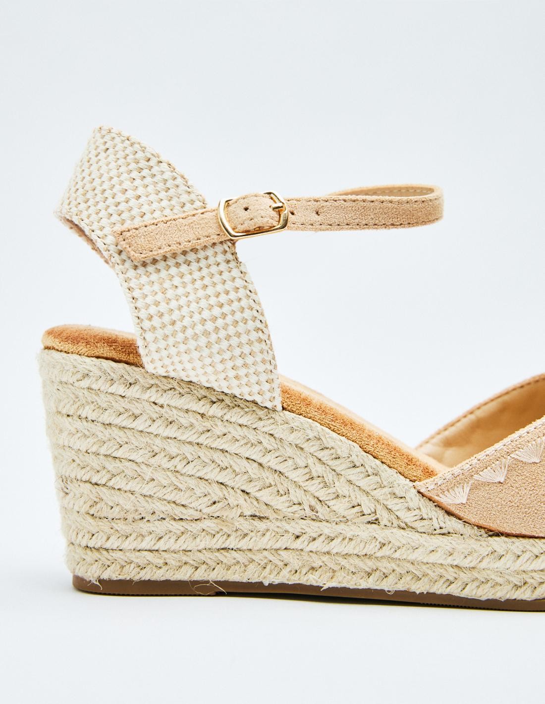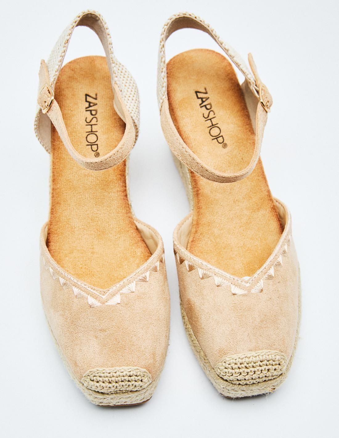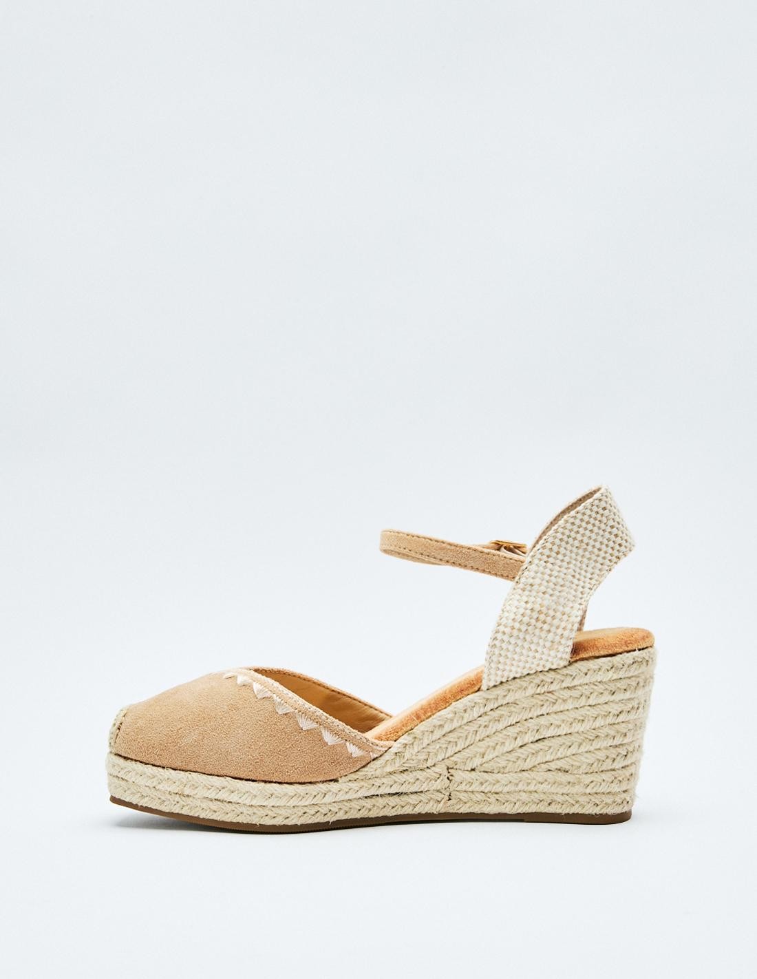 Zapato destalonado tipo alpargata en serraje. Tacón alto en forma de cuña. Cierre mediante hebilla en la pulsera del tobillo. Altura del tacón: 7.8 cm.
