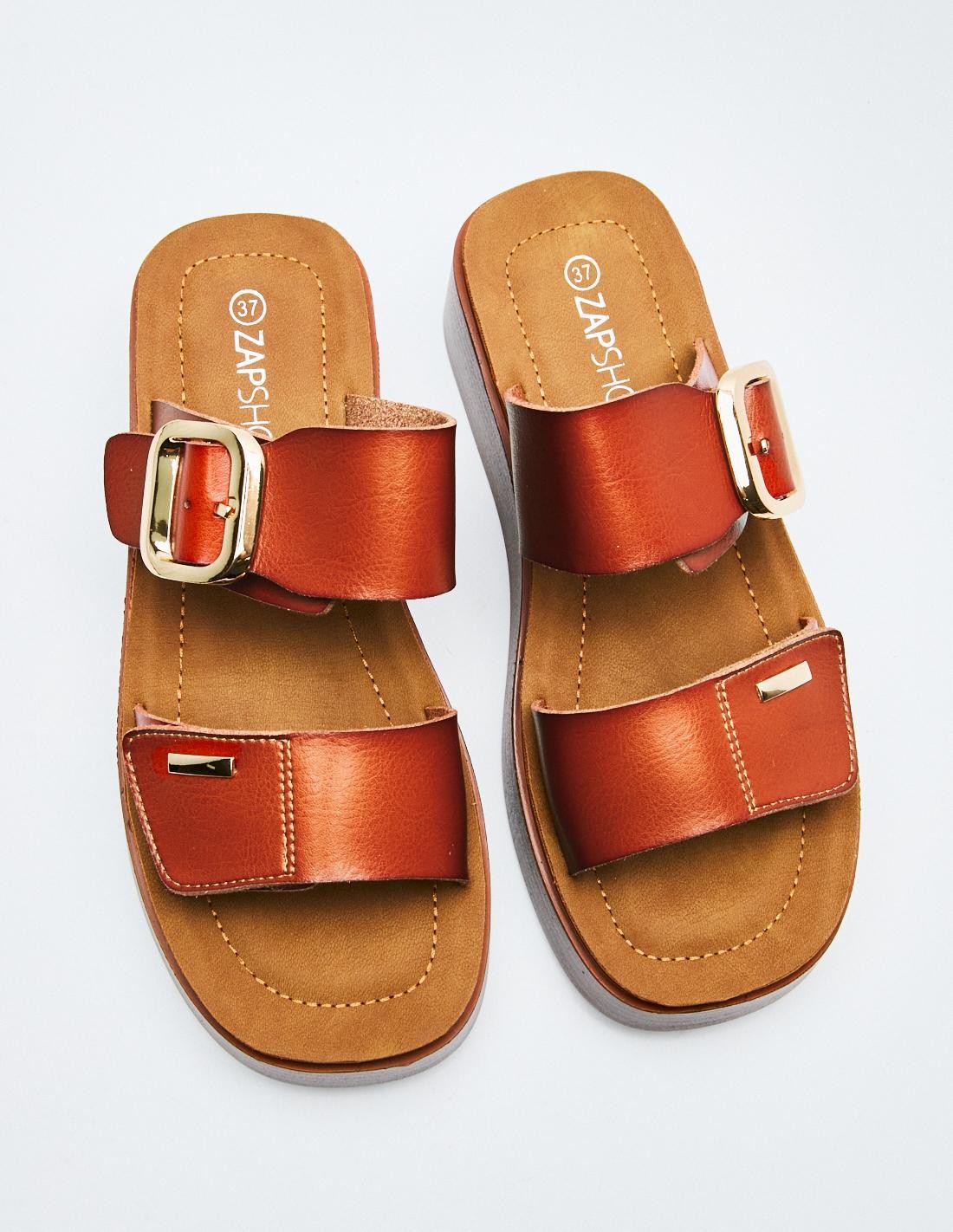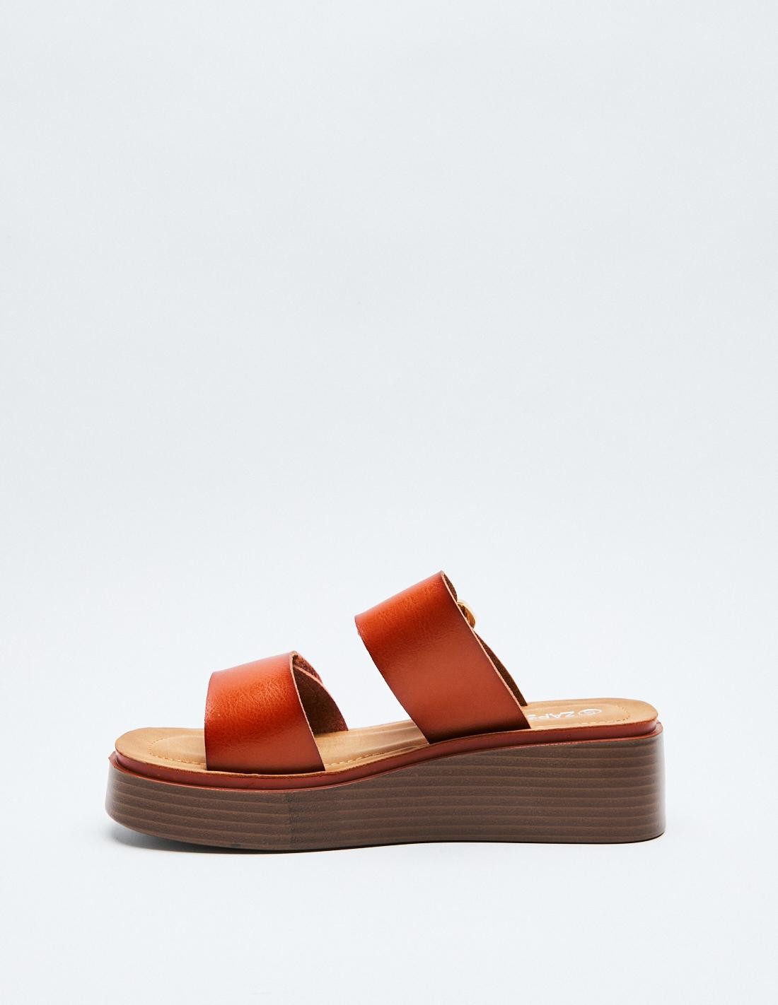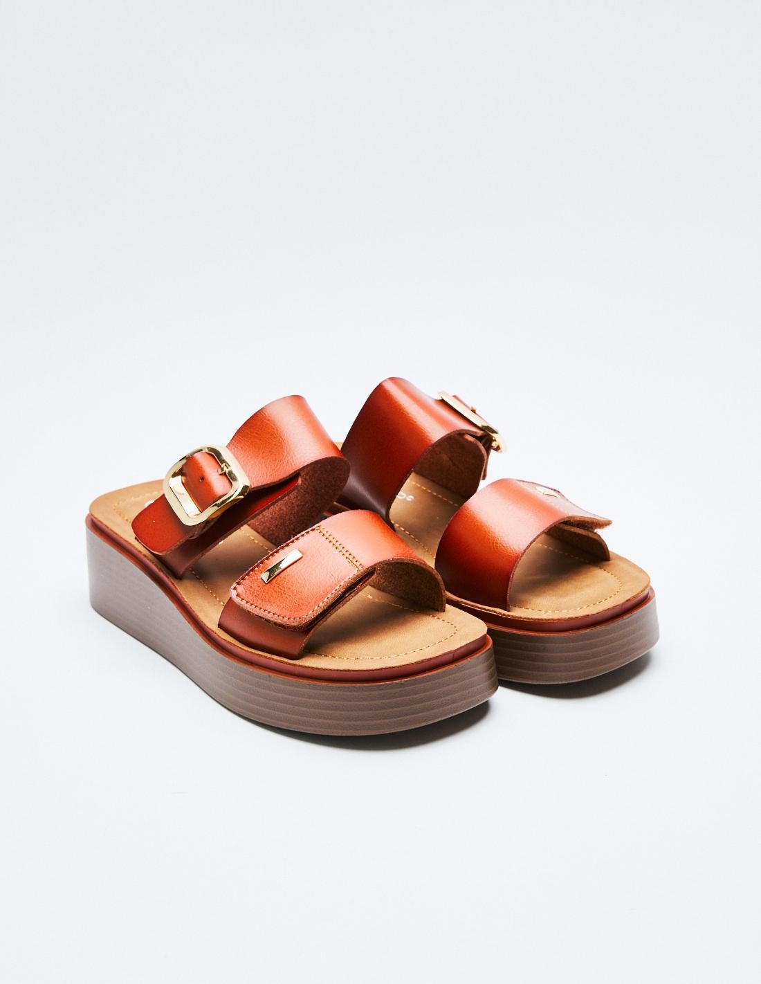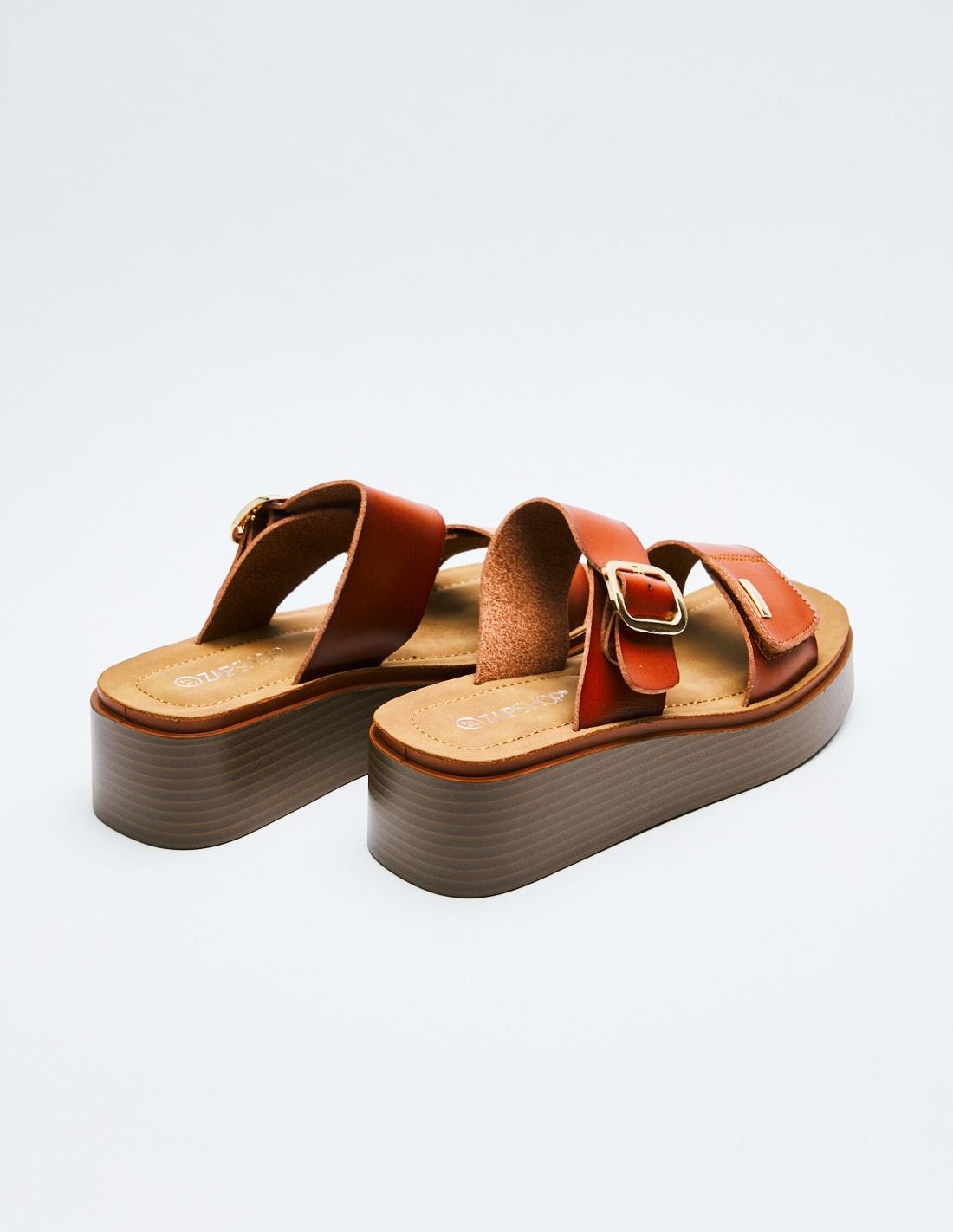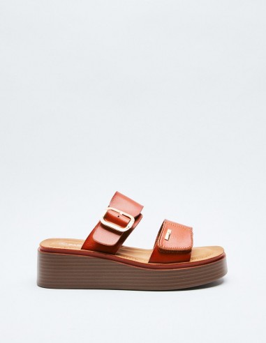 Sandalia en efecto piel . Suela de platorma en efecto madera . Altura de la suela: 7 cm.