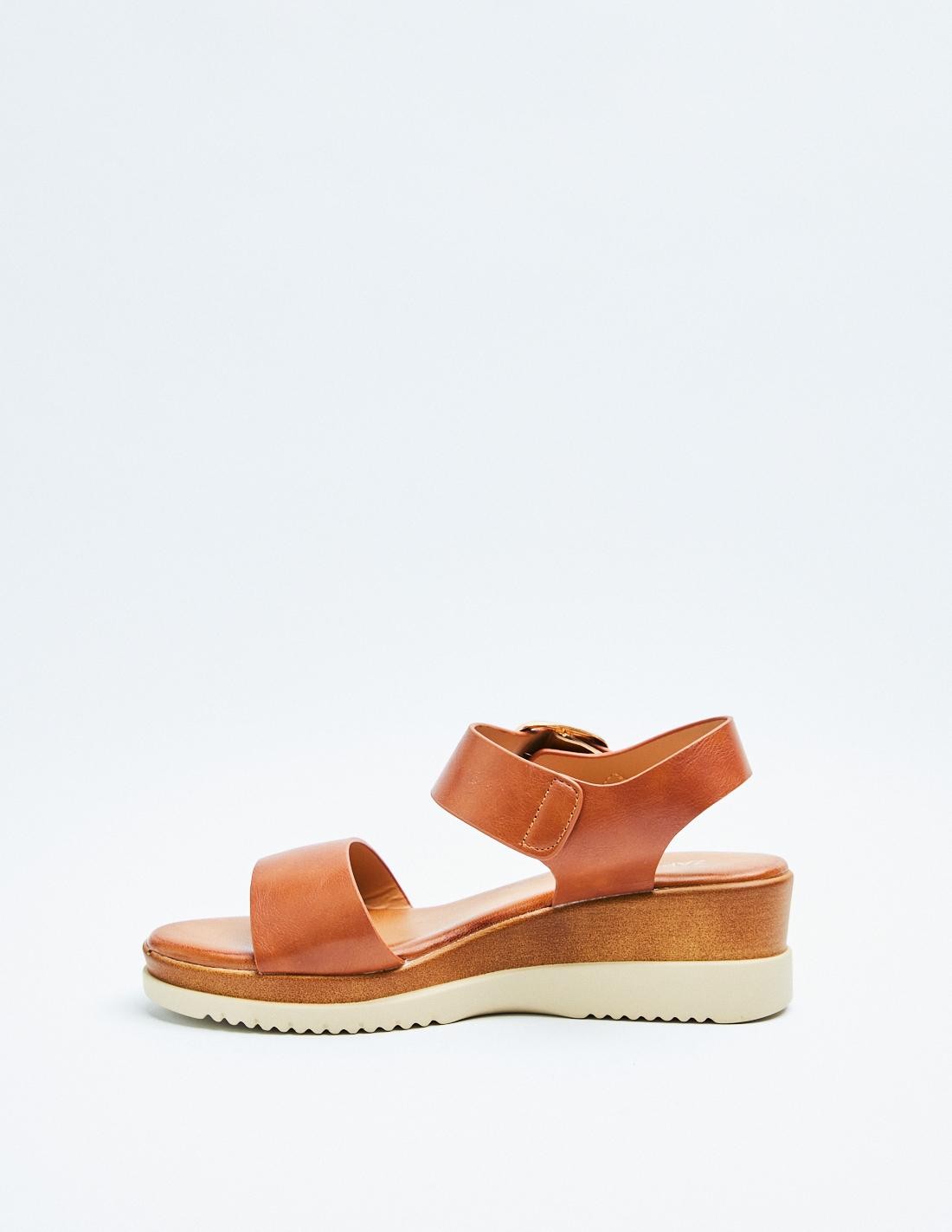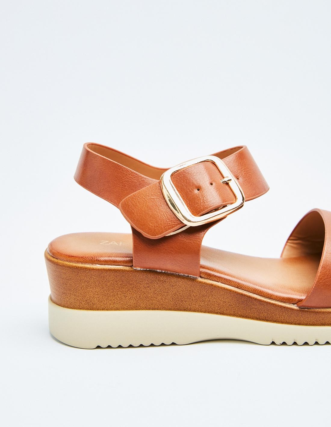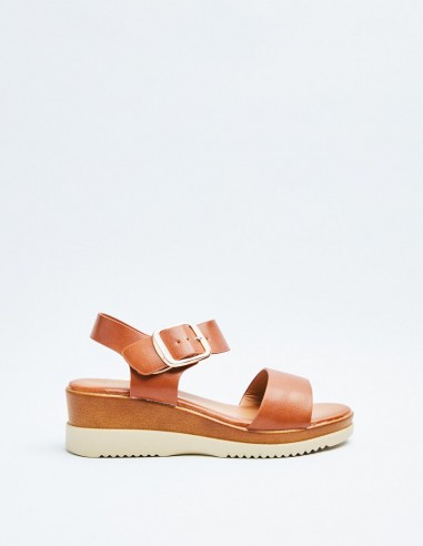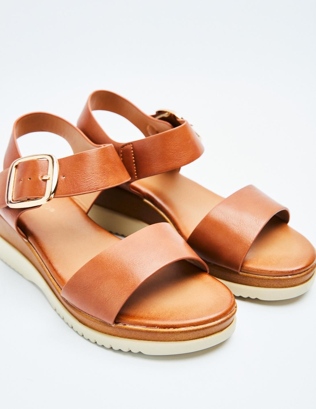 Sandalia plana tipo platafarma en efecto piel . Tira en la parte delantera. Cierre mediante hebilla en la pulsera del tobillo.Suela en combinación de materiales . Altura de la suela: 3,5 cm.