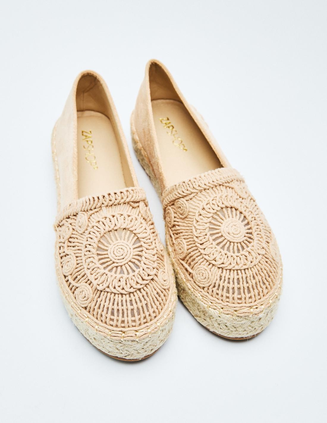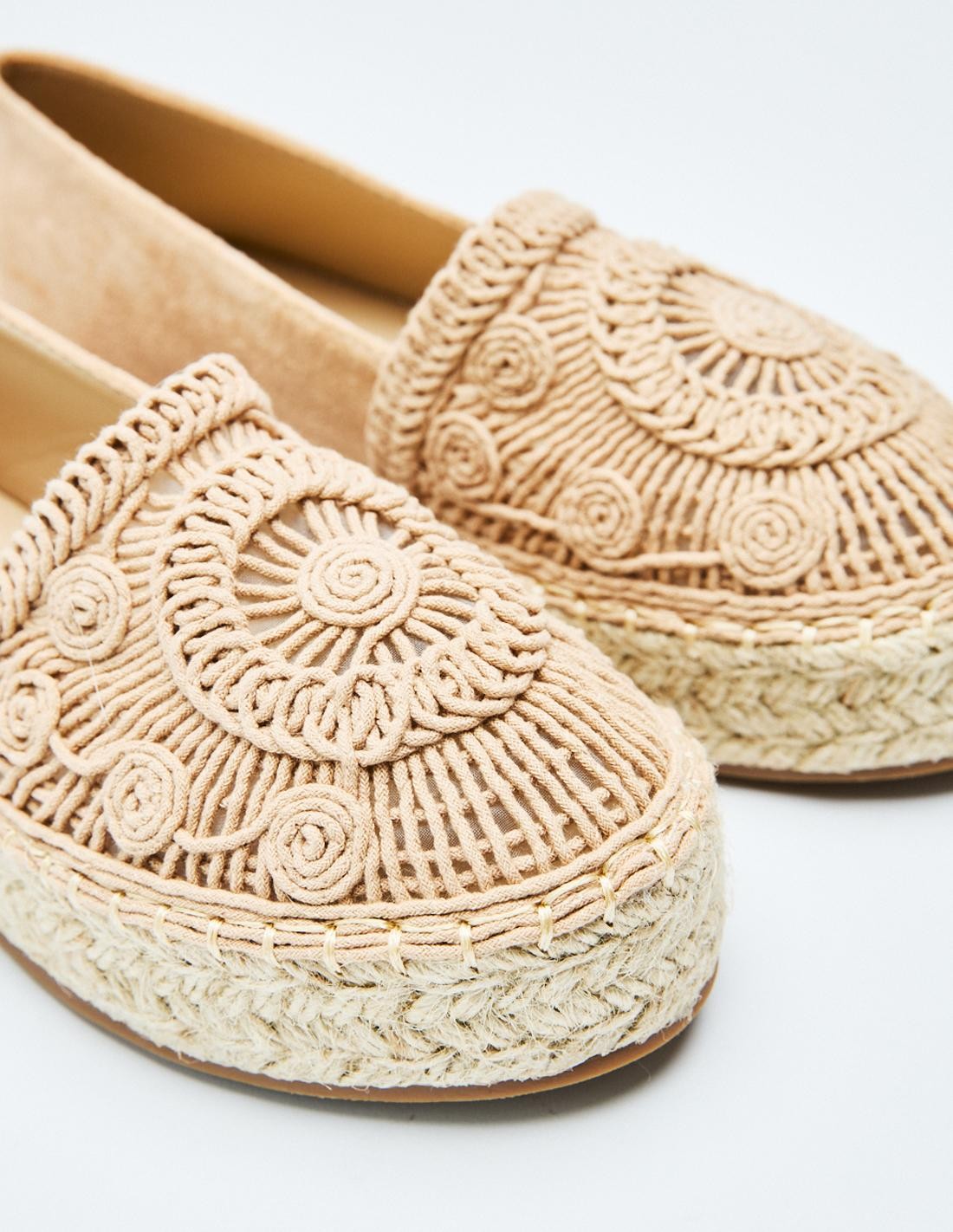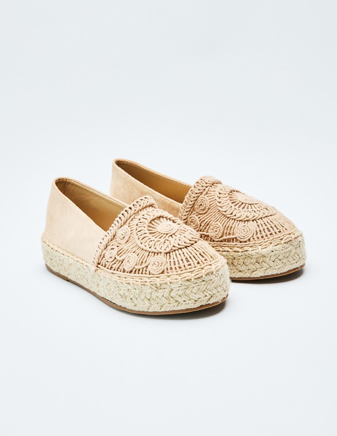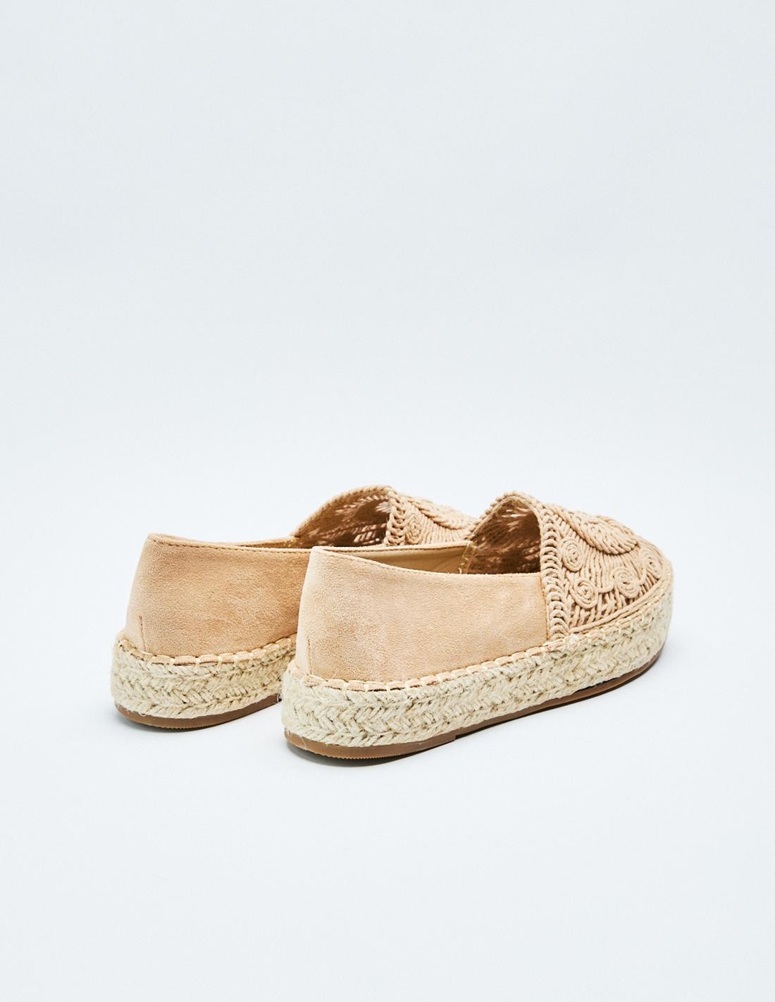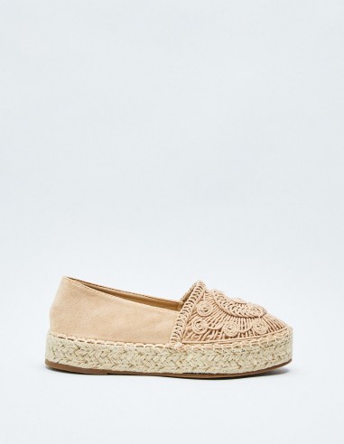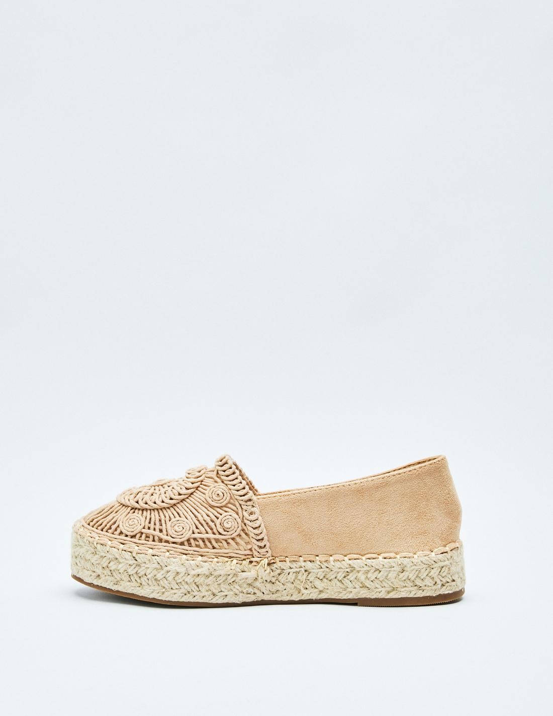 Zapato tipo alpargata. Combinación de materiales con detalle en la parte delantera . Suela de goma con acabado en yute . Altura de la suela: 3 cm.