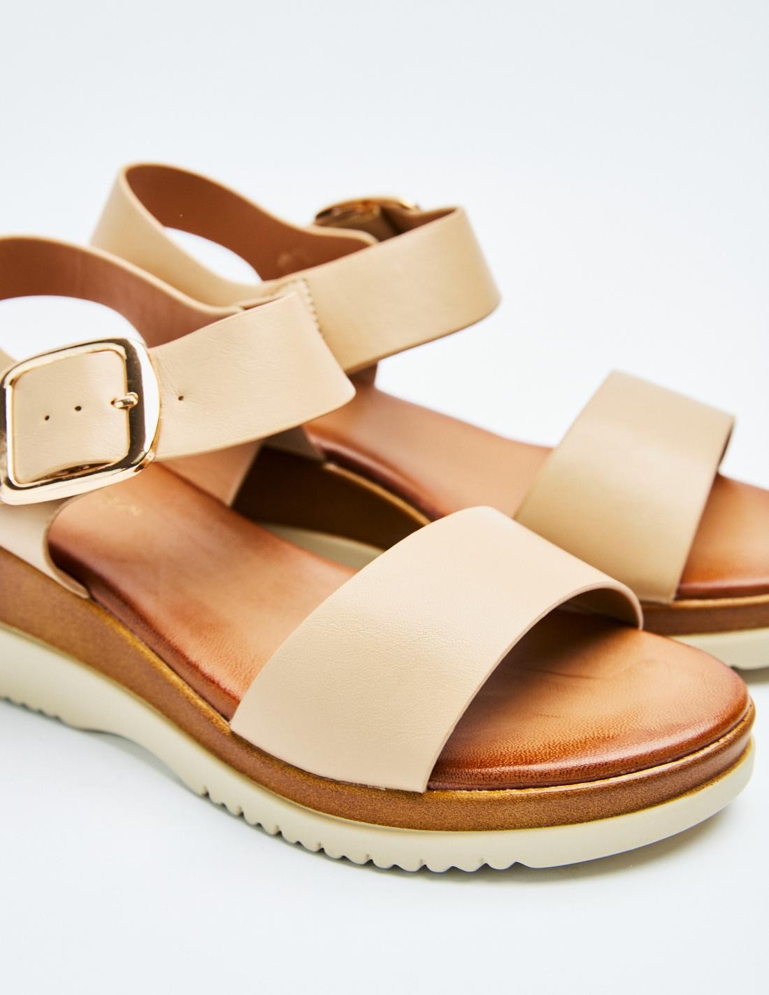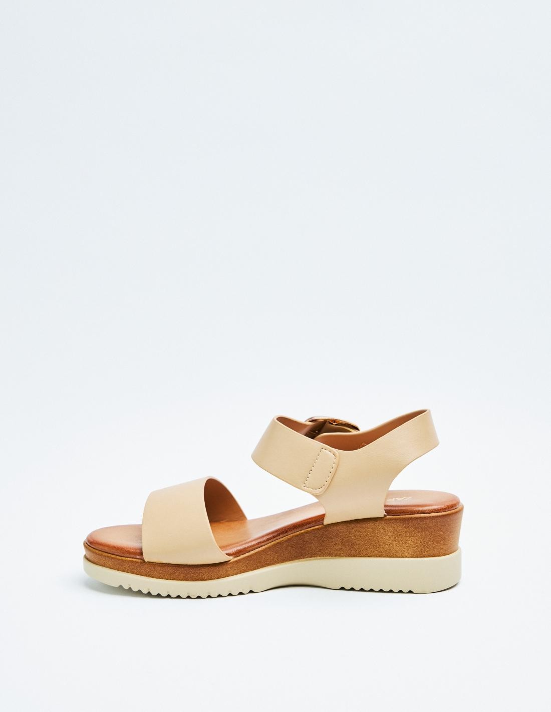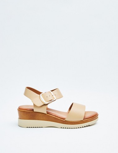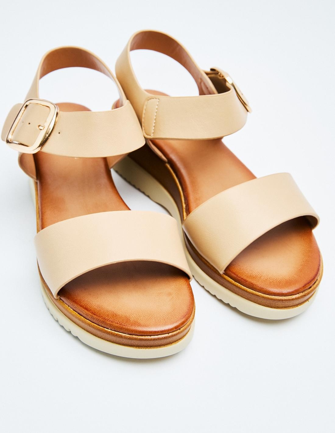 Sandalia plana tipo platafarma en efecto piel . Tira en la parte delantera. Cierre mediante hebilla en la pulsera del tobillo.Suela en combinación de materiales .