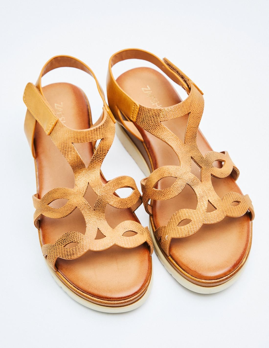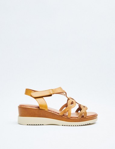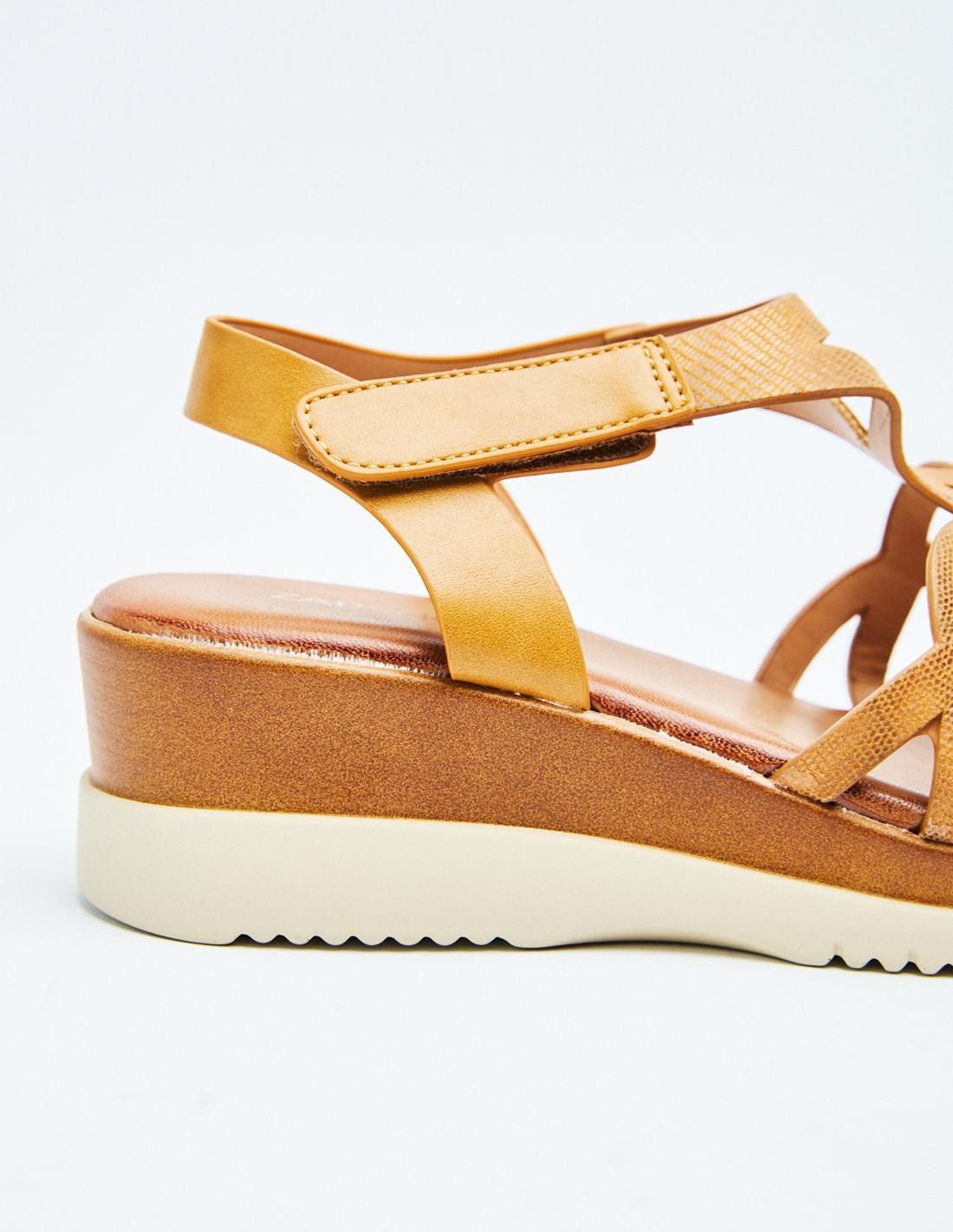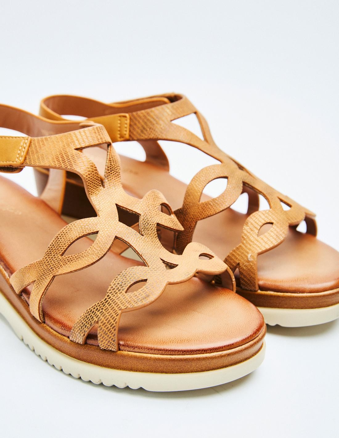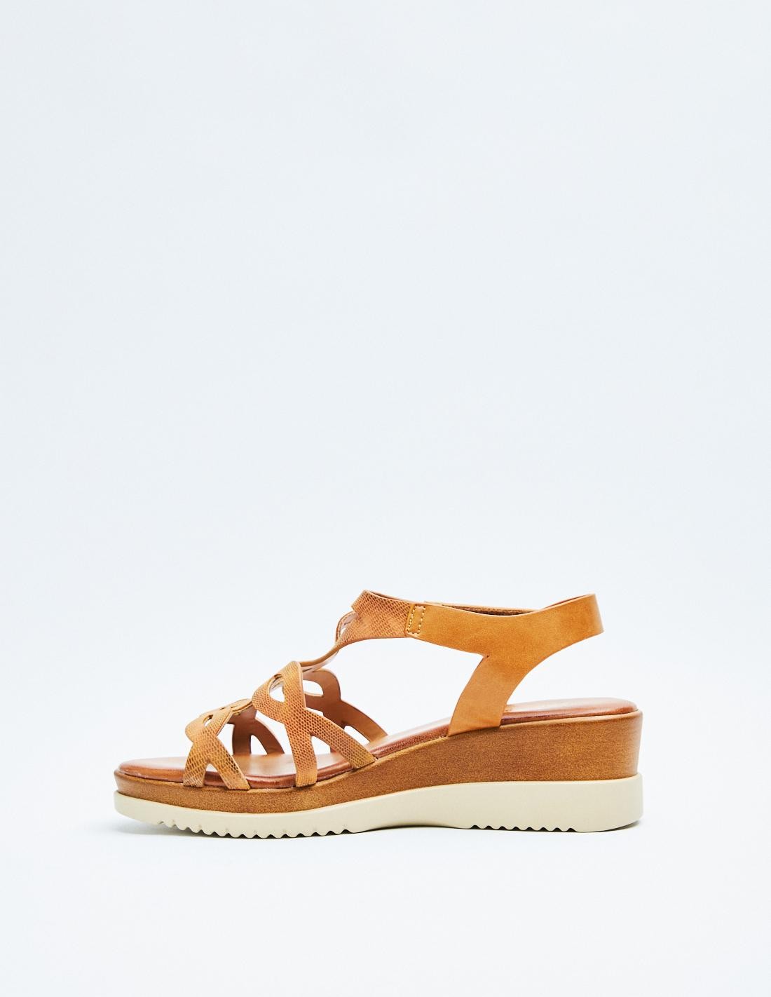 Sandalia plana tipo platafarma en efecto piel . Tira en la parte delantera. Cierre mediante hebilla en la pulsera del tobillo.Suela en combinación de materiales .