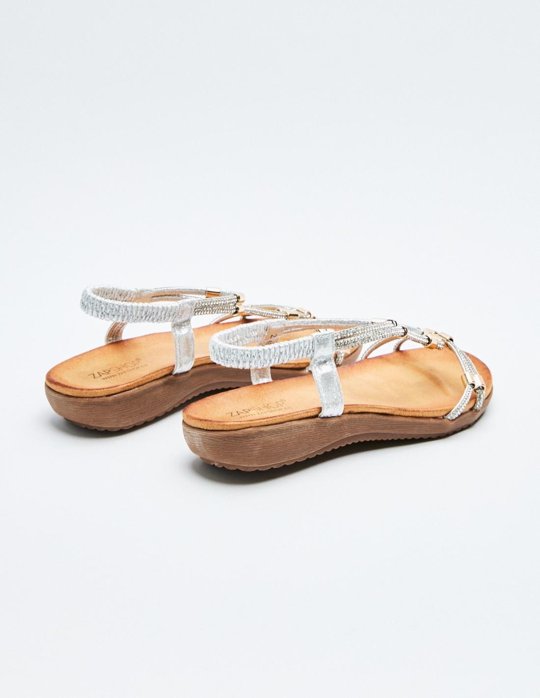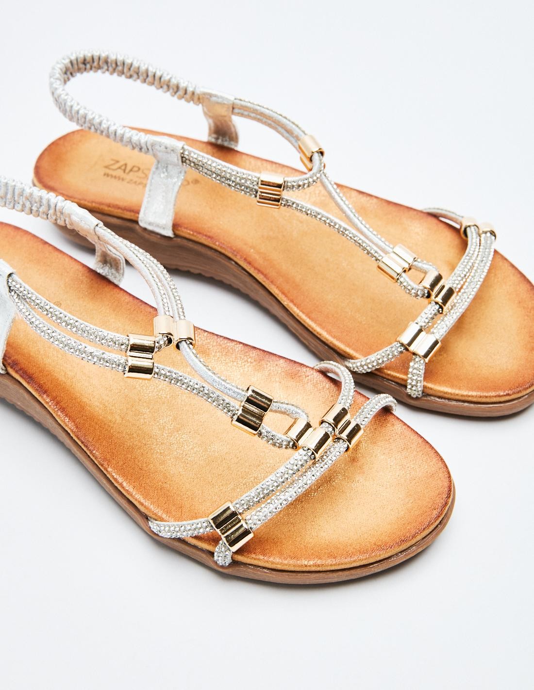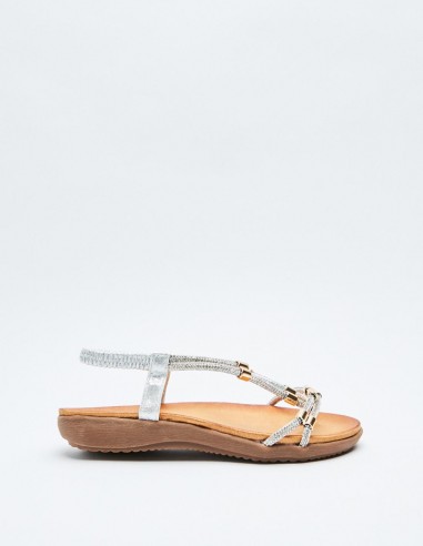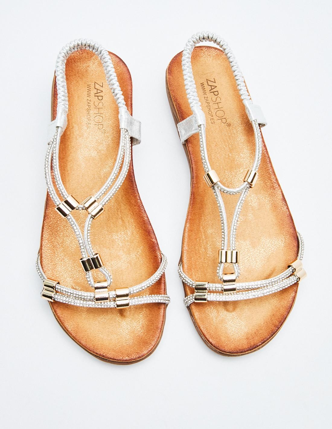 Zapato tipo sandalia plana en efecto metalizado . Detalle en cristales en la parte delantera. Acabado en punta redonda. Cierre mediante pulsera elastica en el tobillo. Altura de la suela: 2 cm.