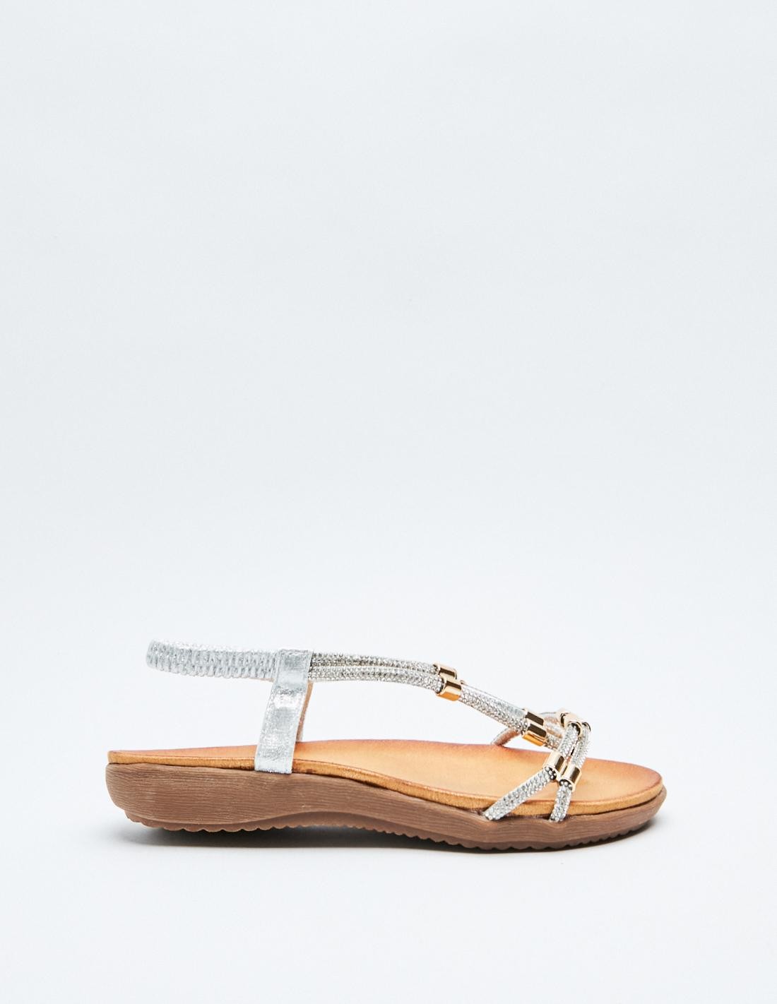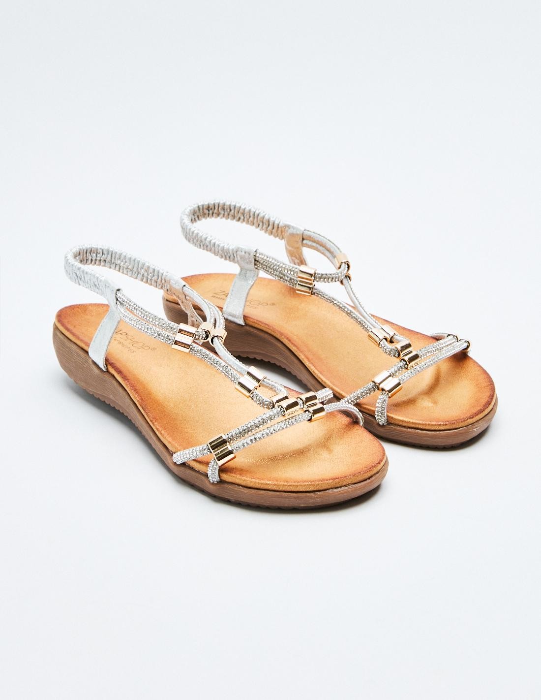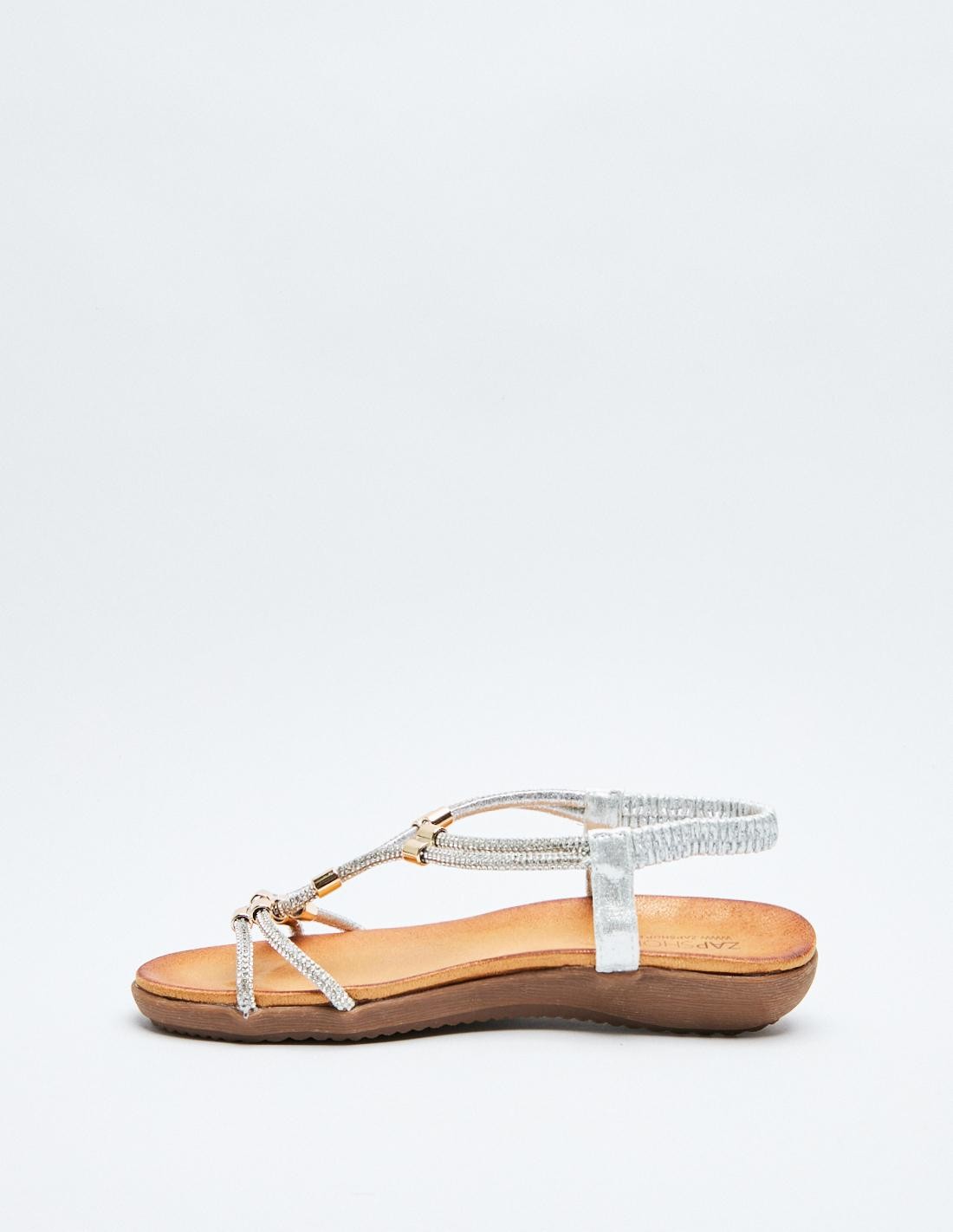 Zapato tipo sandalia plana en efecto metalizado . Detalle en cristales en la parte delantera. Acabado en punta redonda. Cierre mediante pulsera elastica en el tobillo. Altura de la suela: 2 cm.