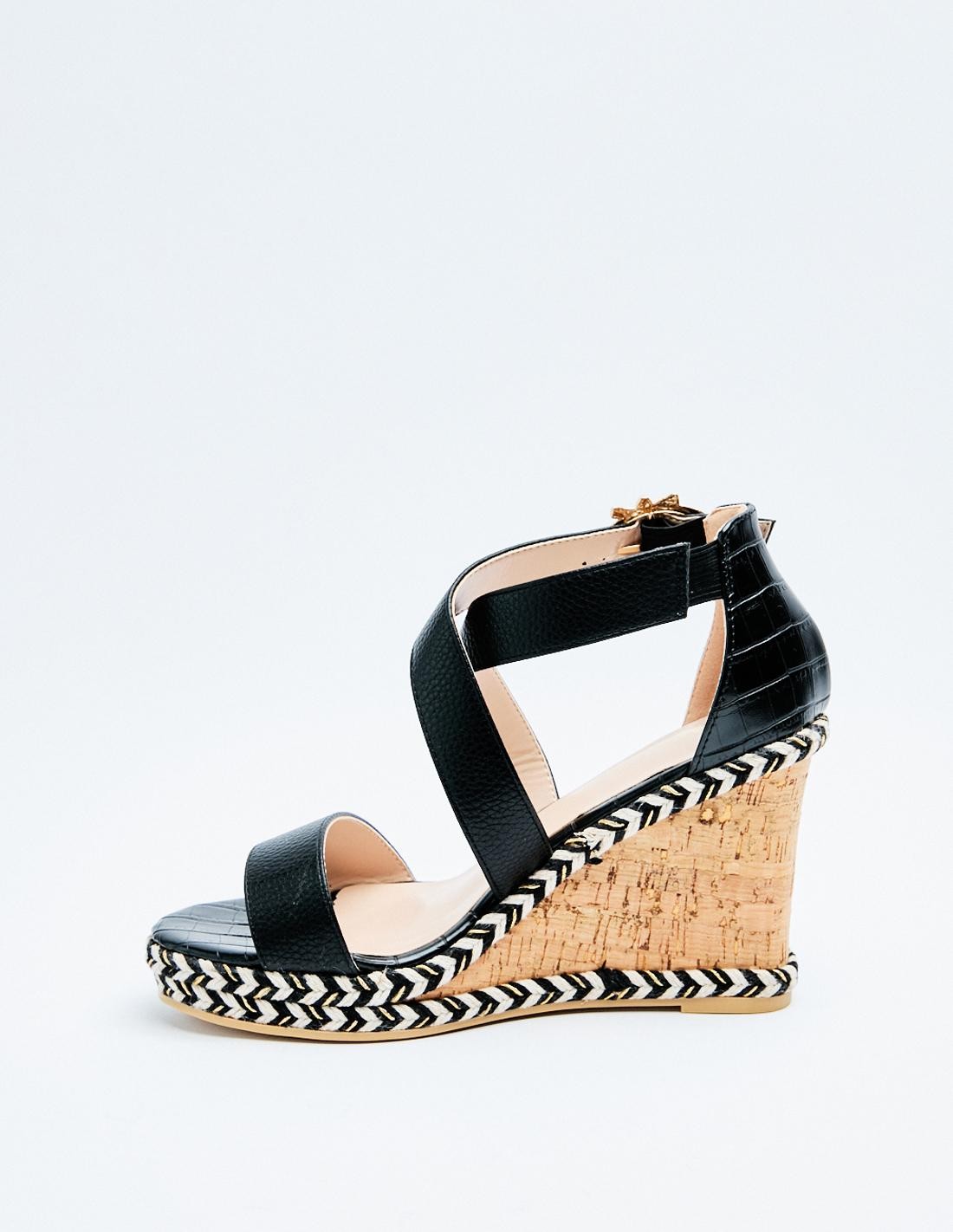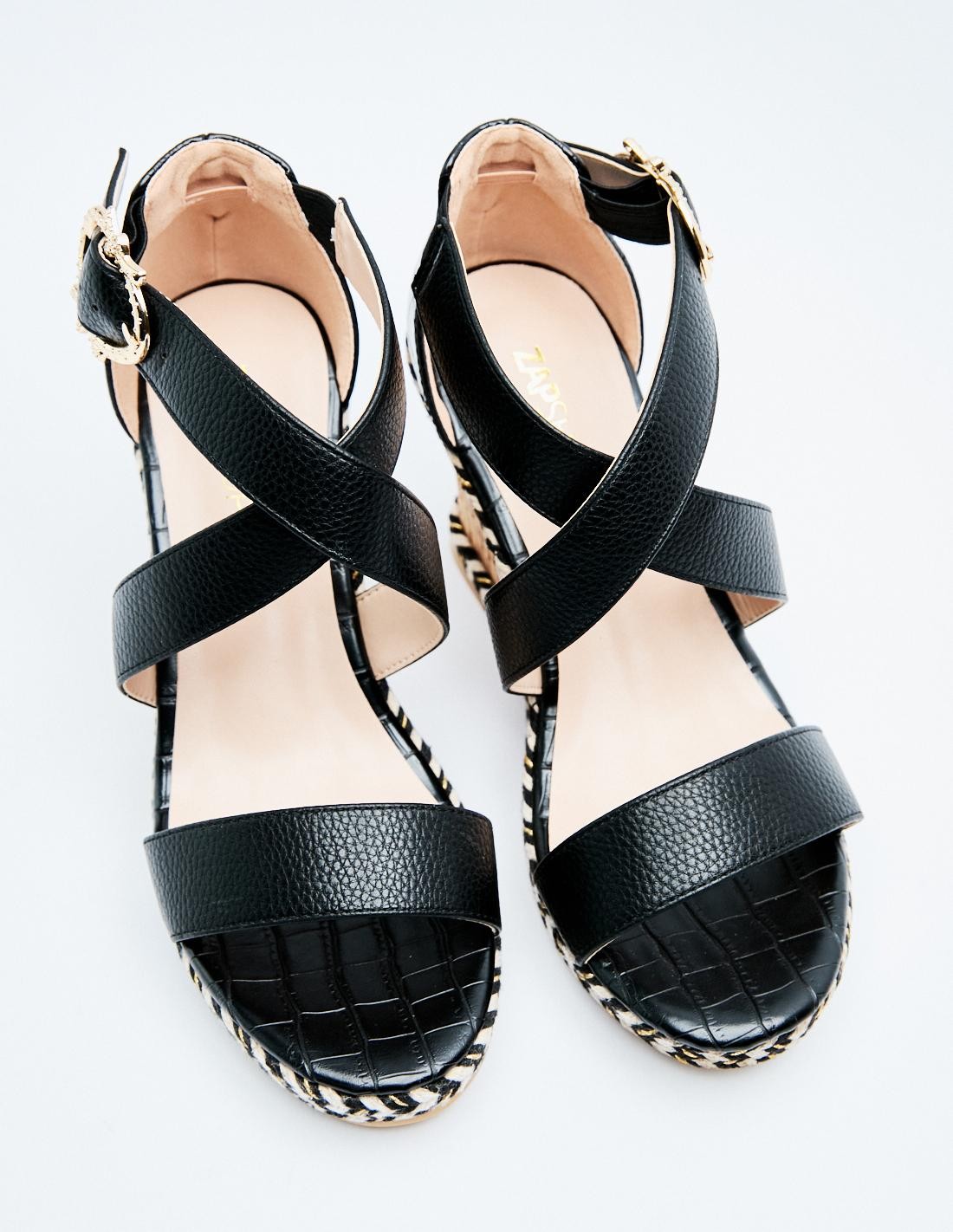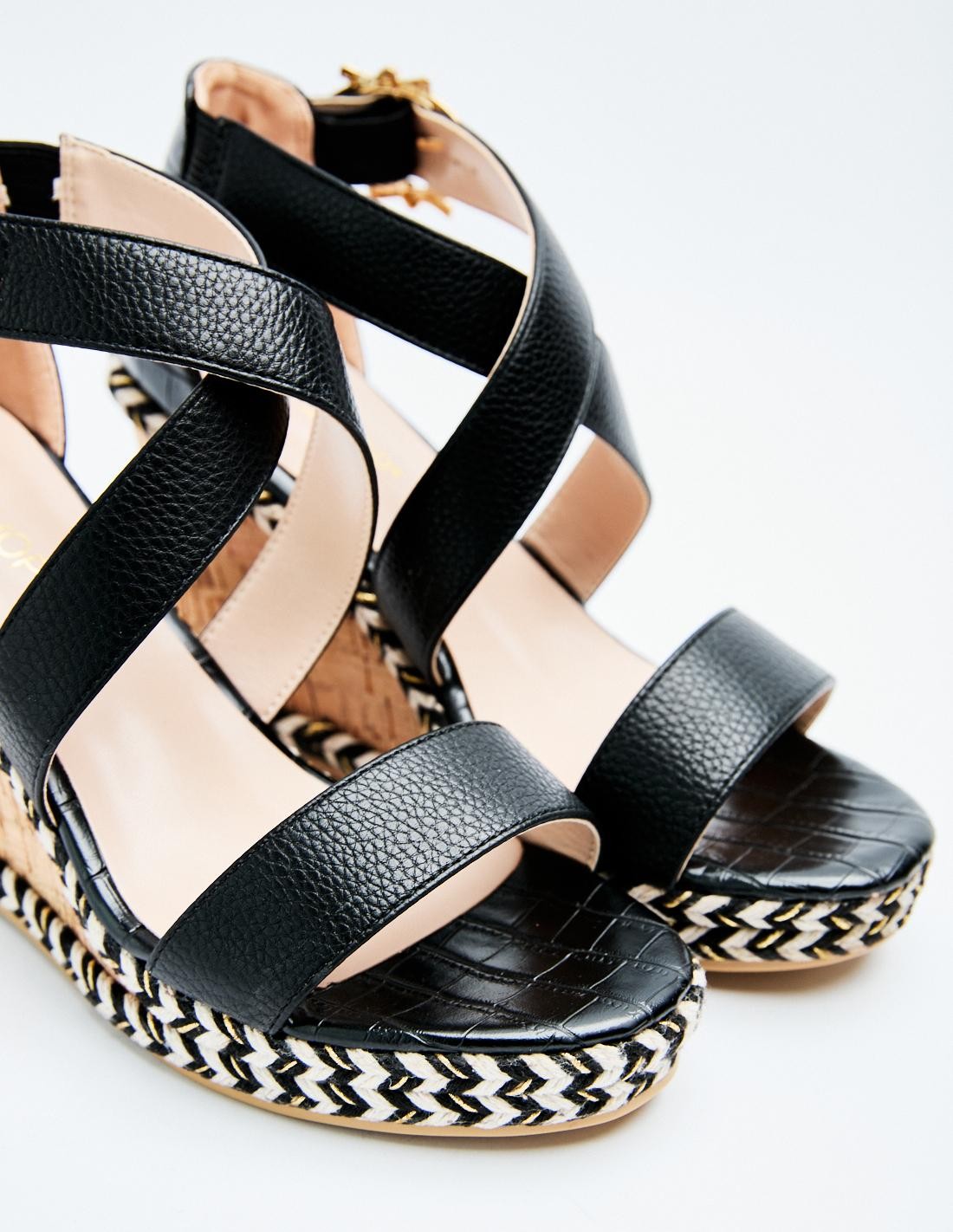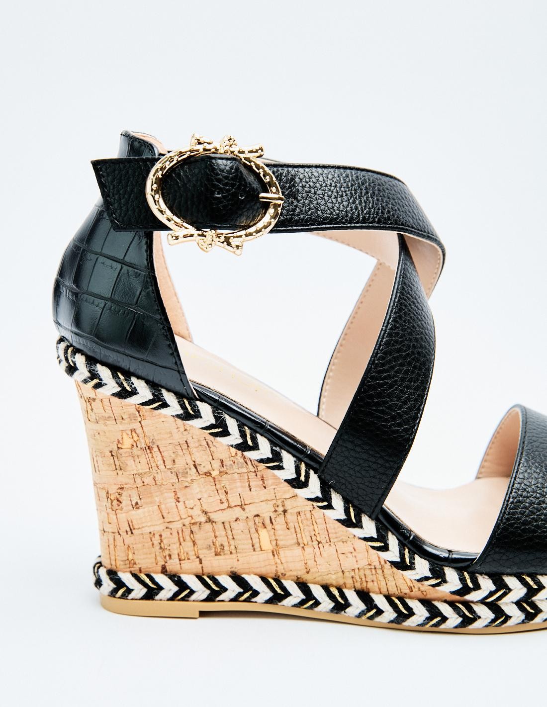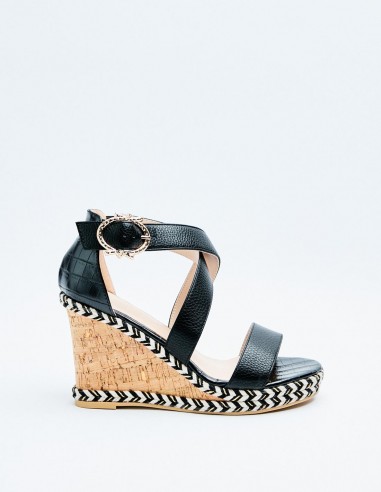 Zapato tipo sandalia con tiras. Efecto piel. Tacón en forma de cuña. Cierre mediante hebilla en la pulsera del tobillo. Altura del tacón: 8,8 cm.