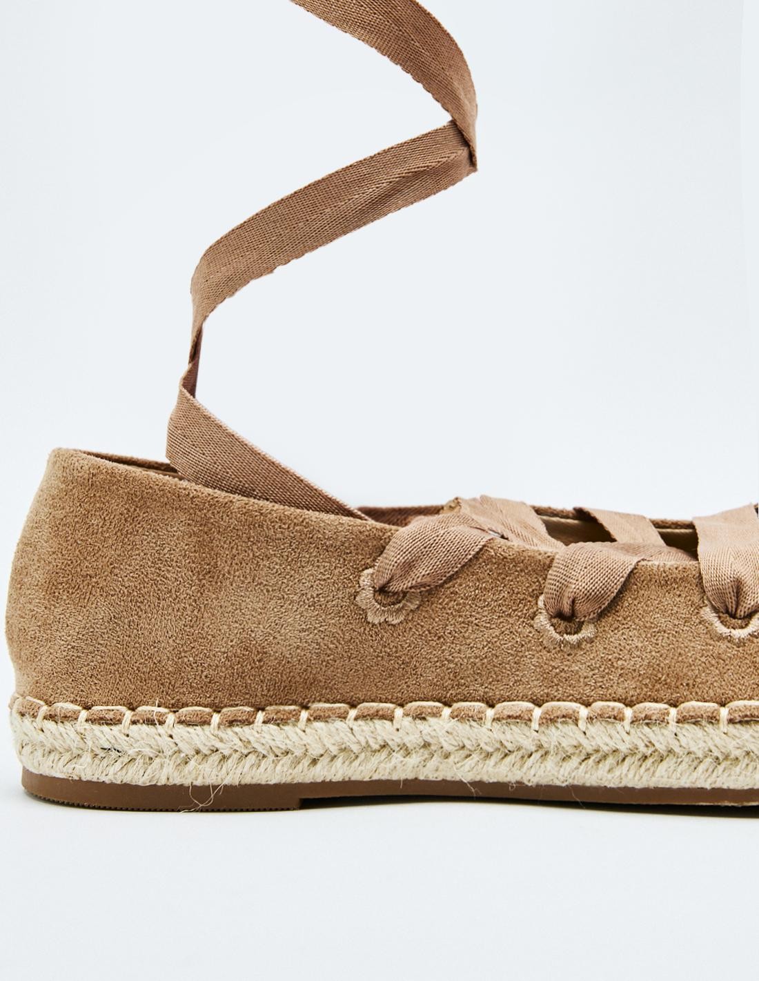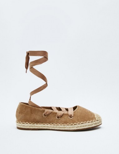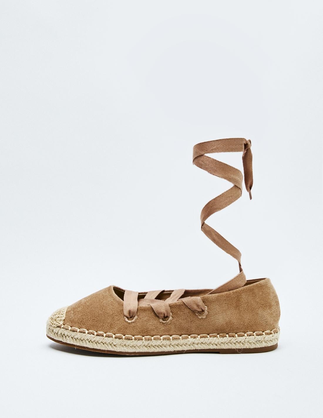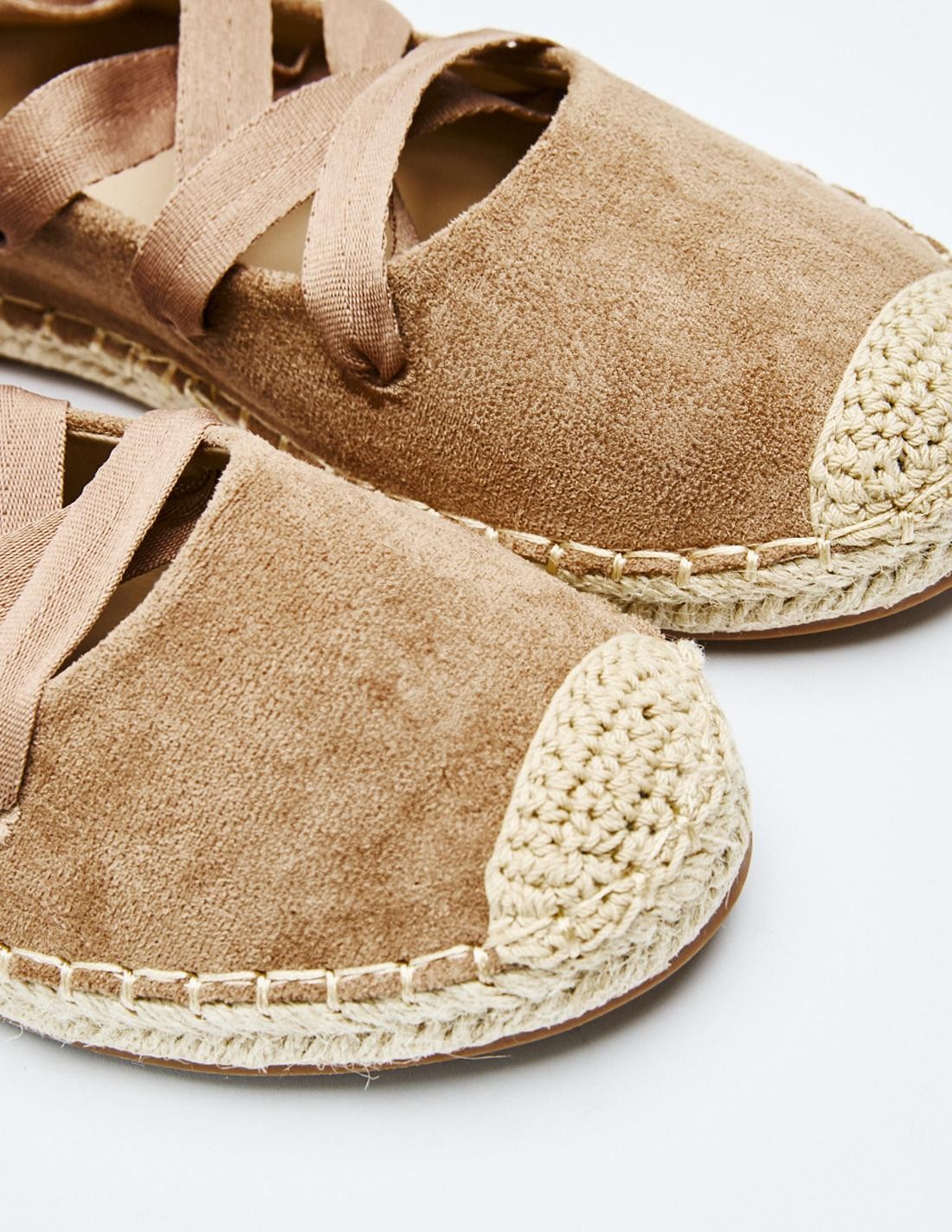 Zapato tipo alpargata en combinación de materiales. Tiras de tejido para atar al tobillo.