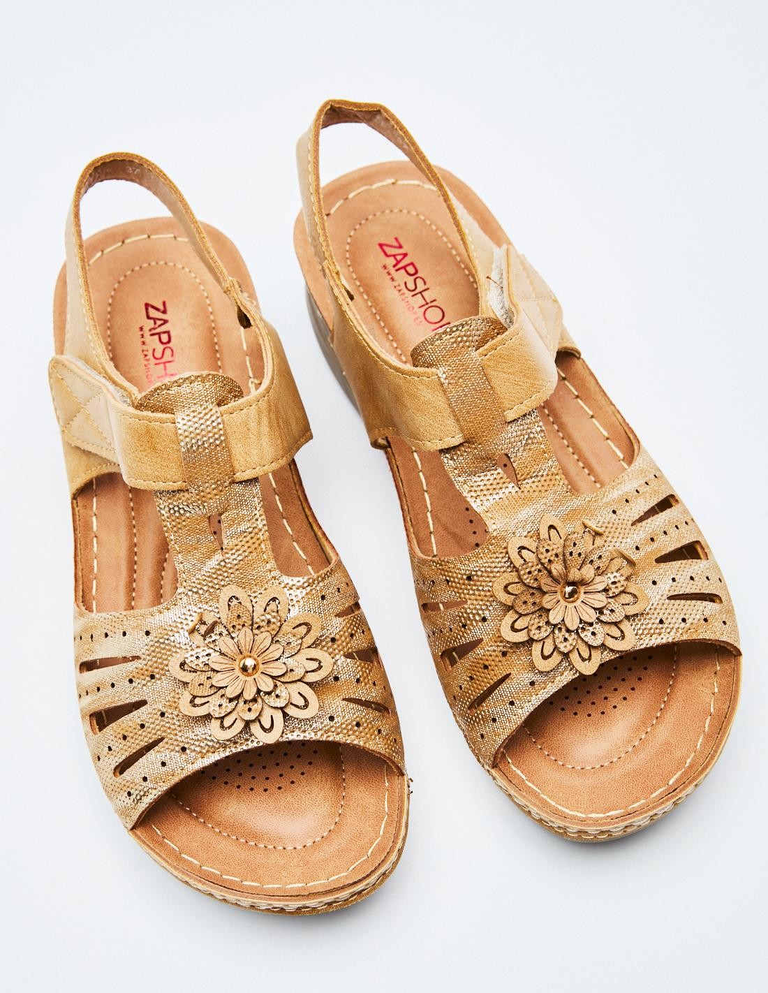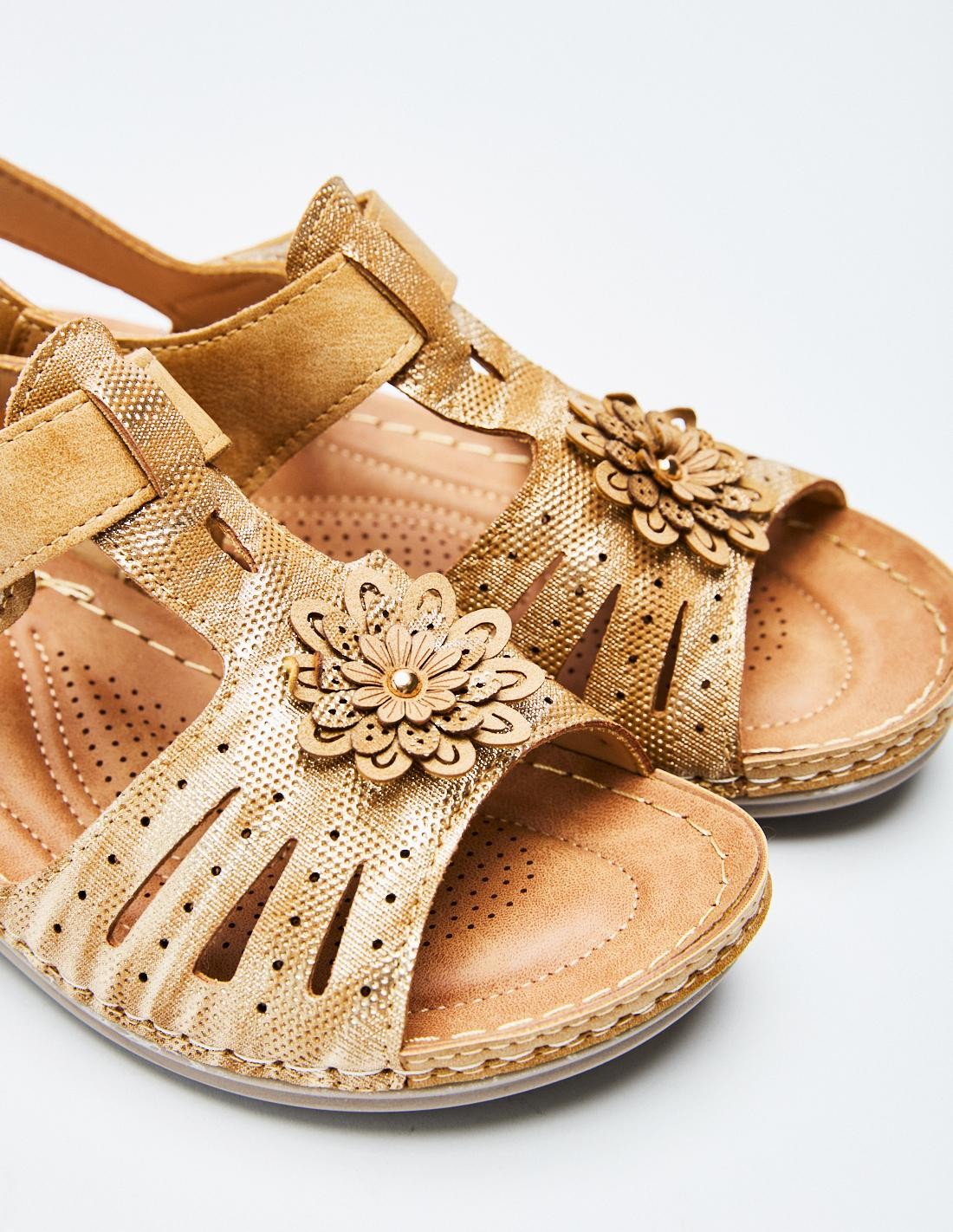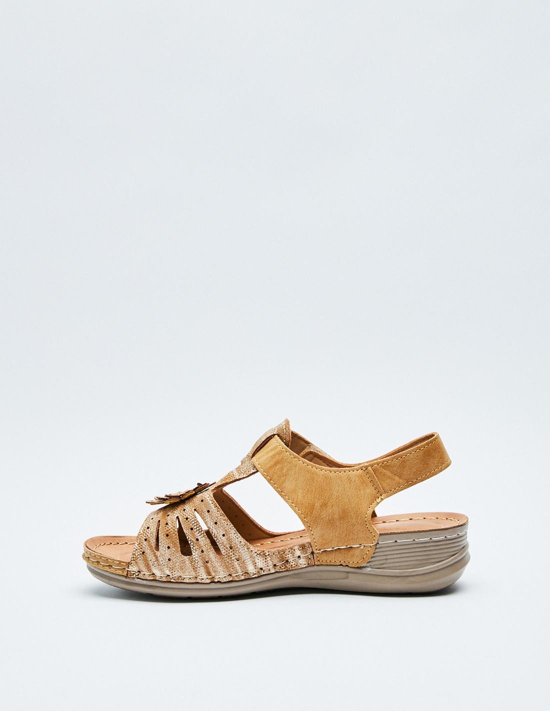 Sandalia plana en efecto piel con tira adhesivas trasera. Suela de goma combinada. Altura de la suela: 2,8 cm.