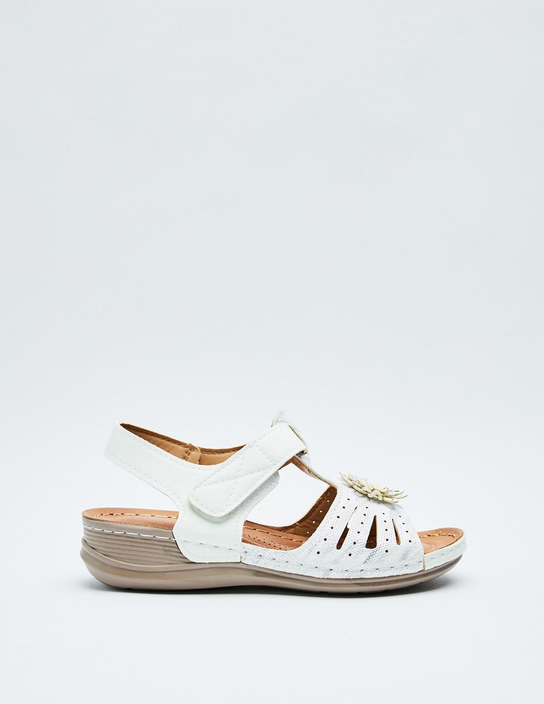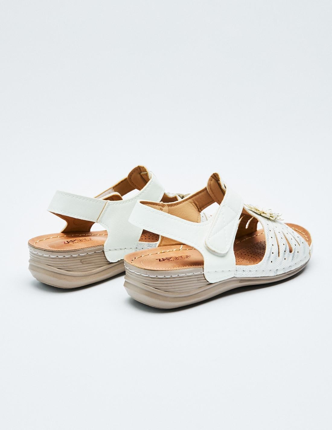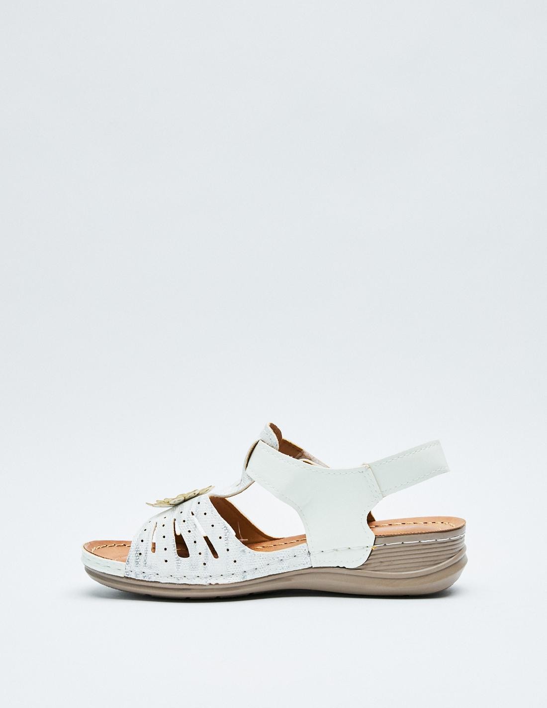 Sandalia plana en efecto piel con tira adhesivas trasera. Suela de goma combinada.