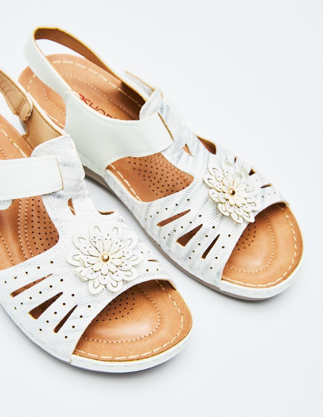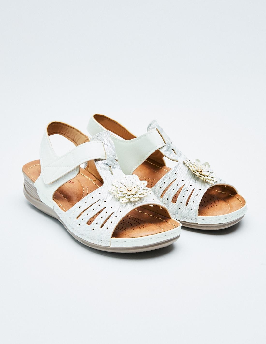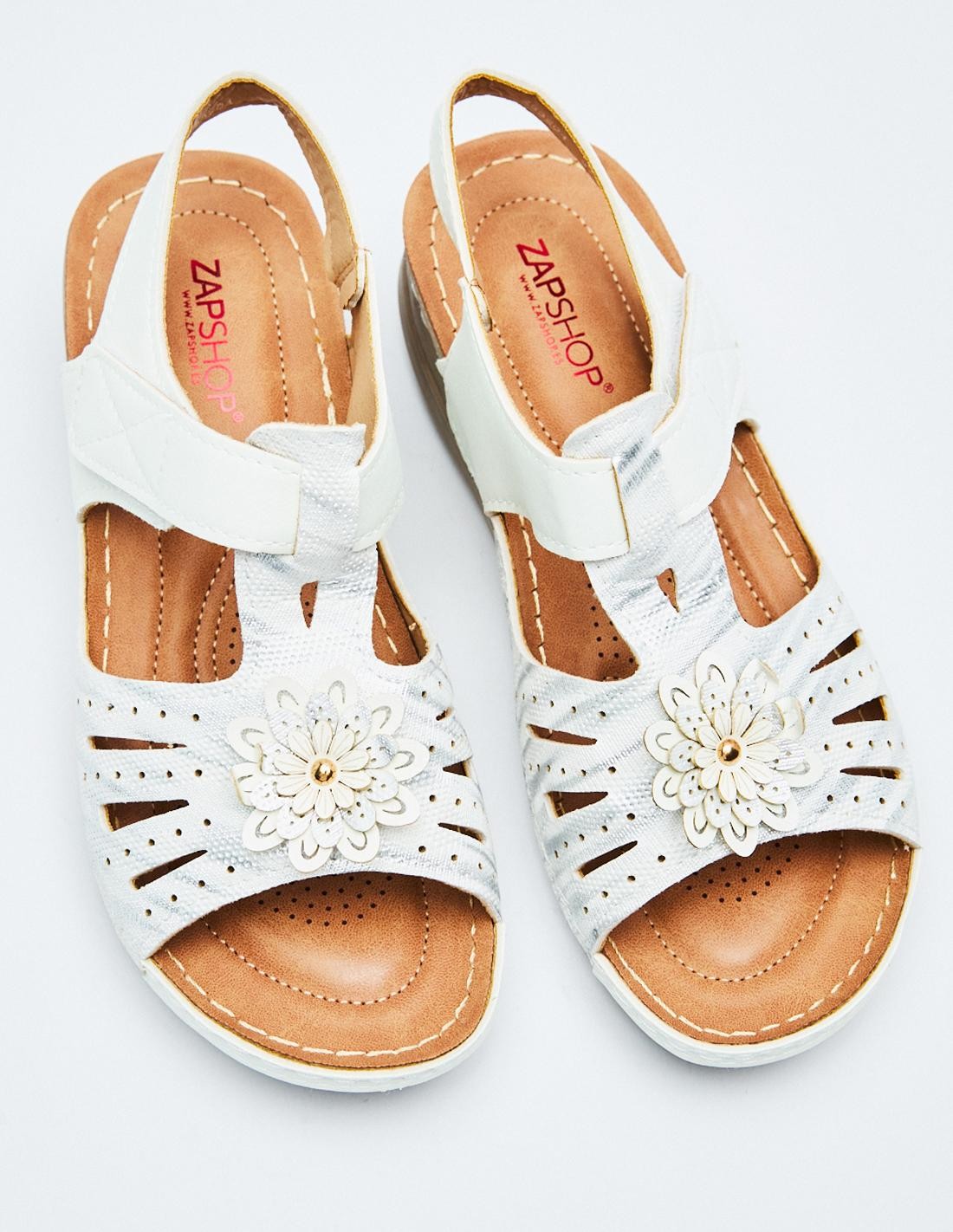 Sandalia plana en efecto piel con tira adhesivas trasera. Suela de goma combinada.
