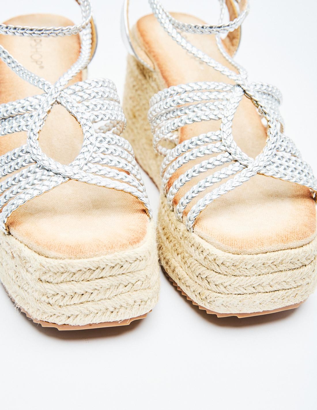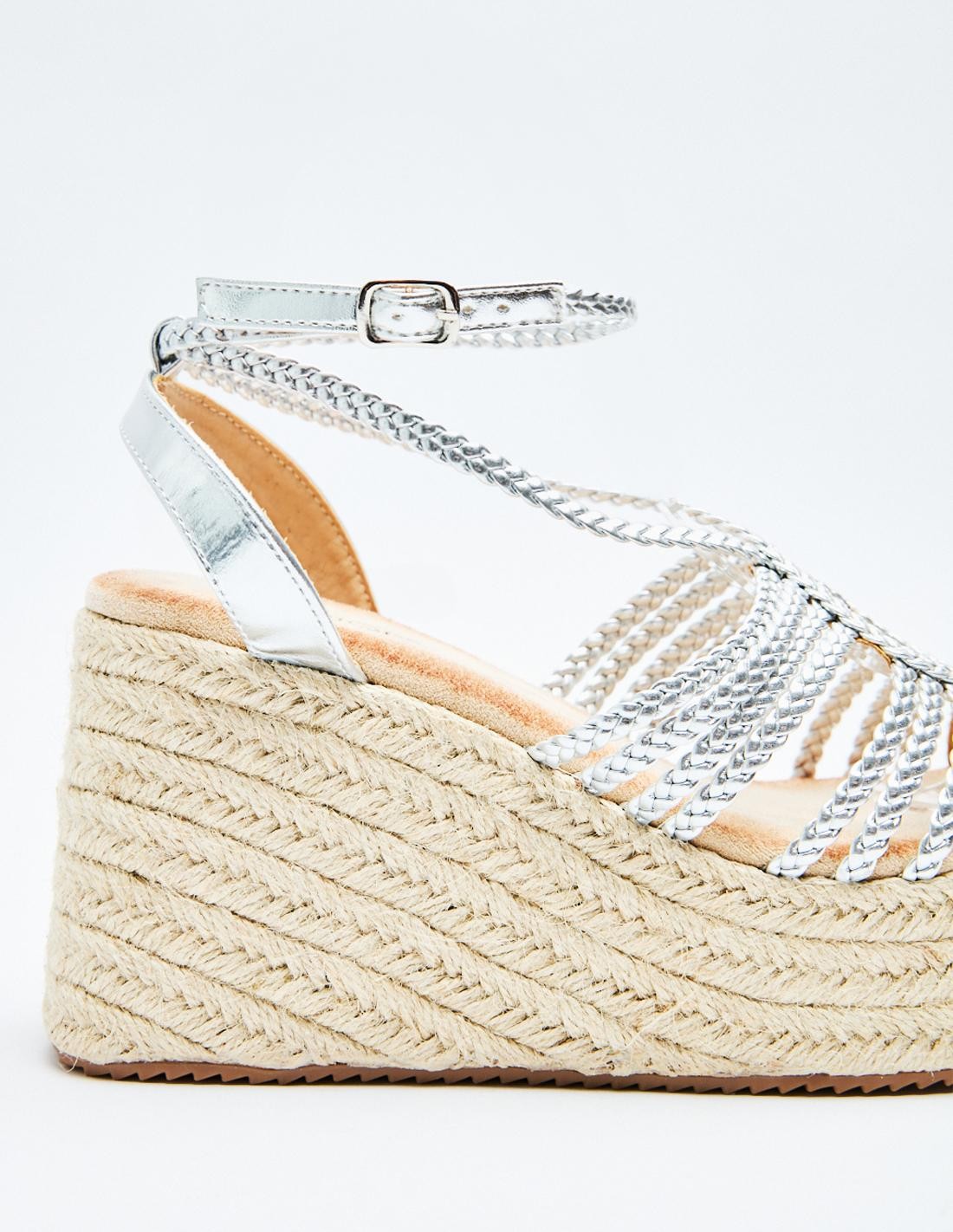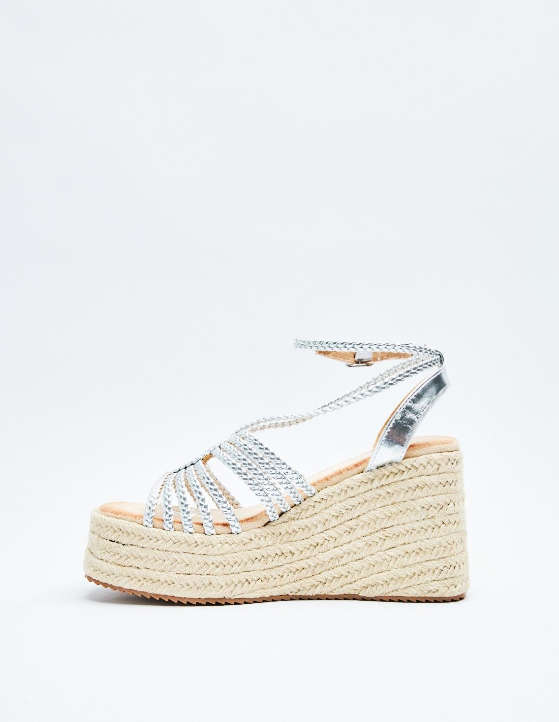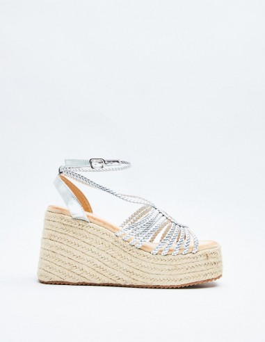 Zapato tipo sandalia con esparto y plataforma efecto metalizado . Cierre mediante hebilla en la pulsera al tobillo. Acabado en punta cuadrada.