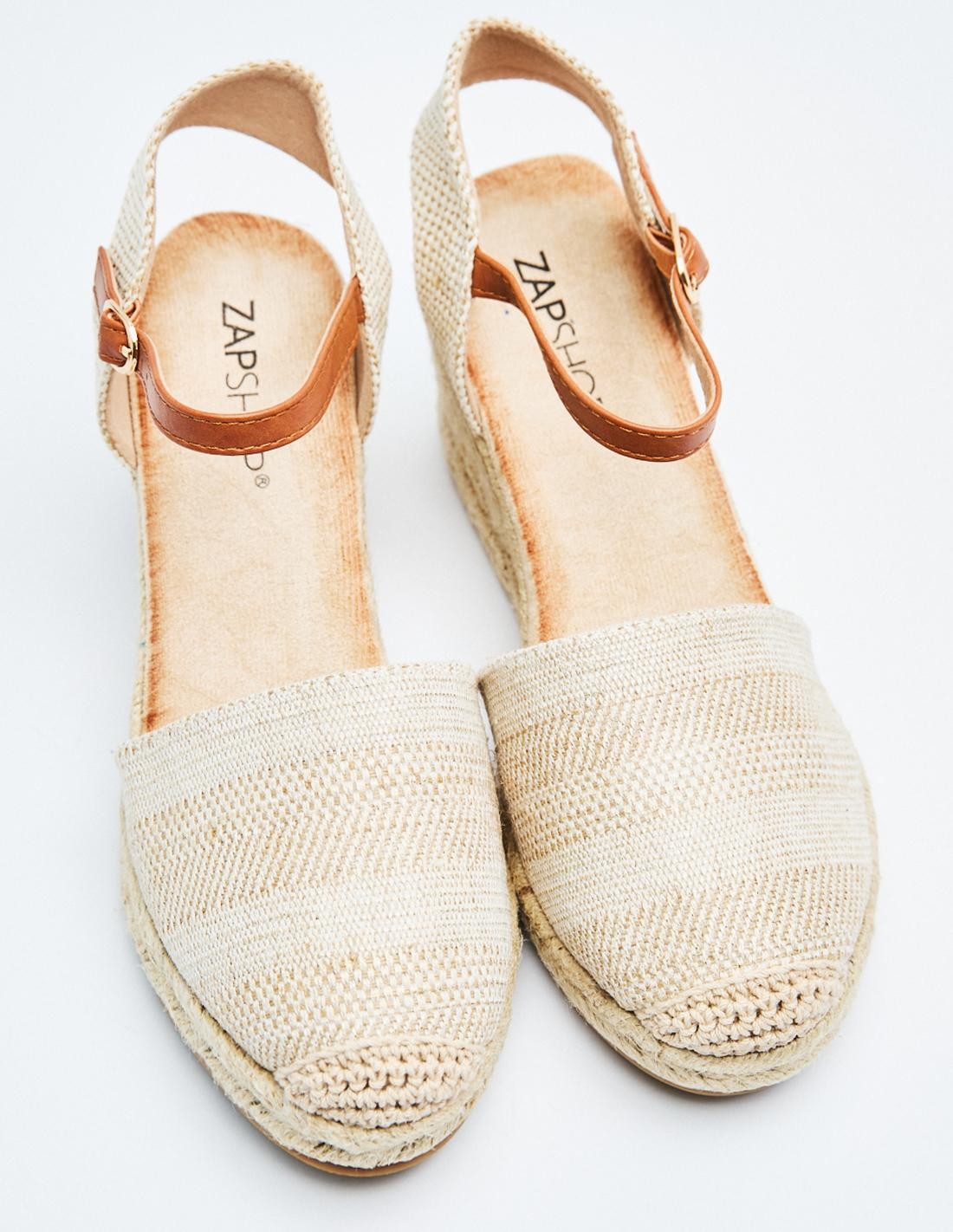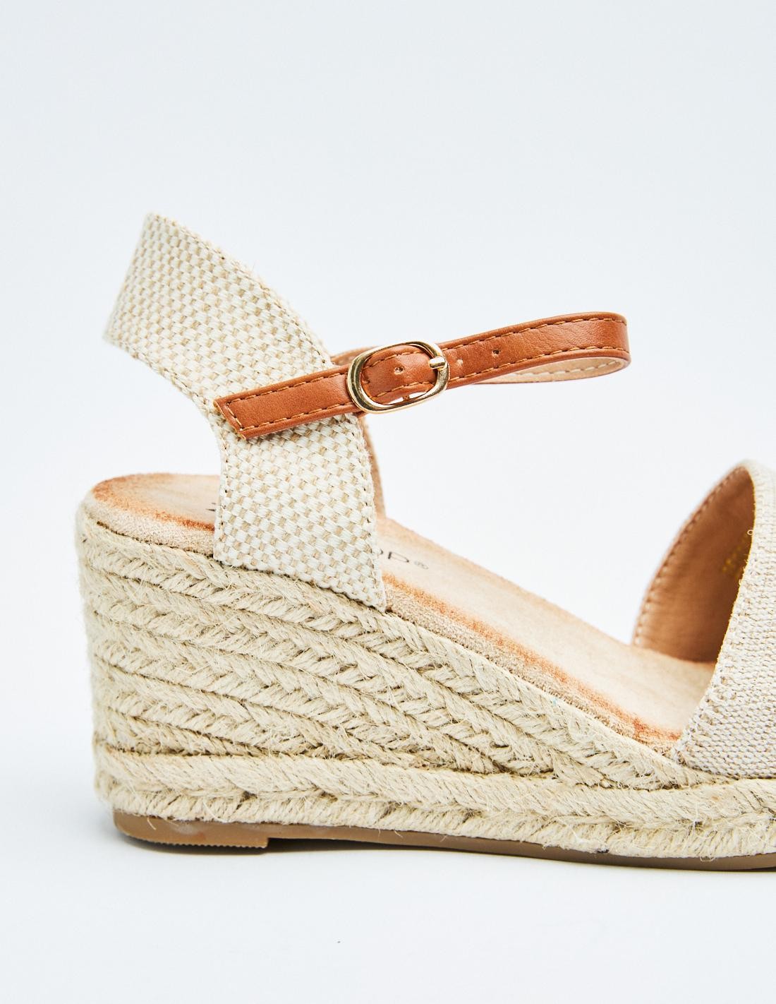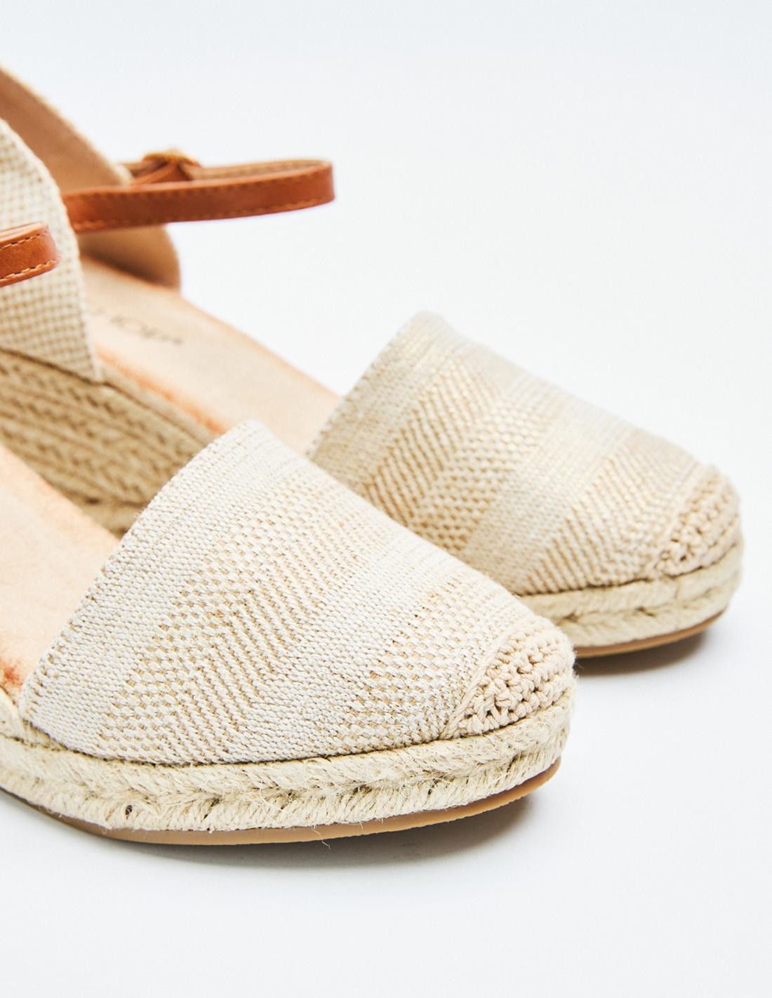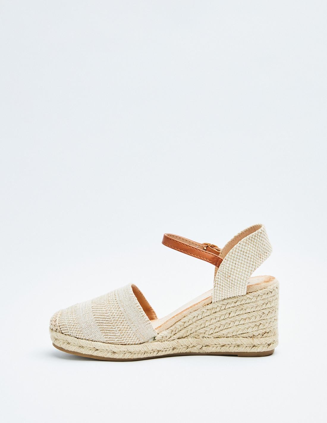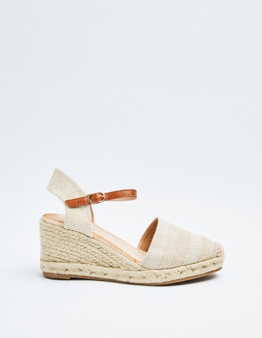 Alpargata tipo cuña con diseño tejido . Suela forrada de yute. Cierre mediante pulsera en el tobillo .