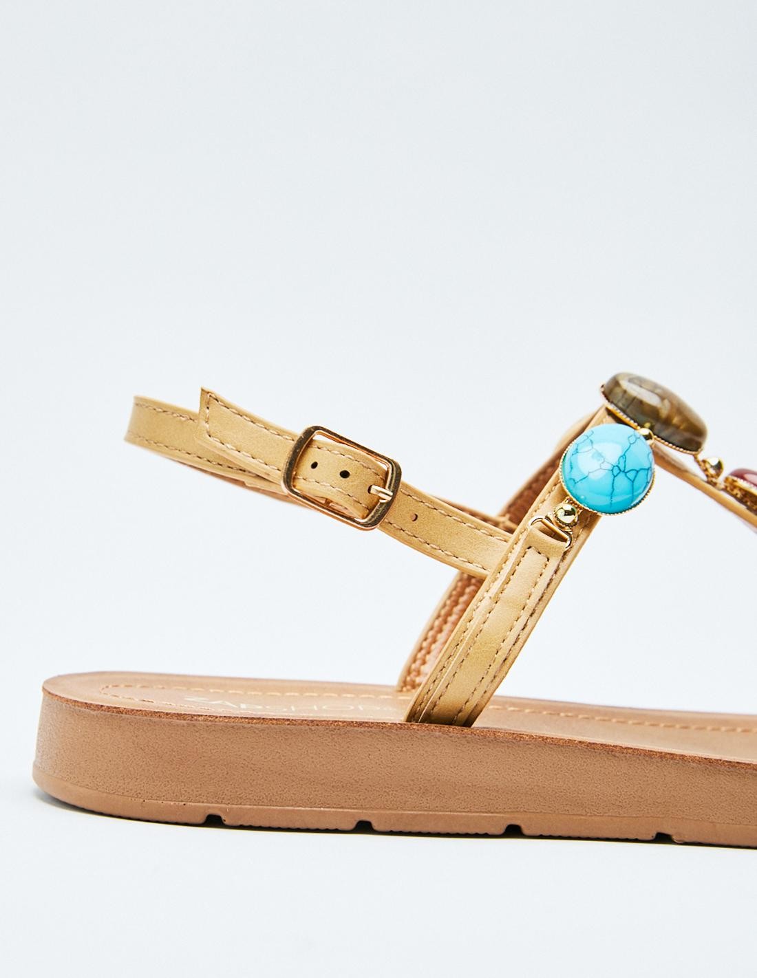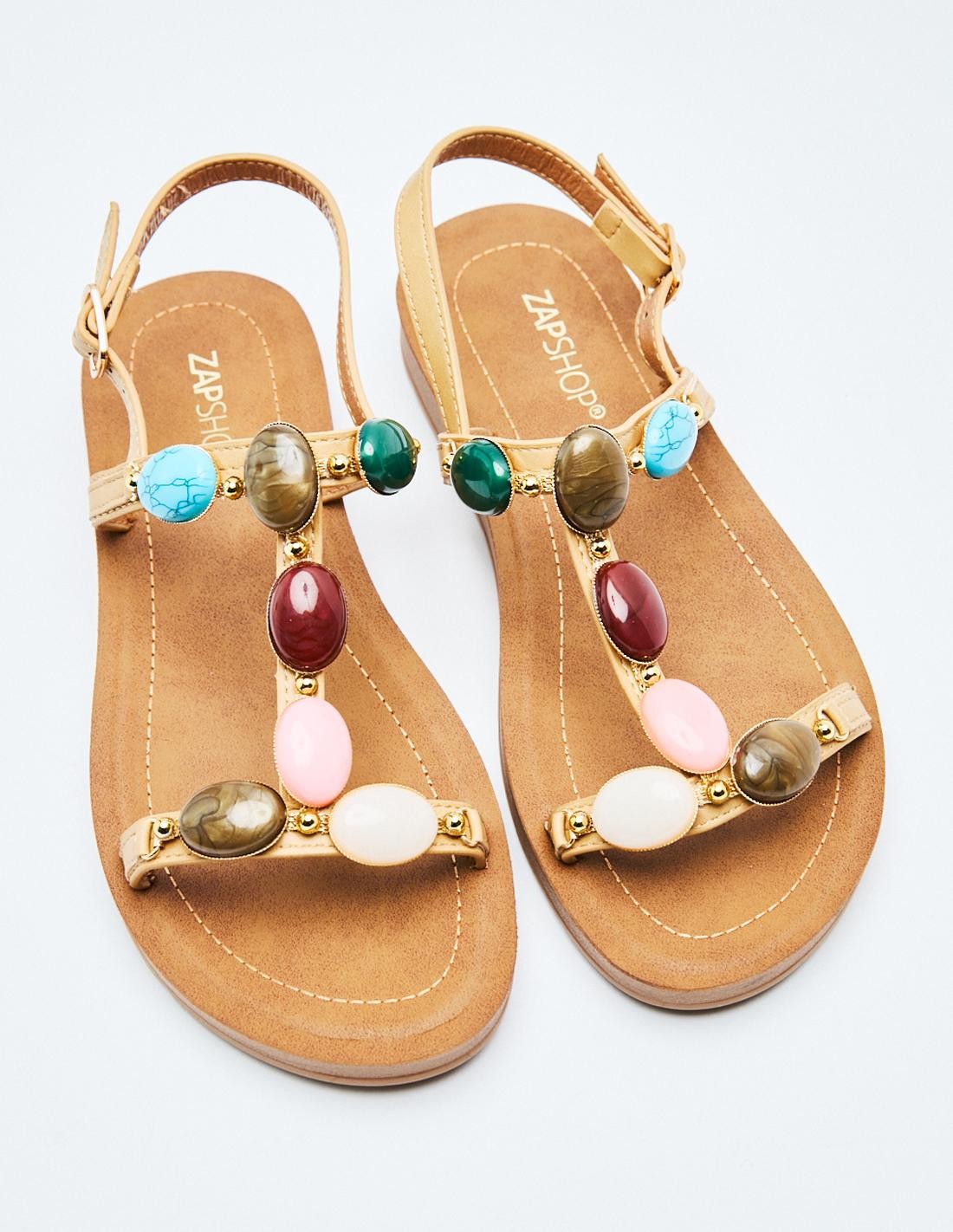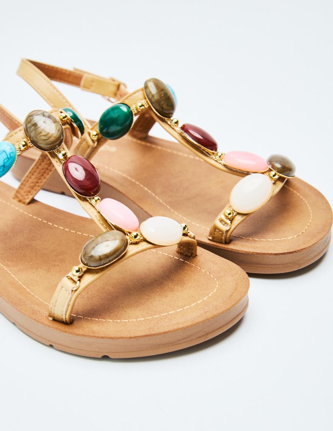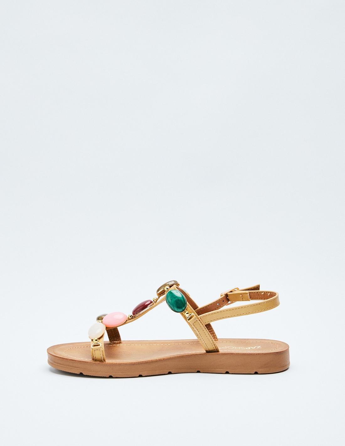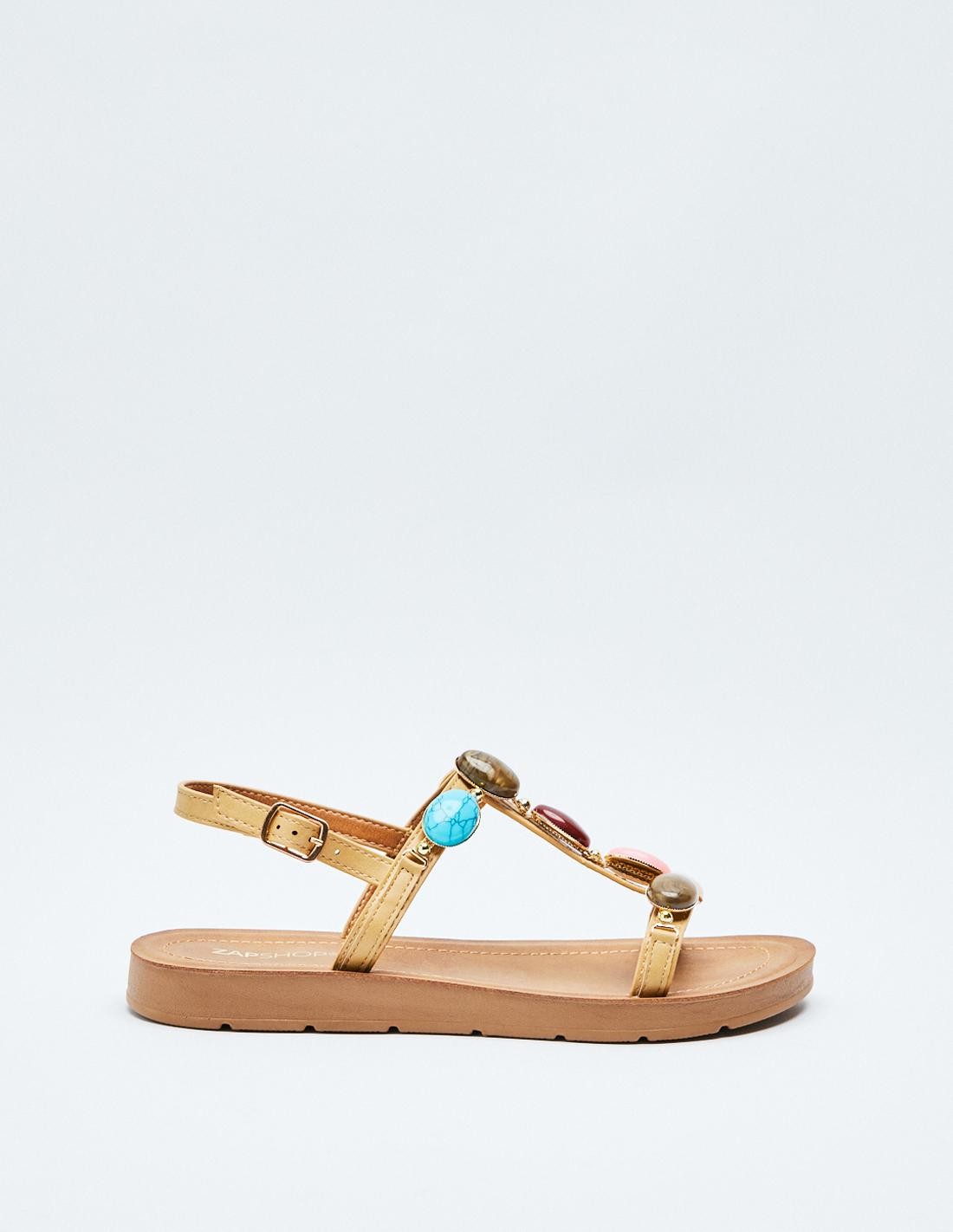 Sandalia plana efecto piel. Detalle de piedars de colores en la parte delantera. suela plana de goma . Cierre mediante pulsera. Altura de la suela: 1 cm.
