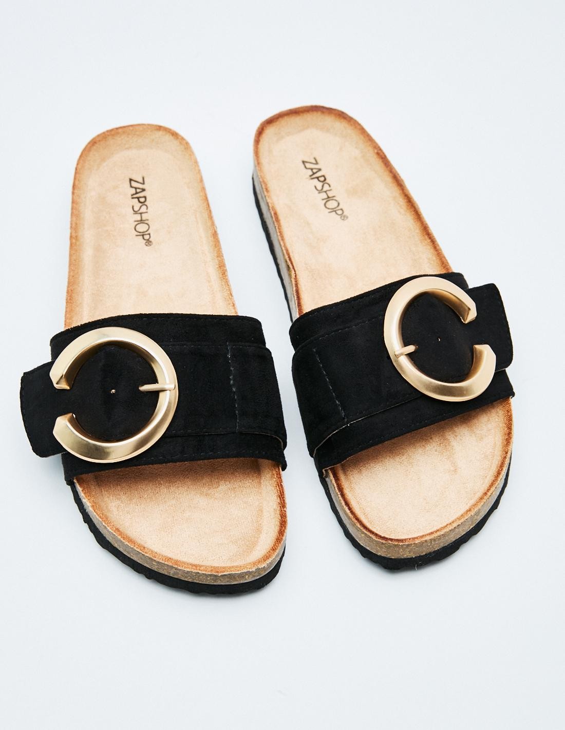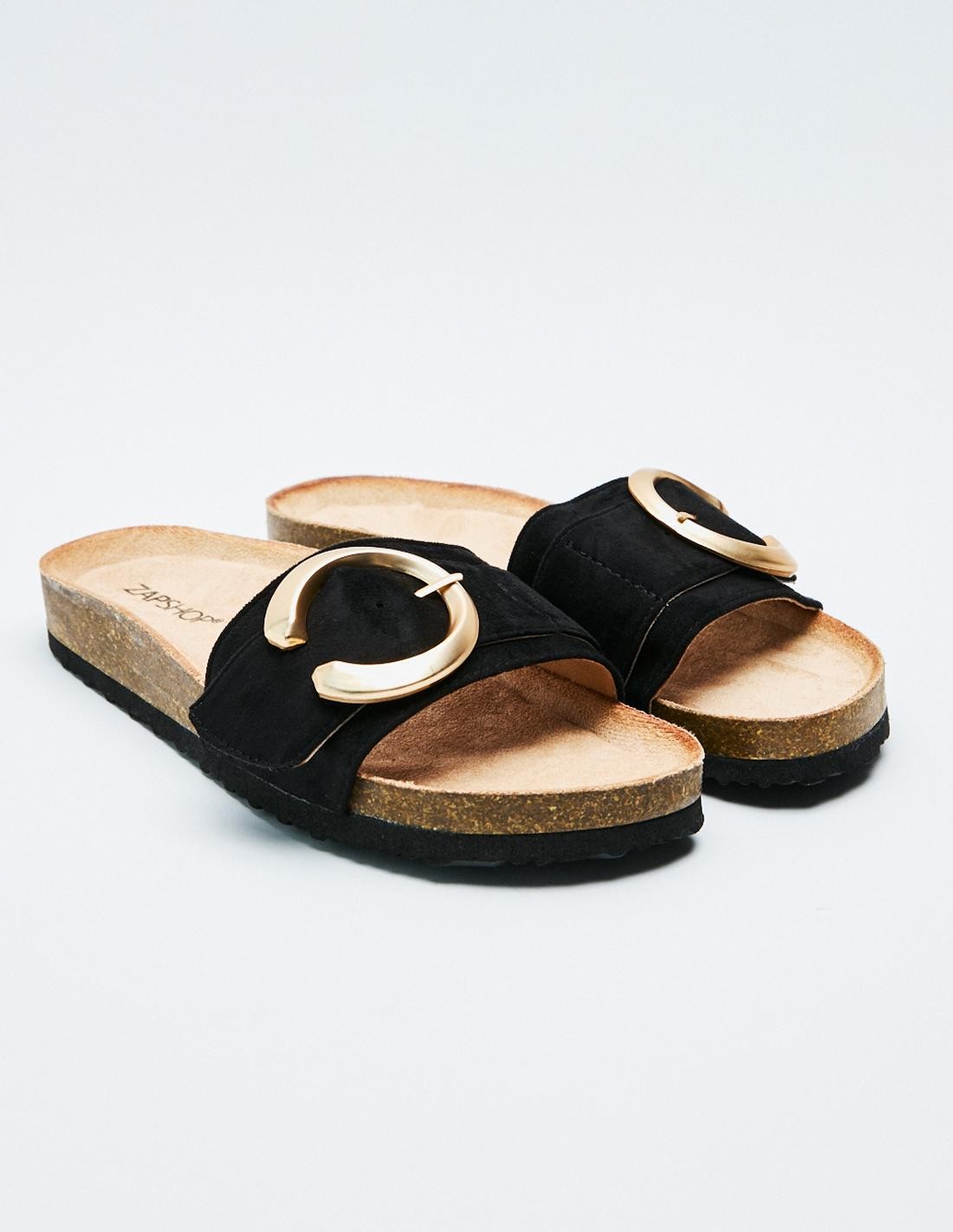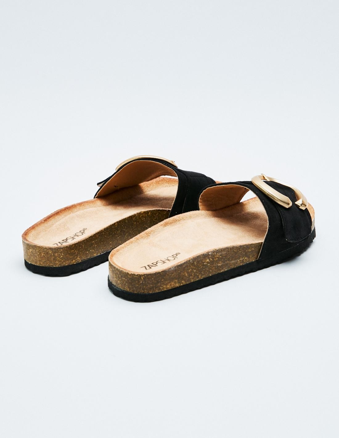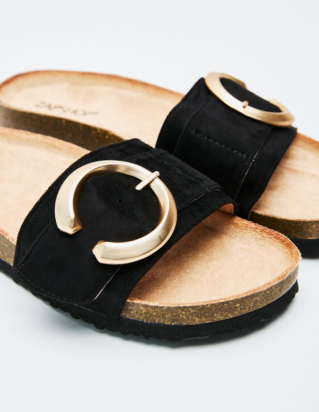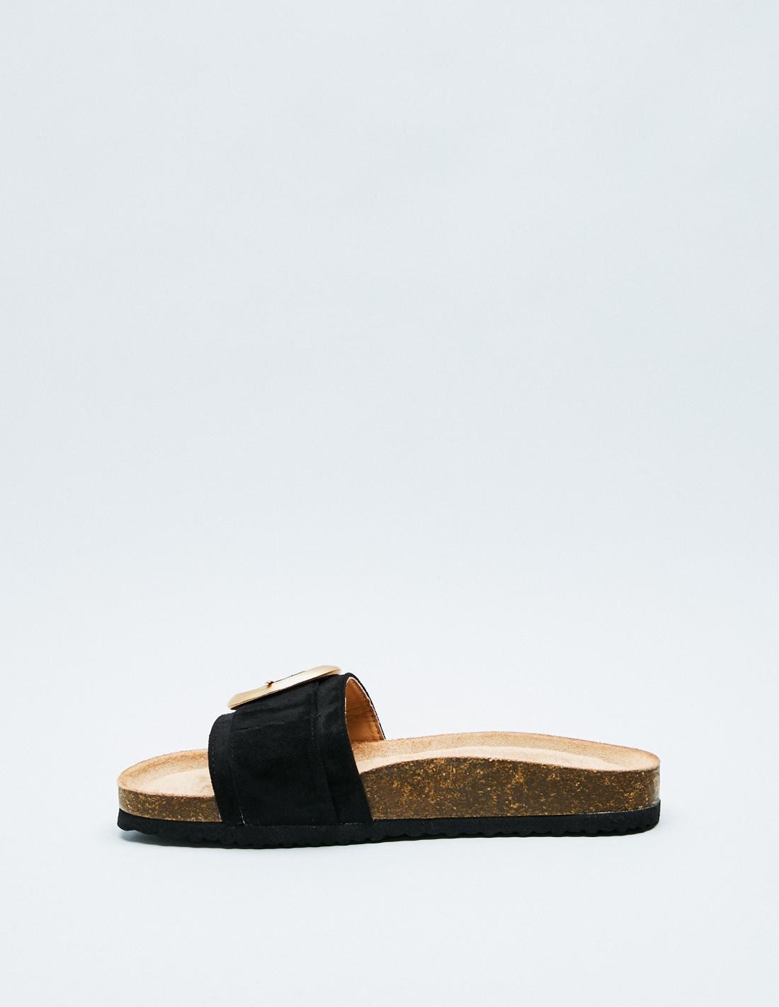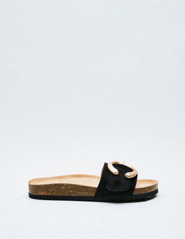 Zapato plano tipo sandalia en efecto serraje. Tira gruesa delantera con hebilla en la parte delantera. Acabado en punta redonda.