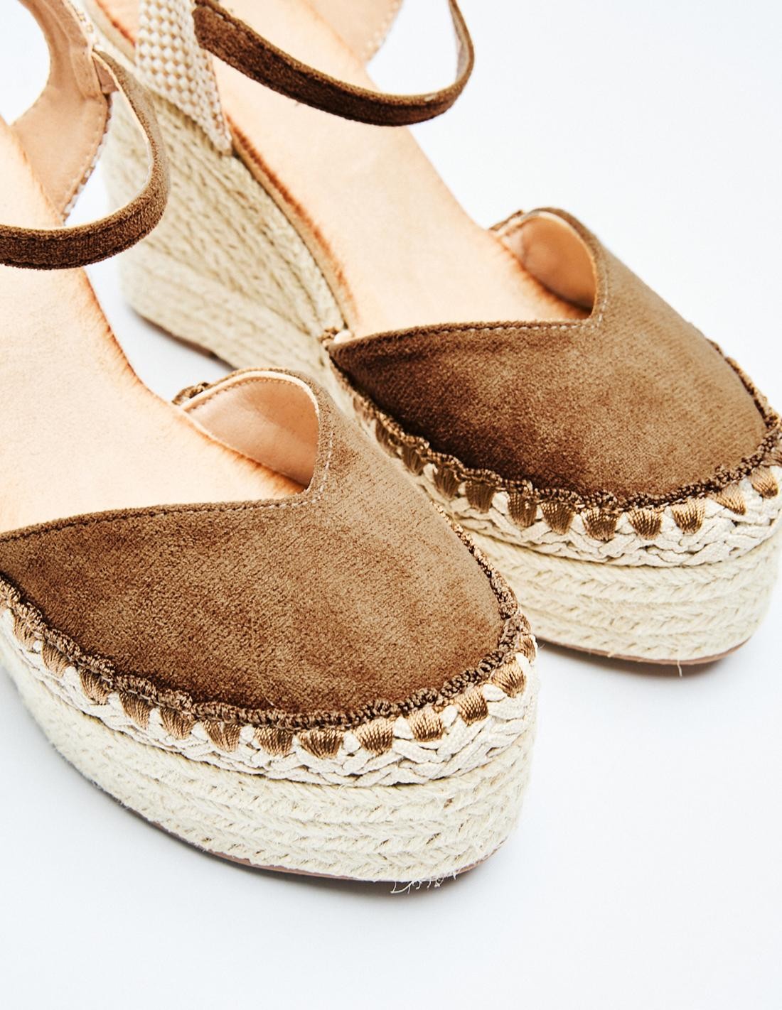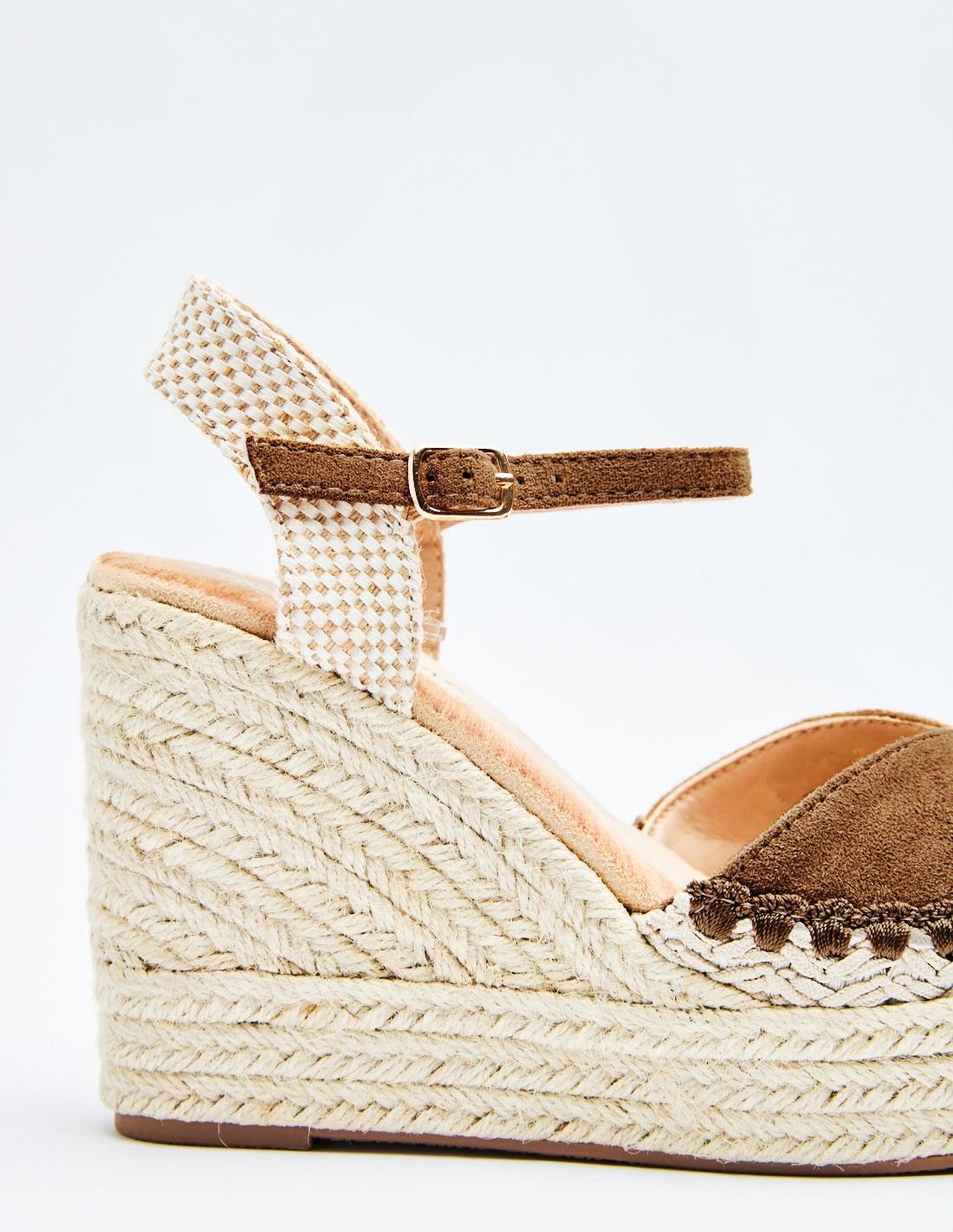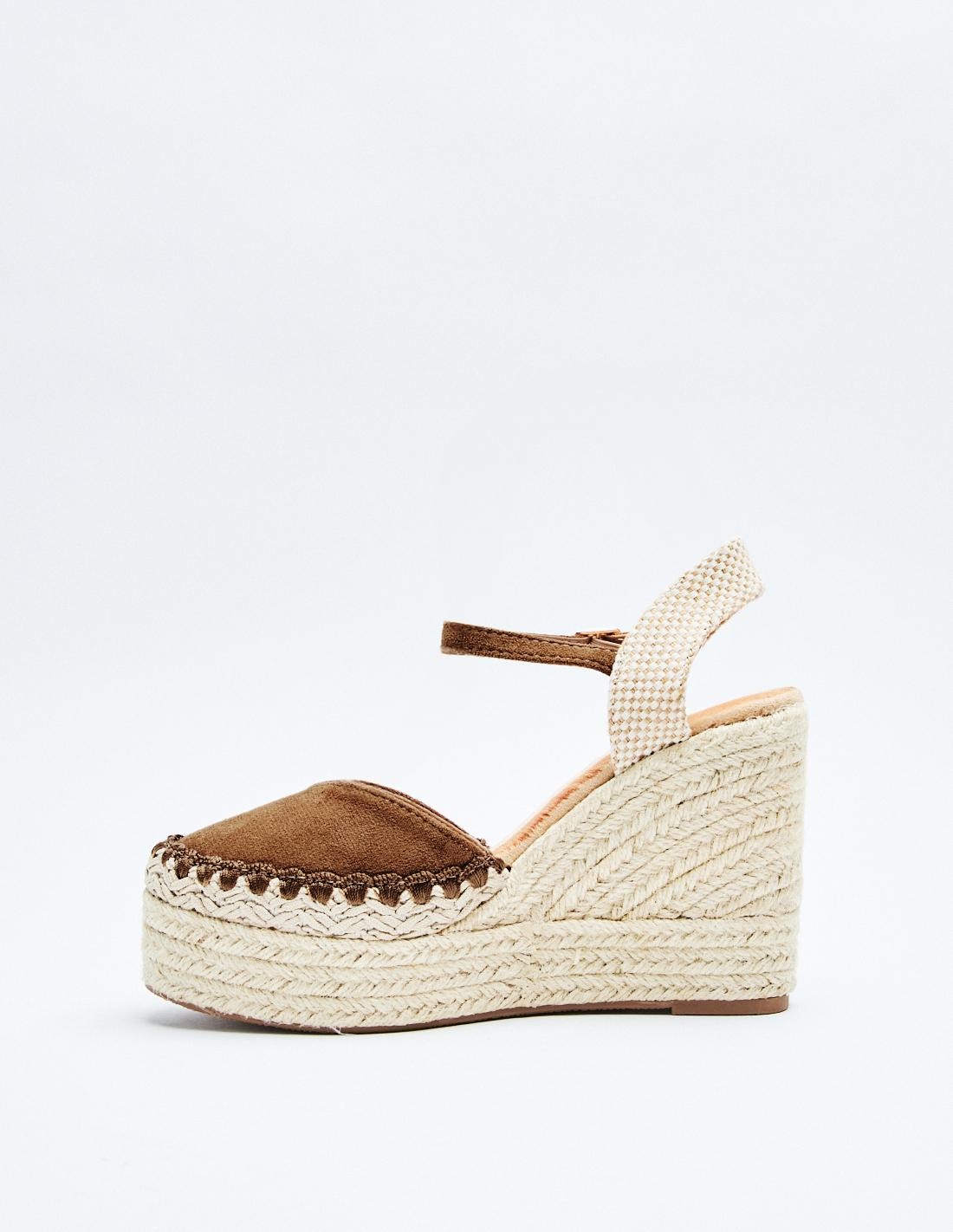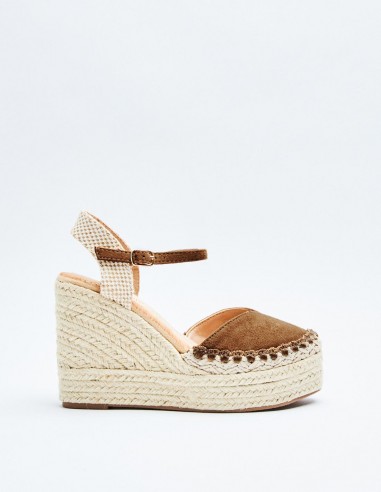 Alpargata tipo cuña con material en efecto serraje y esparto . Suela de yute. Cierre mediante tira con hebilla en la pulsera al tobillo.
