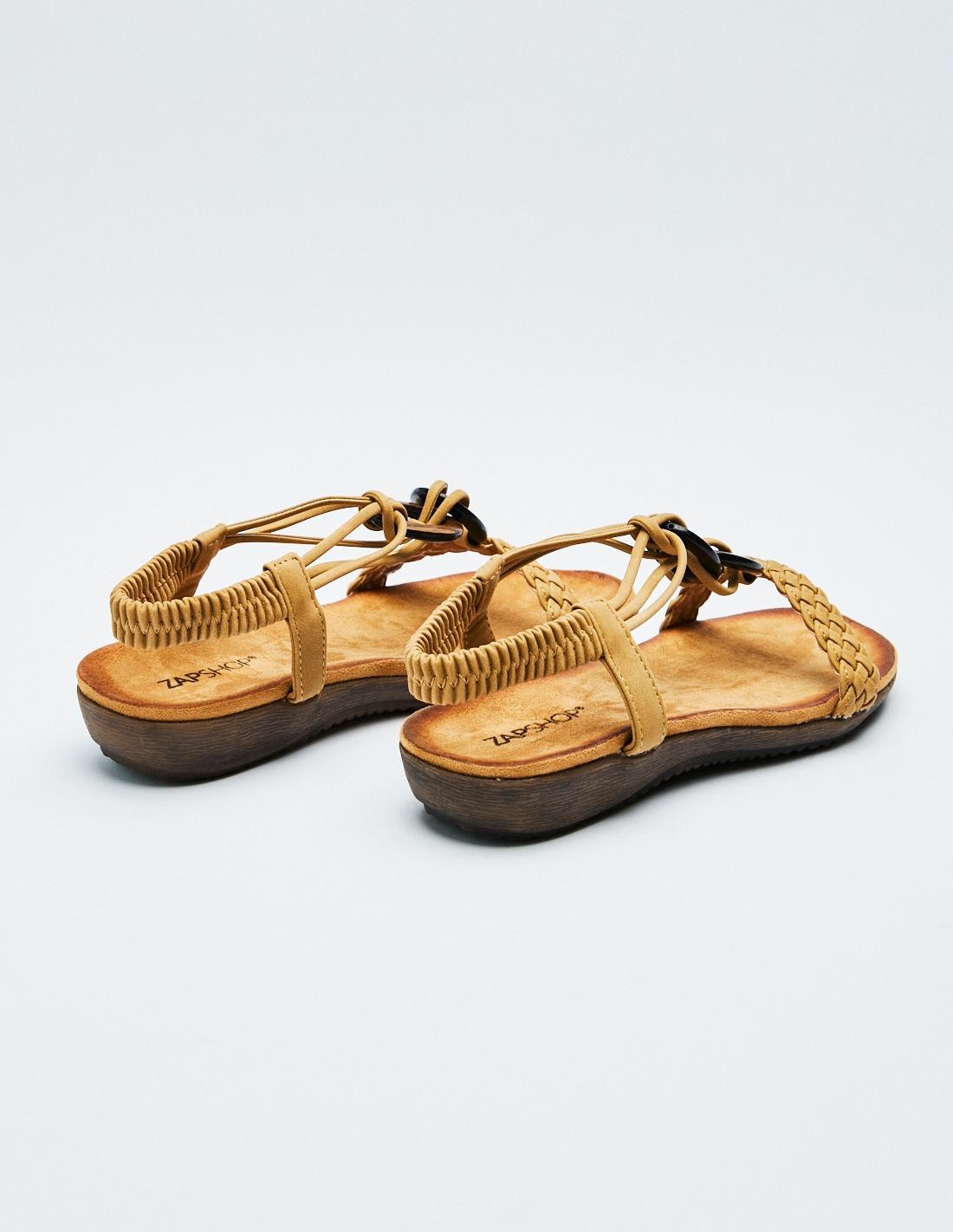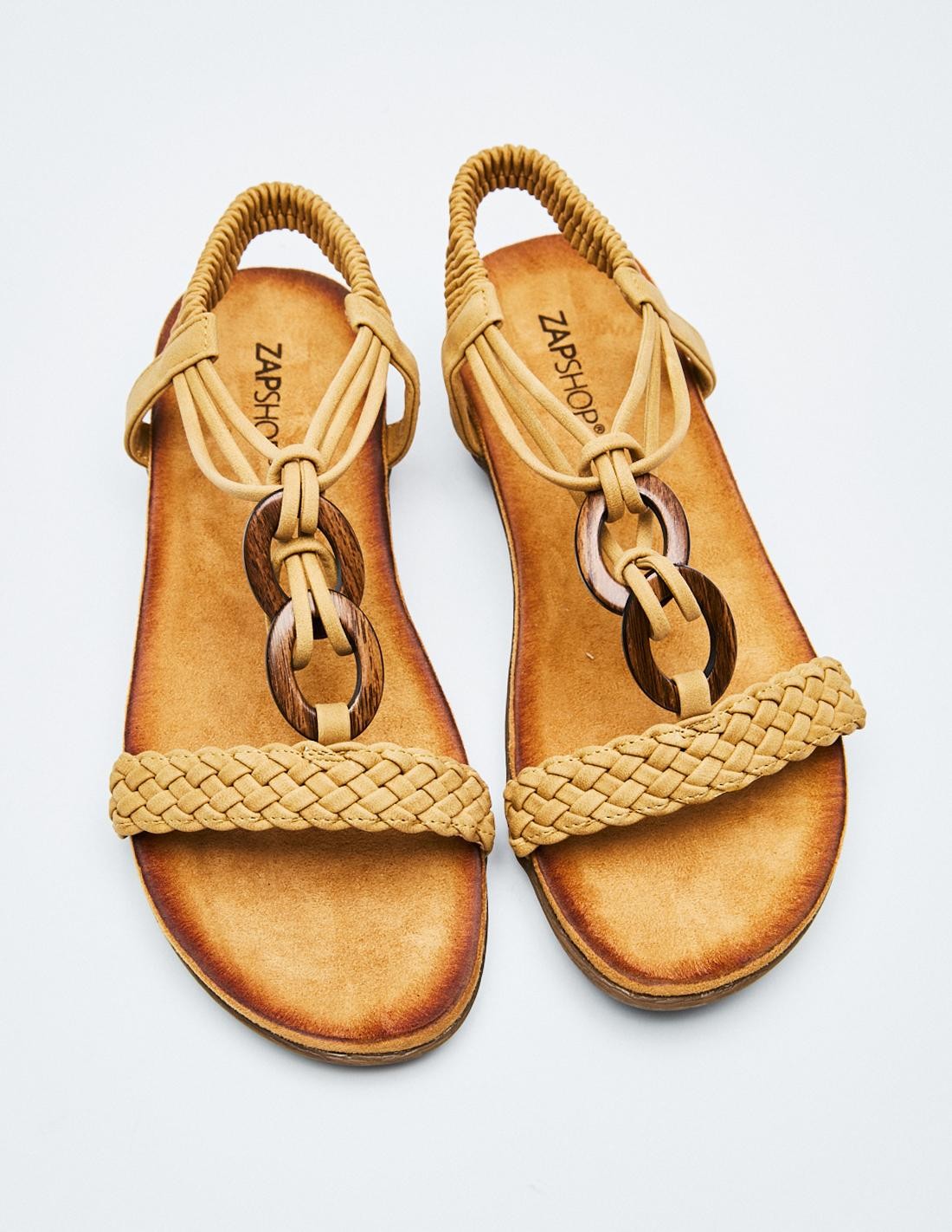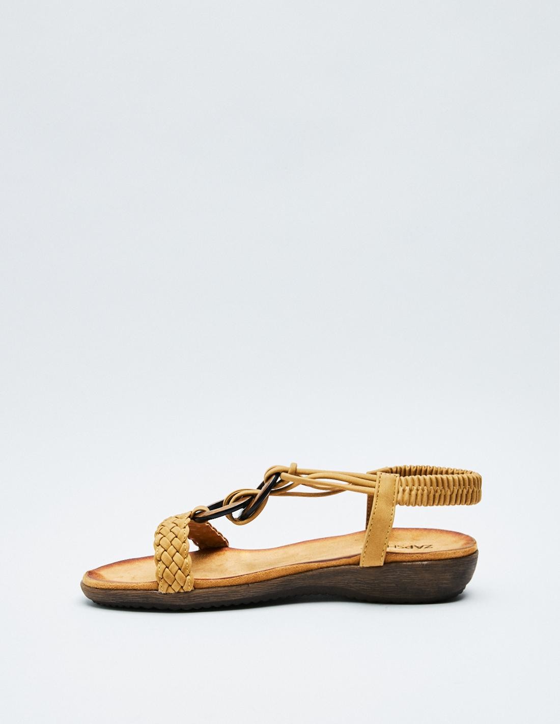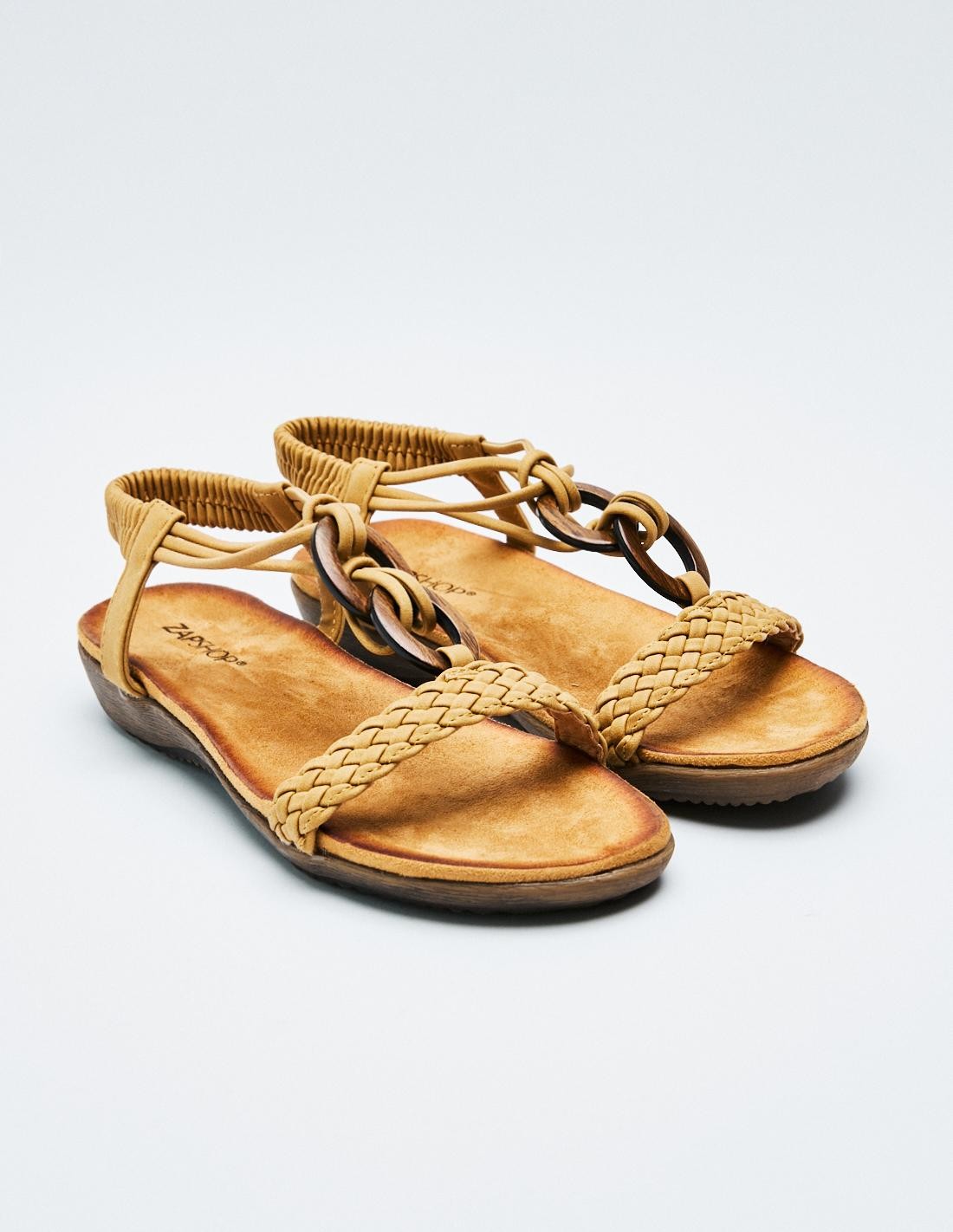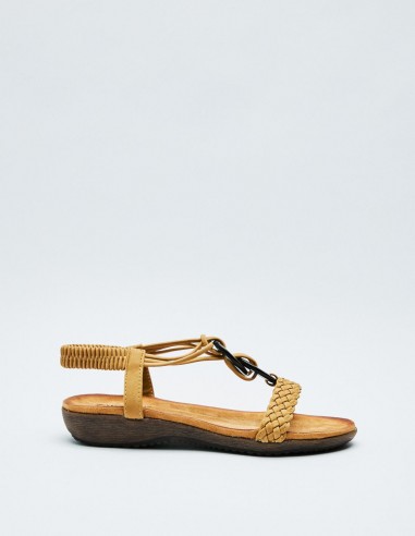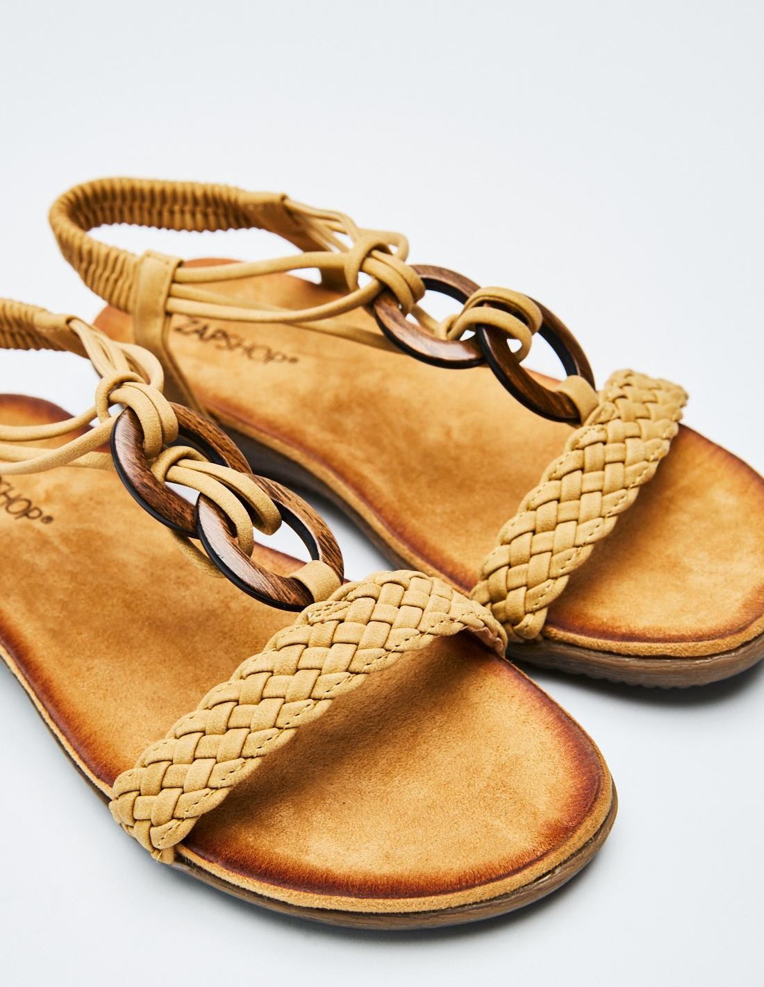 Sandalia plana efcto serraje. Detalle trenzado en la parte delantera. suela plana de goma . Cierre mediante pulsera elastico.