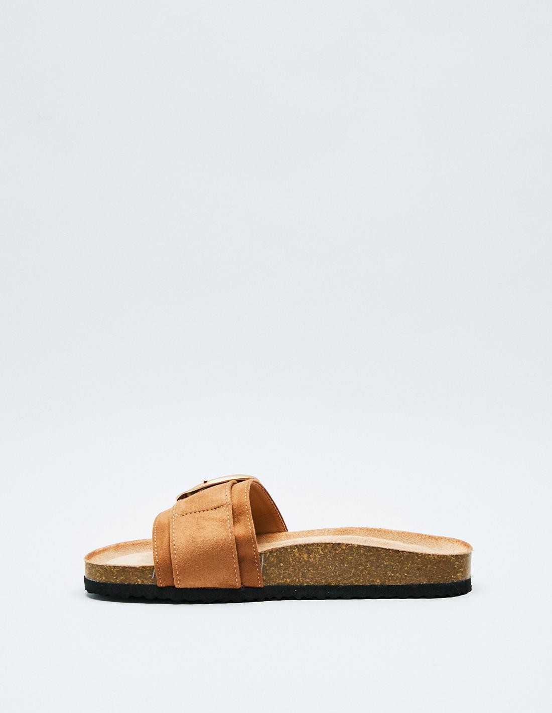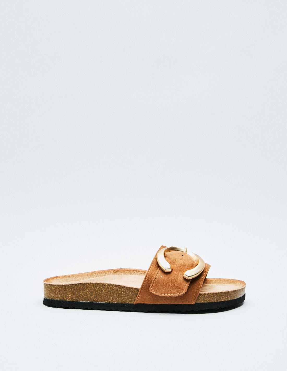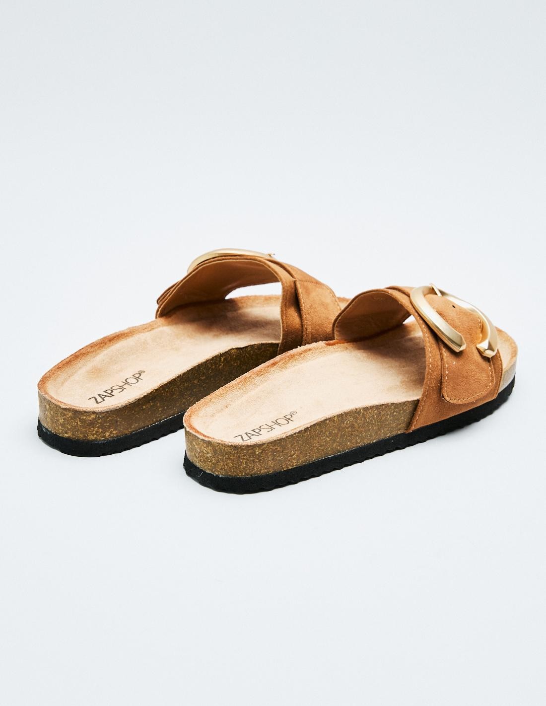 Zapato plano tipo sandalia en efecto serraje. Tira gruesa delantera con hebilla en la parte delantera. Acabado en punta redonda.