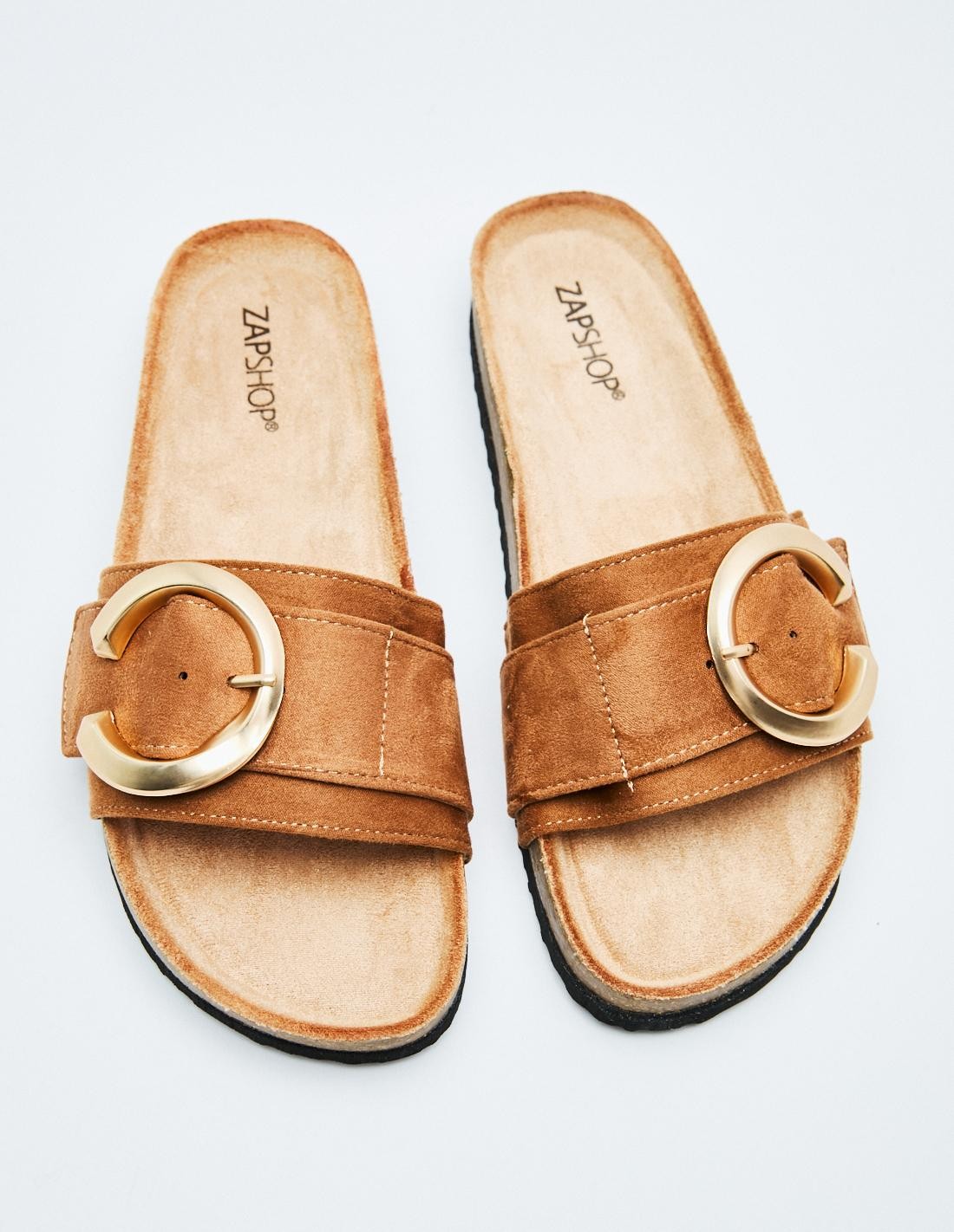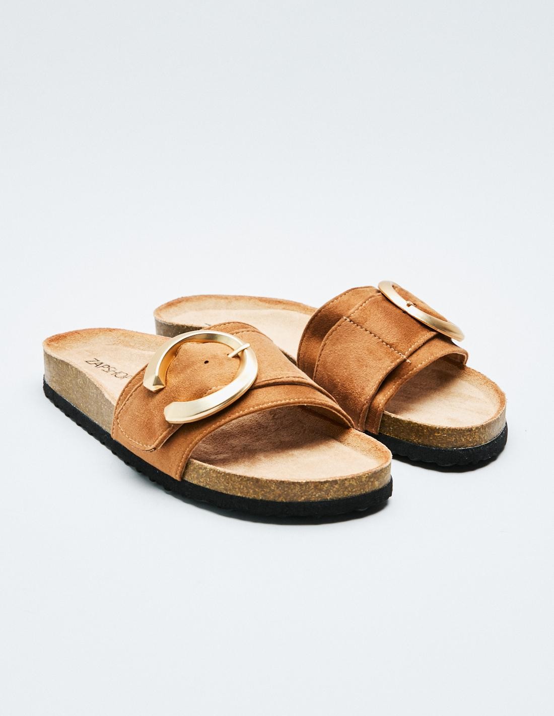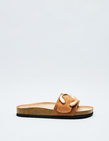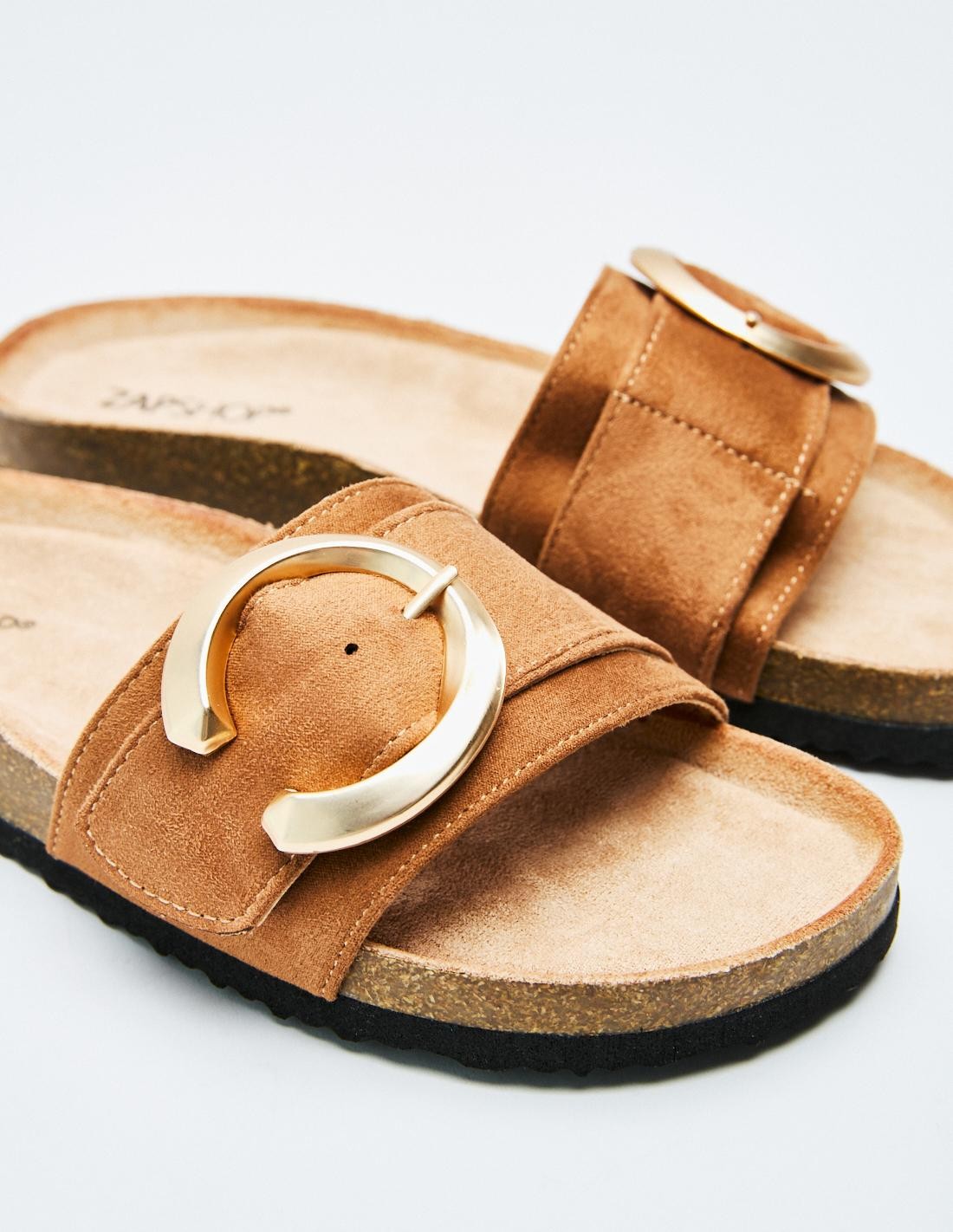 Zapato plano tipo sandalia en efecto serraje. Tira gruesa delantera con hebilla en la parte delantera. Acabado en punta redonda.