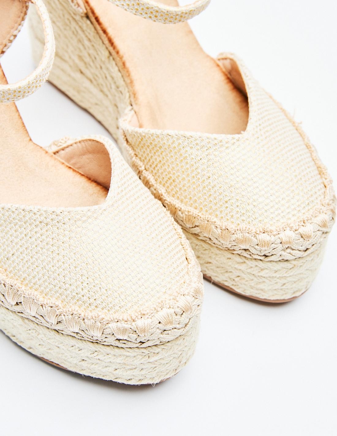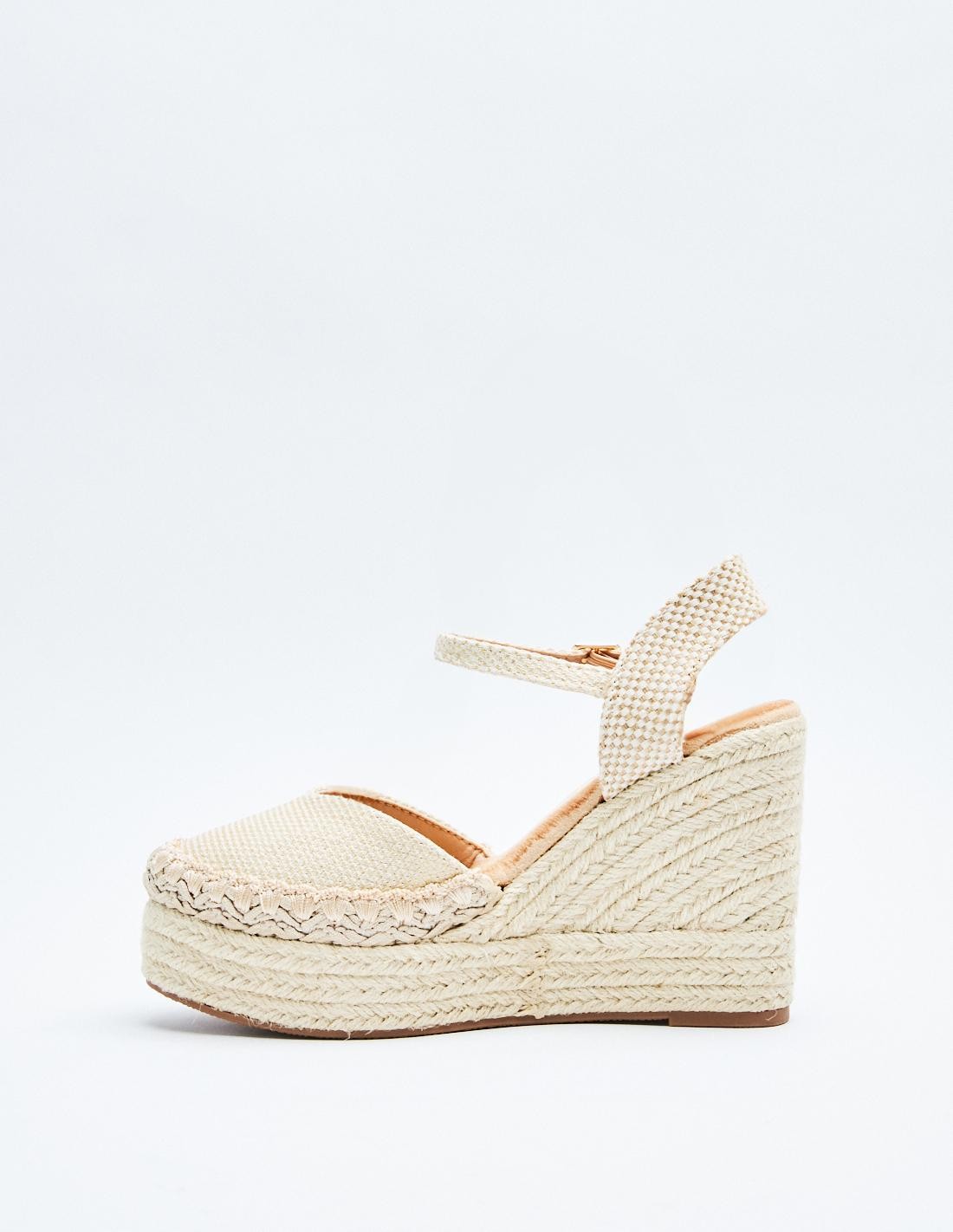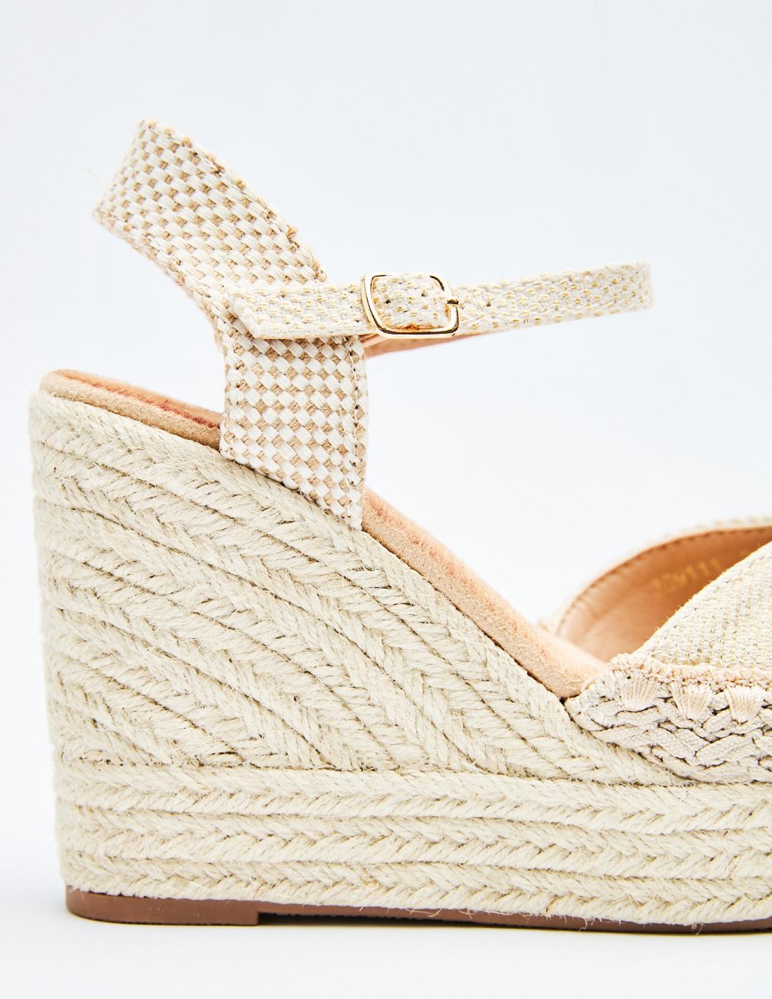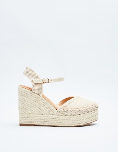 Alpargata tipo cuña con material en efecto serraje y esparto . Suela de yute. Cierre mediante tira con hebilla en la pulsera al tobillo.