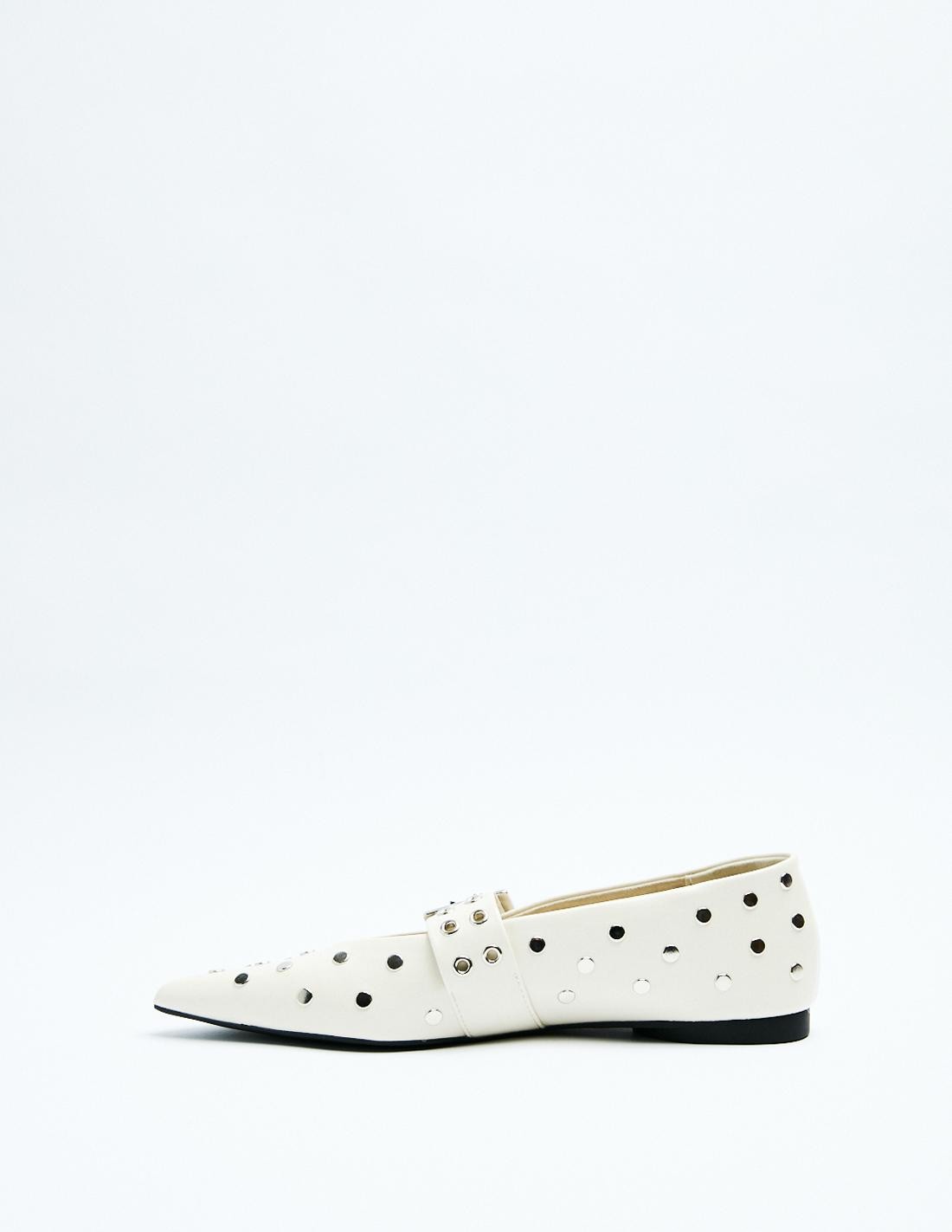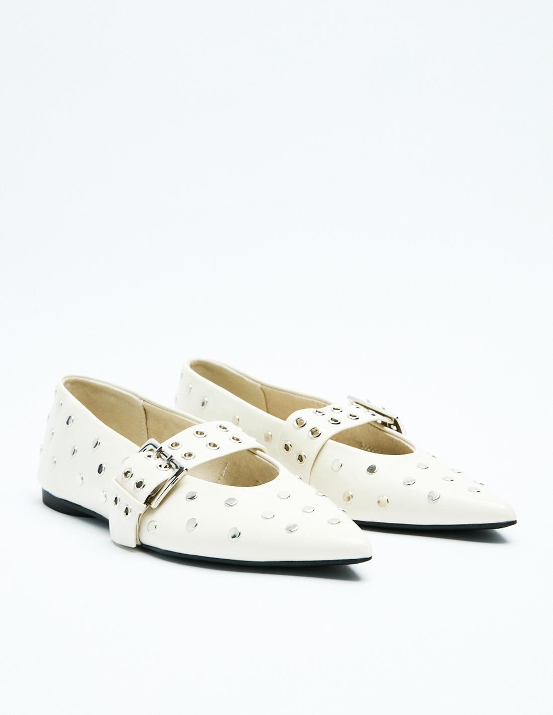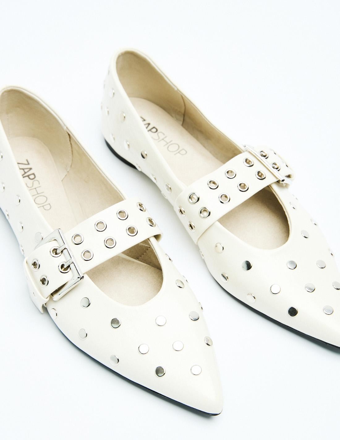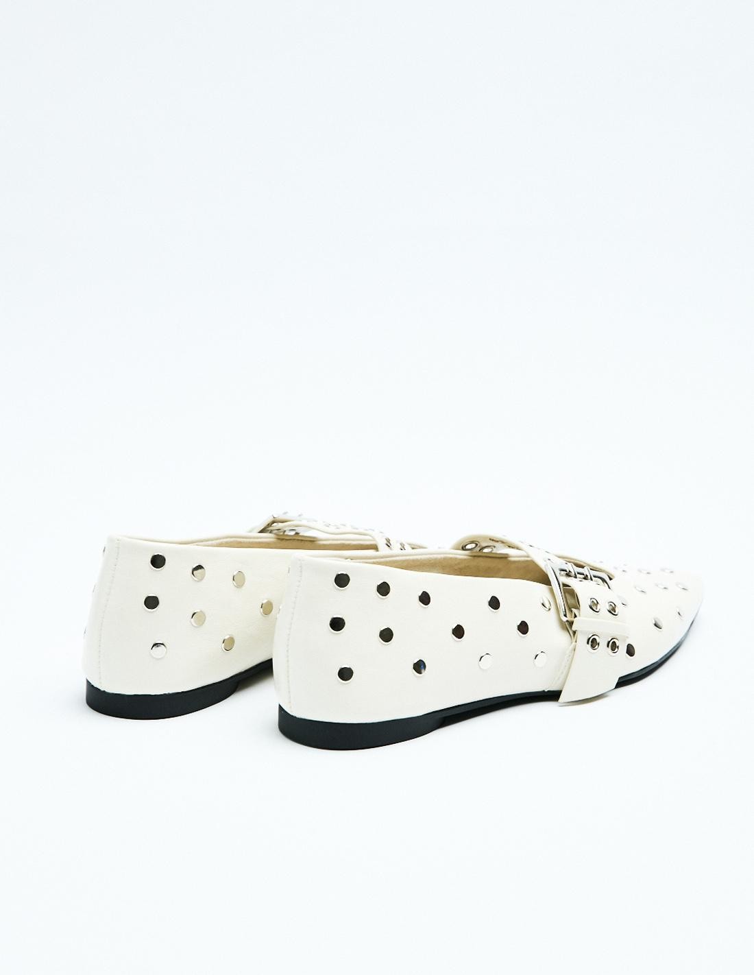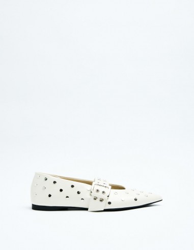Zapato plano tipo bailarina en combinacion de materiales . Detalle de tira ancha con hebilla ajustable en la parte delantera.