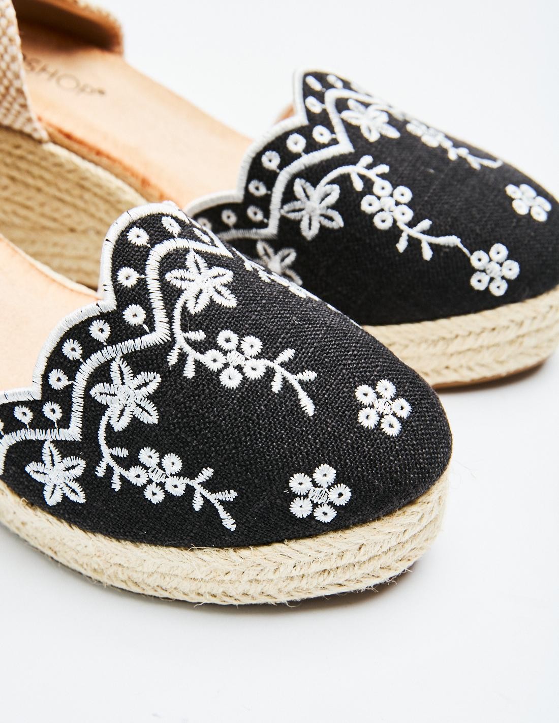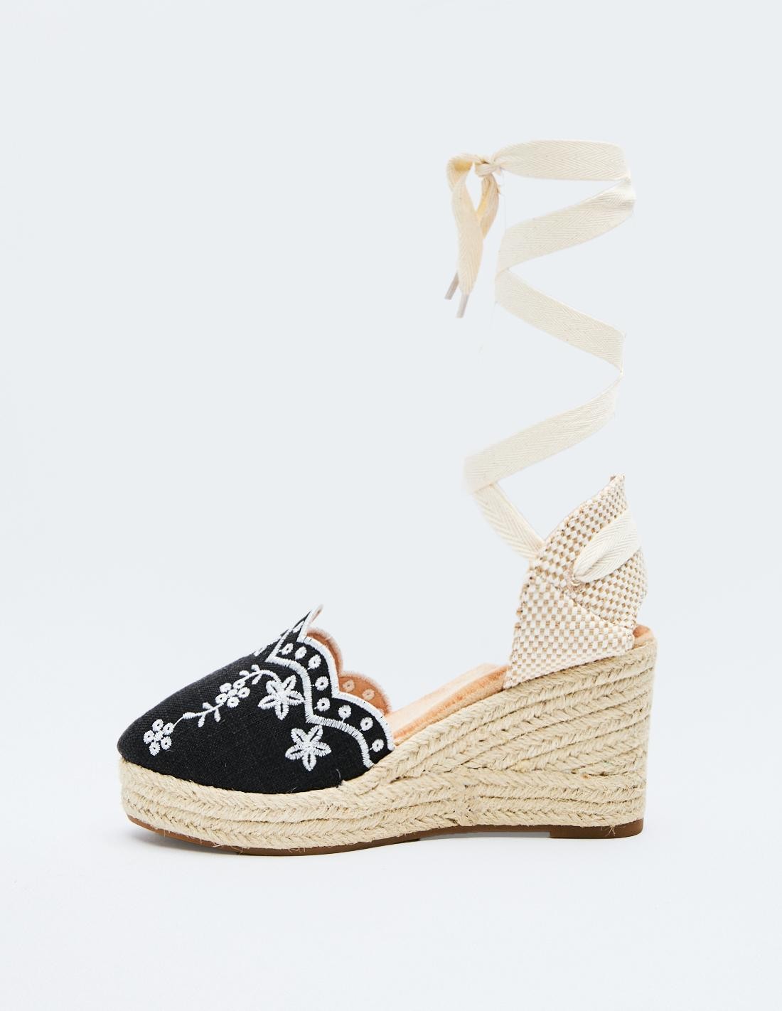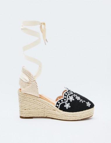 Alpargata tipo cuña con diseño tejido floral. Suela forrada de yute. Cierre mediante cinta a lo largo de la pierna .